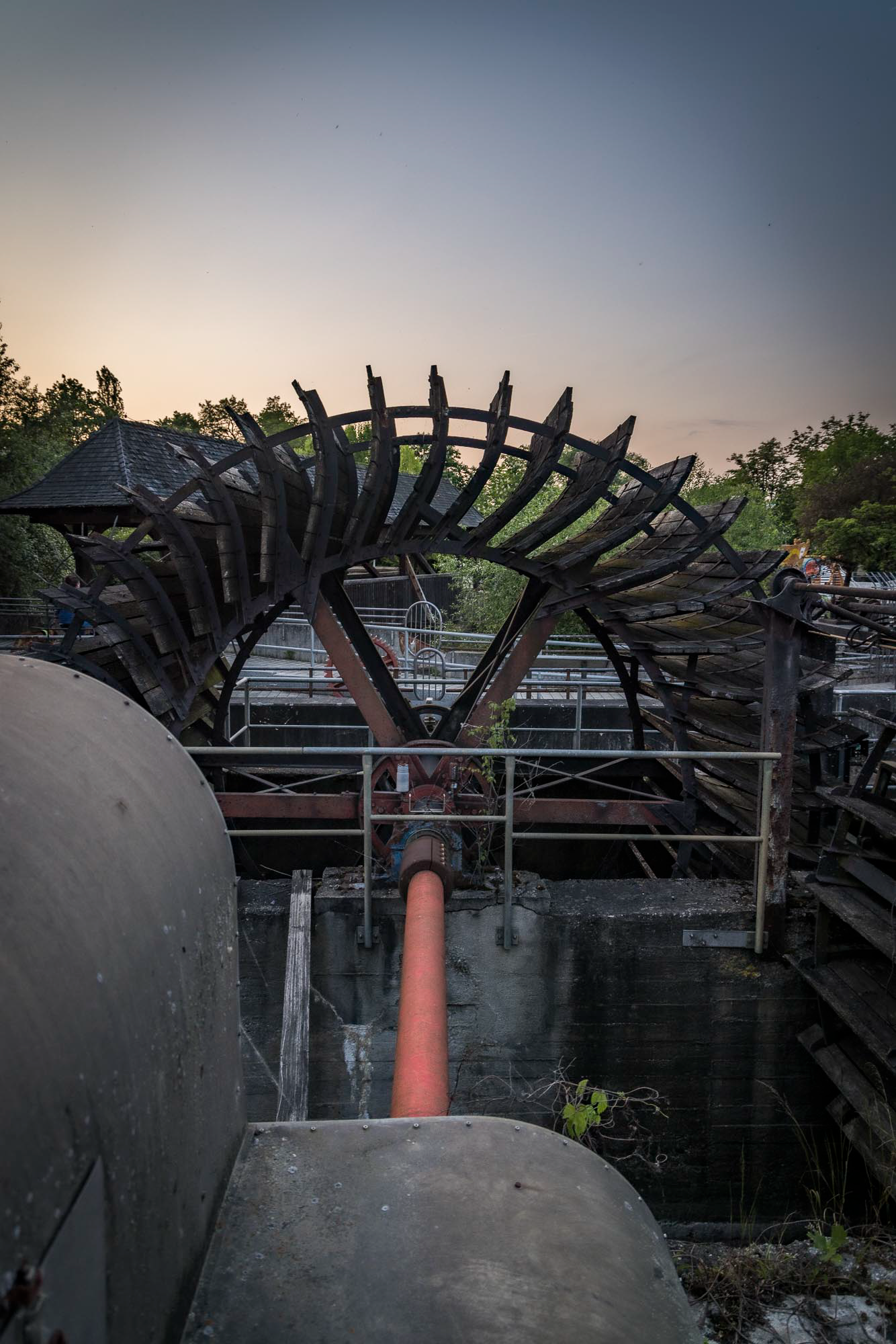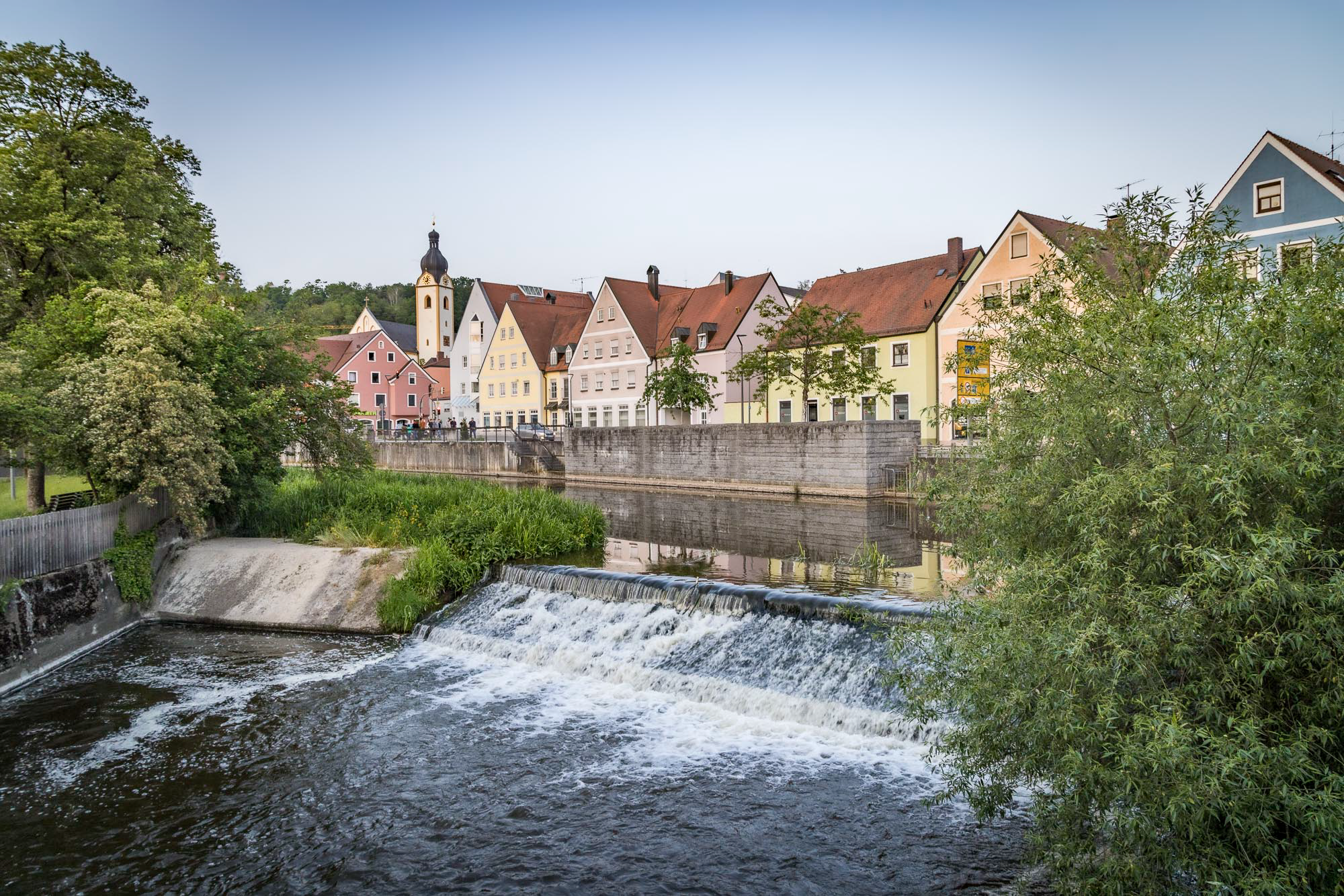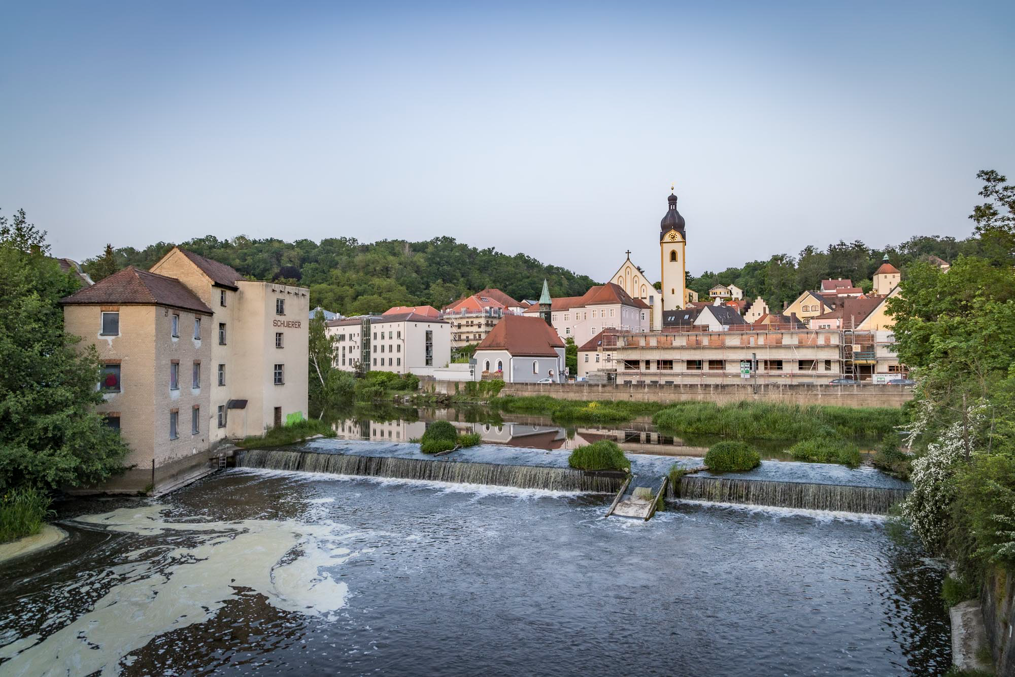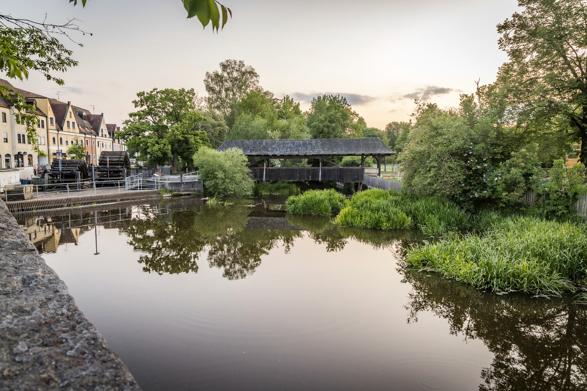 Der Fluss glitzert sanft im Licht der untergehenden Sonne und lädt uns förmlich zu einem entspannten Spaziergang ein. Die imposanten historischen Mühlräder am Übergang zum Stadtpark, der sich auf einer Insel in der Naab befindet, wirken dabei besonders beeindruckend.