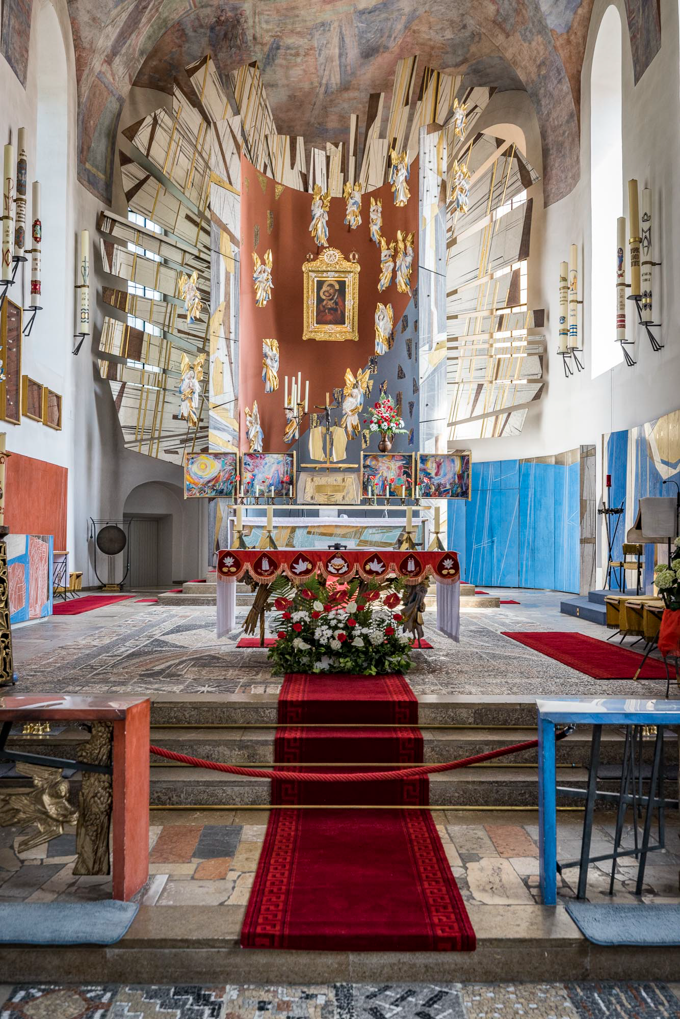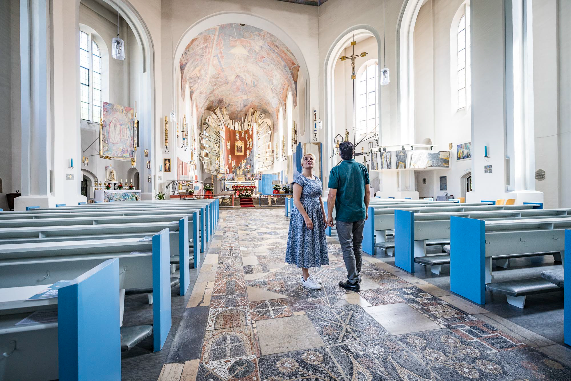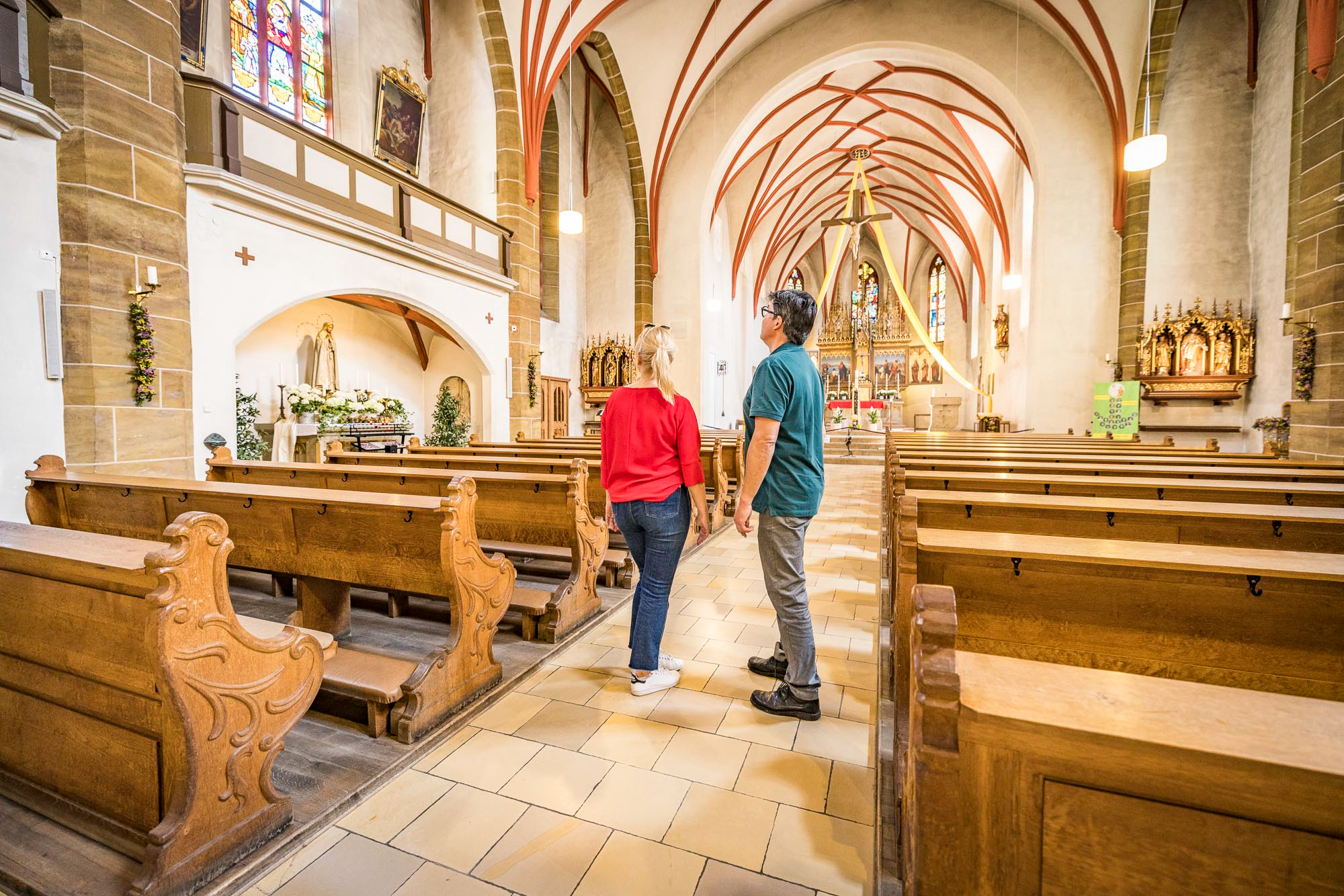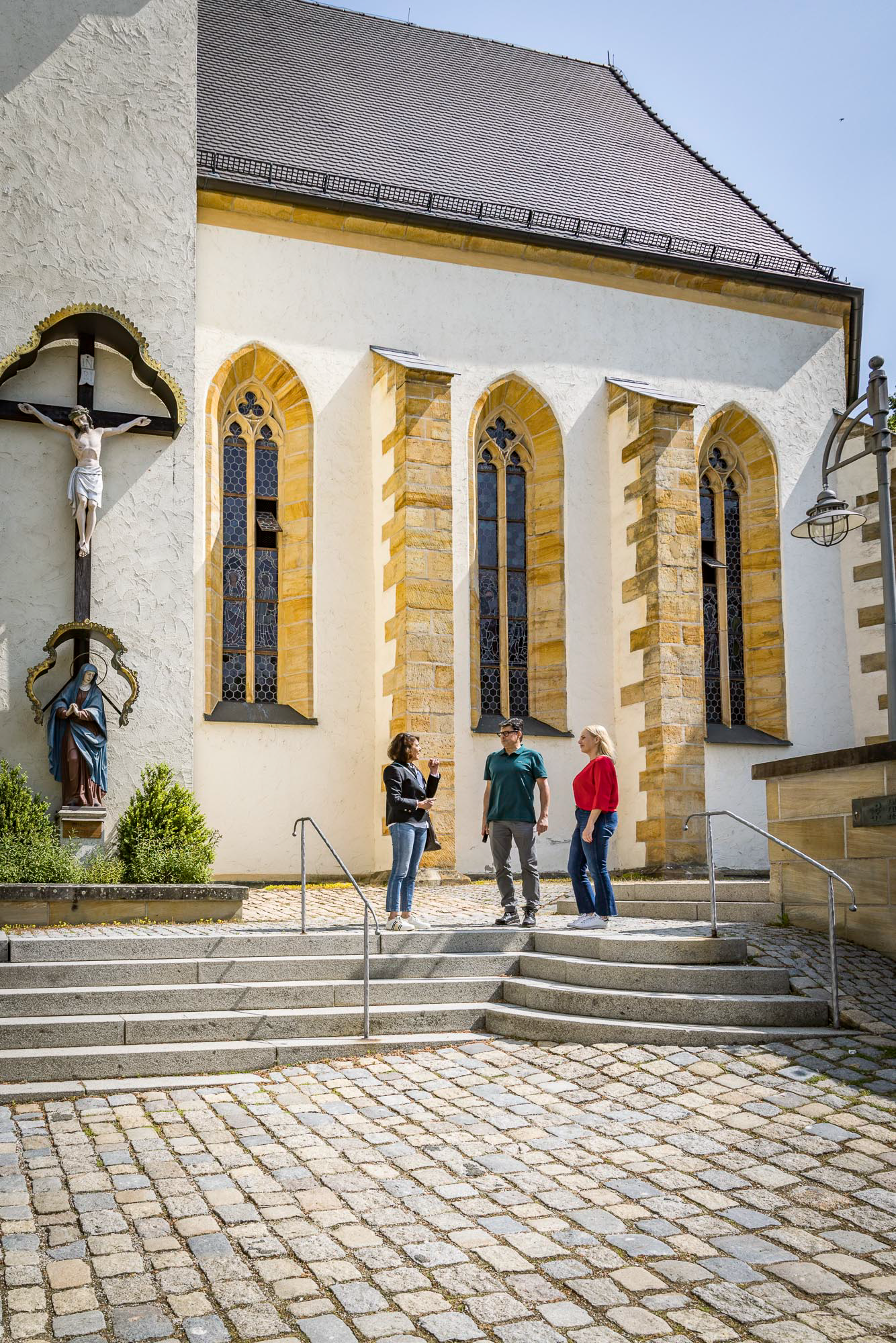 Nachdem wir uns von Anna verabschiedet haben, begeben wir uns zur Katholischen Pfarr- und Klosterkirche »Zu Unserer Lieben Frau vom Kreuzberg«. Der barocke Vorgängerbau wurde 1945 bei einem Bombenangriff vollständig zerstört, und im Jahr 1952 erfolgte der Wiederaufbau in einem modernen Stil.