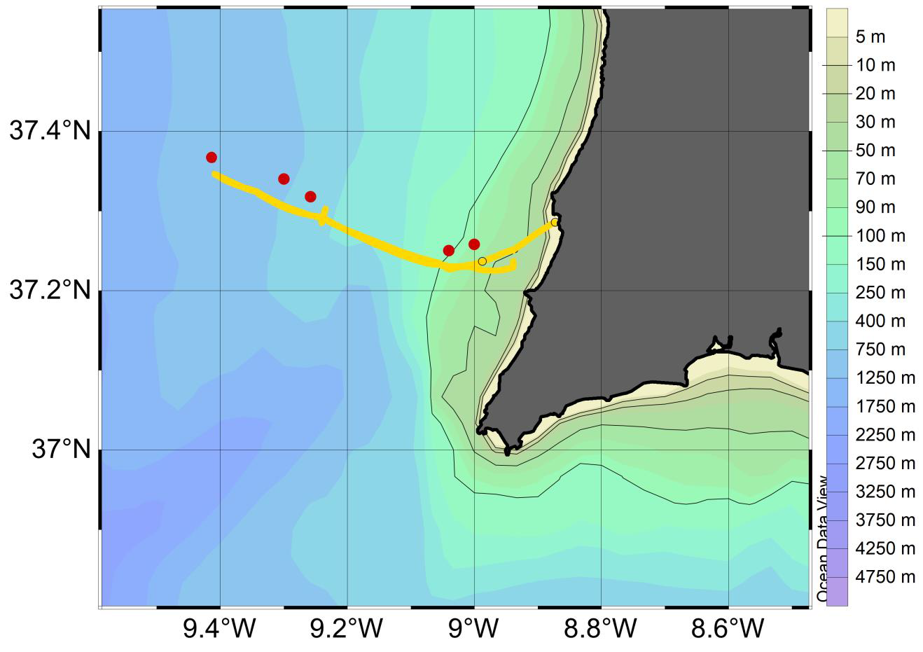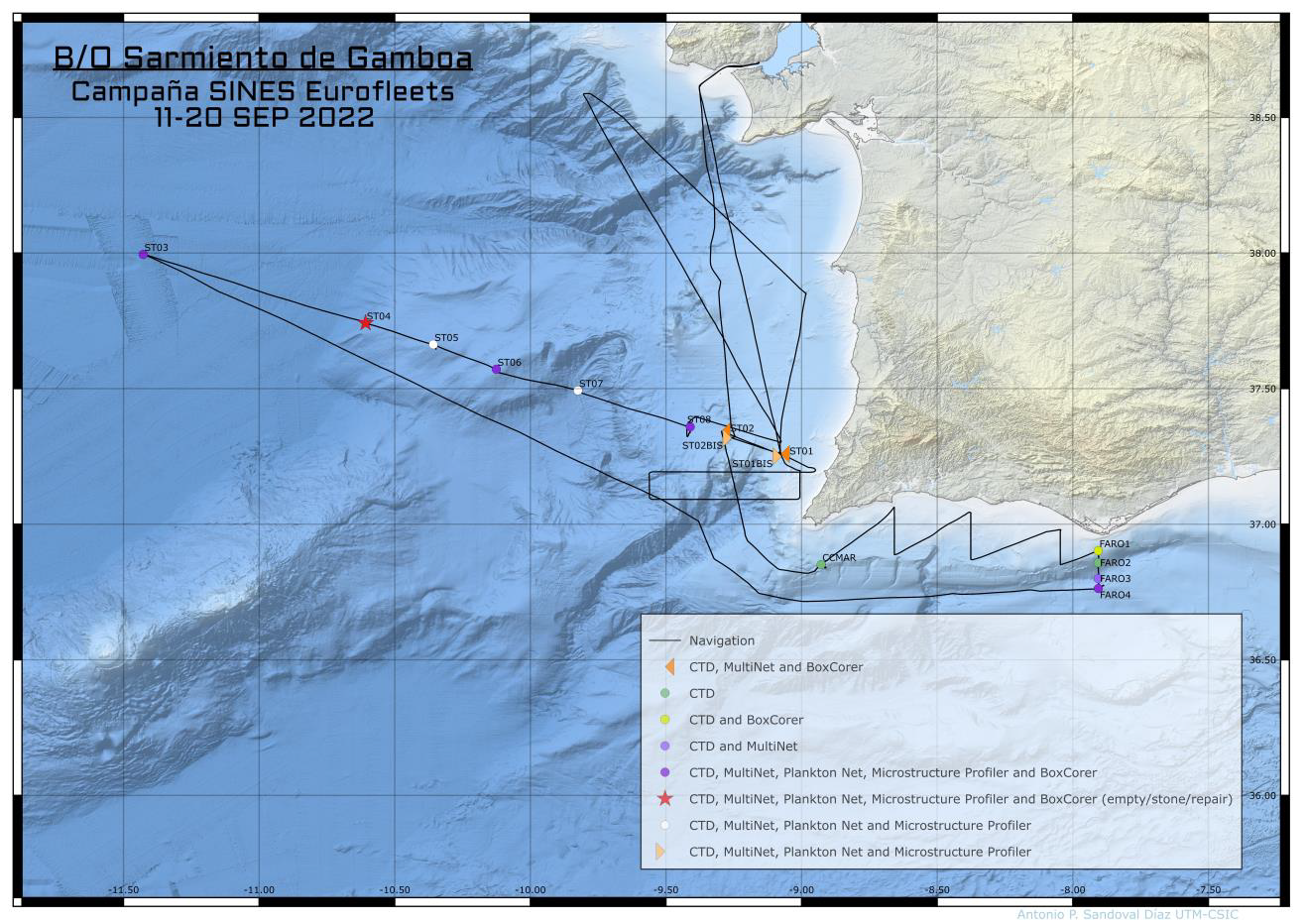 Preliminary Results: Full depth water column CTD profiles were collected at all the stations (15 stations, 19 CTD casts, i.e., four stations with double cast -shallow and deep-). In 12 stations, a vertical multinet haul was also collected. The depth of the multinet samples (100 µm mesh) range between 700 m and surface. A deployment of a Light Autonomous Underwater Vehicle (LAUV Explore-4) was done on 17-18th of September. The AUV conducted more than 100 high-resolution immersion profiles between the surface and 10/50/100 m depth following the track of the research vessel between the coast and the position 37.35ºN 9.4ºW.