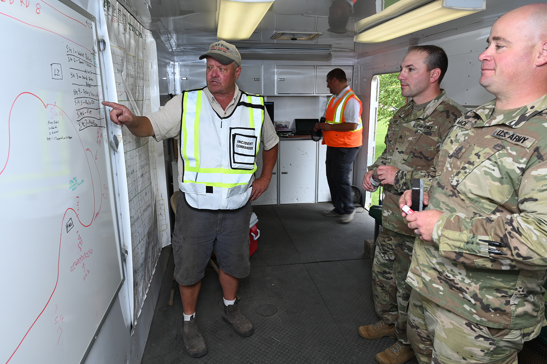 Sgt. 1st Class Benji Boll, 188th Engineer Company, discusses search and rescue plans with Jason Sletten, assistant fire chief for Hatton, N.D. at Golden Lake Recreation Area and Resort, in Steele County on August 5.