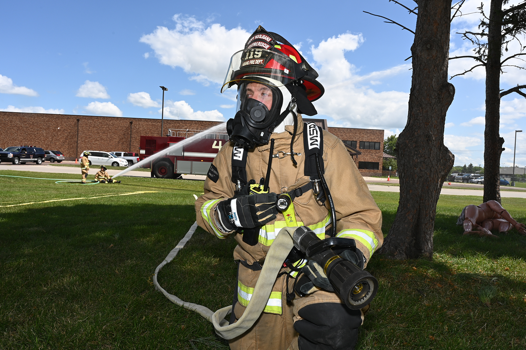 Staff Sgt. Tyler Wangler holds a fire hose as he arrives at the scene of a simulated fire during a training exercise at the North Dakota Air National Guard Base in Fargo on August 2.