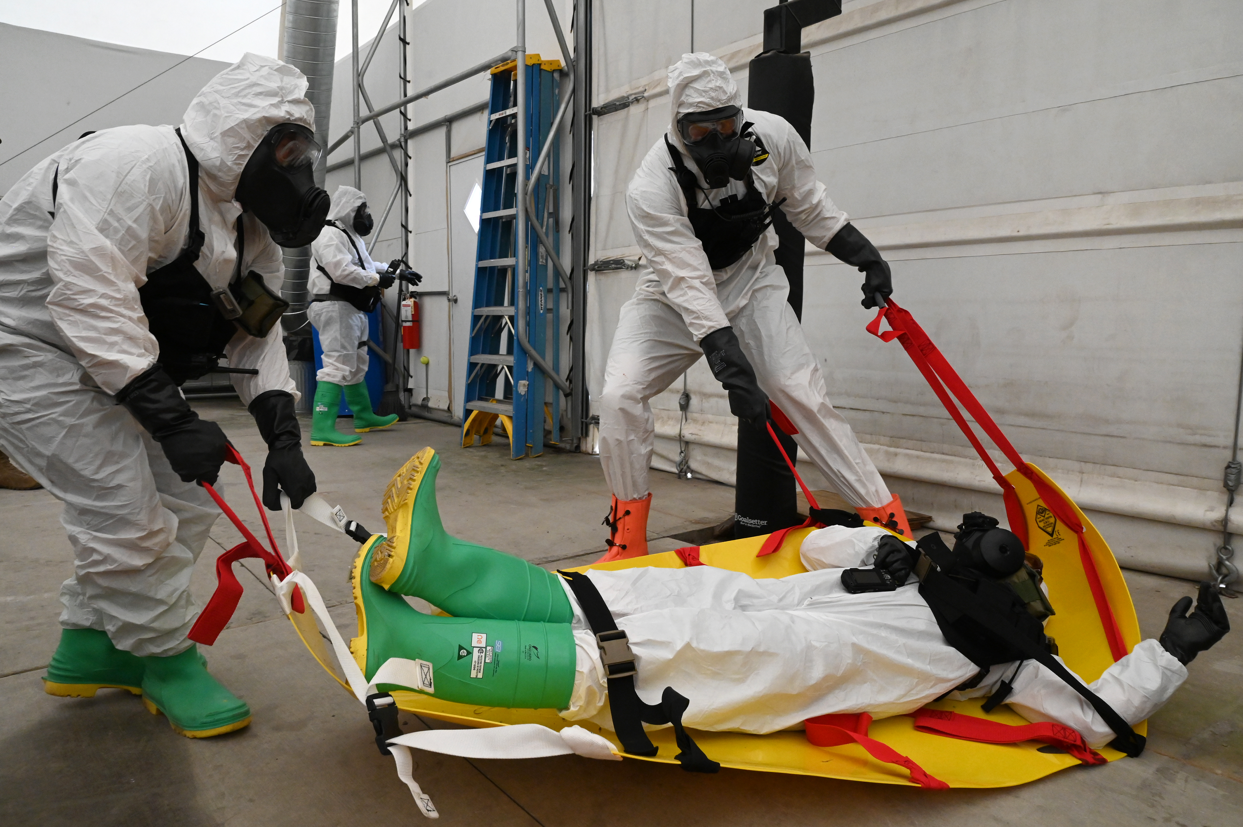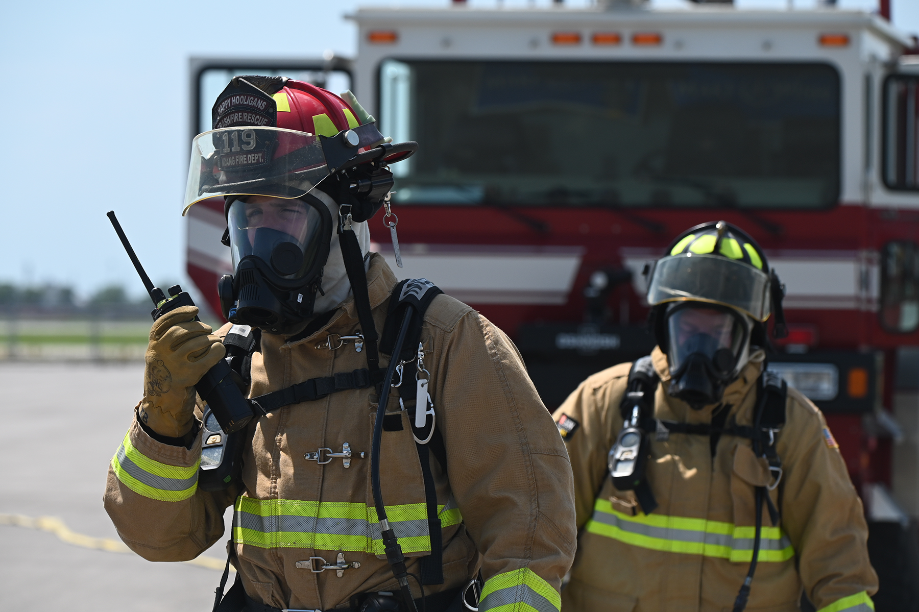 Firefighters of the 119th Wing respond to an exercise alarm during unit training assembly at the North Dakota Air National Guard Base in Fargo on August 2.