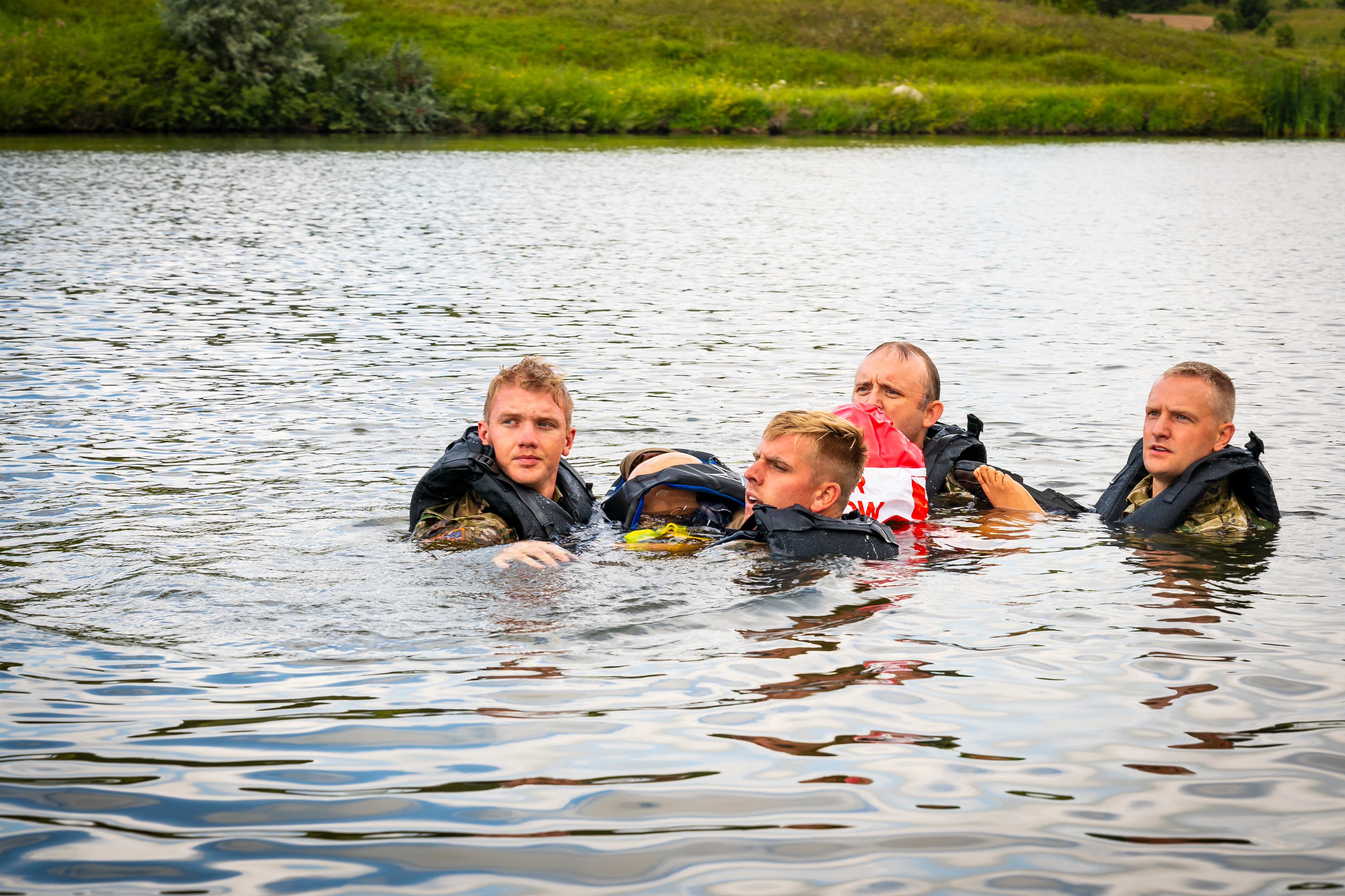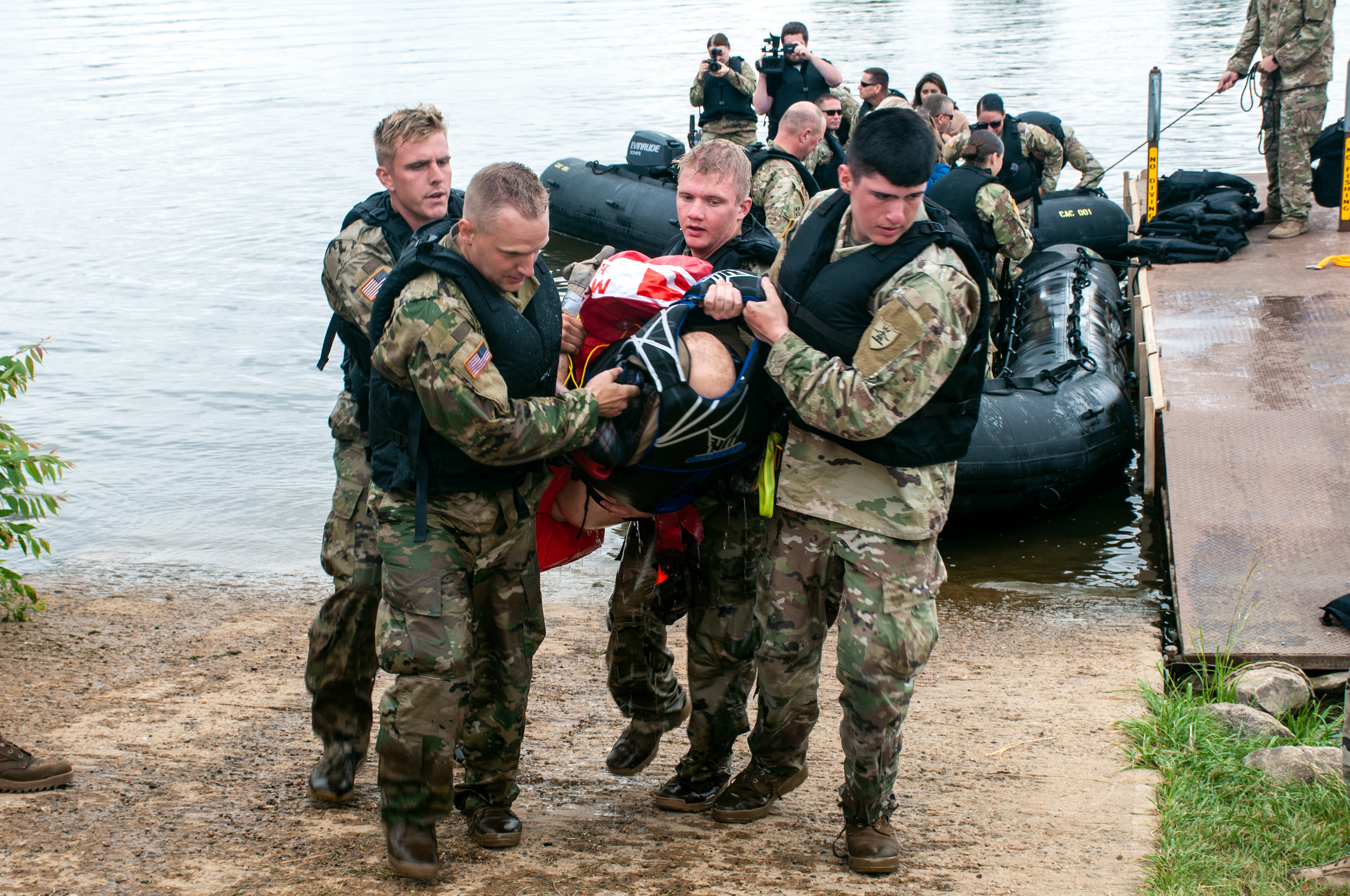 Soldiers of the 957th Engineer Company retrieve a casualty mannequin from Crown Butte Dam during search and rescue exercise with the Morton County Sheriff's Department on August 5.
