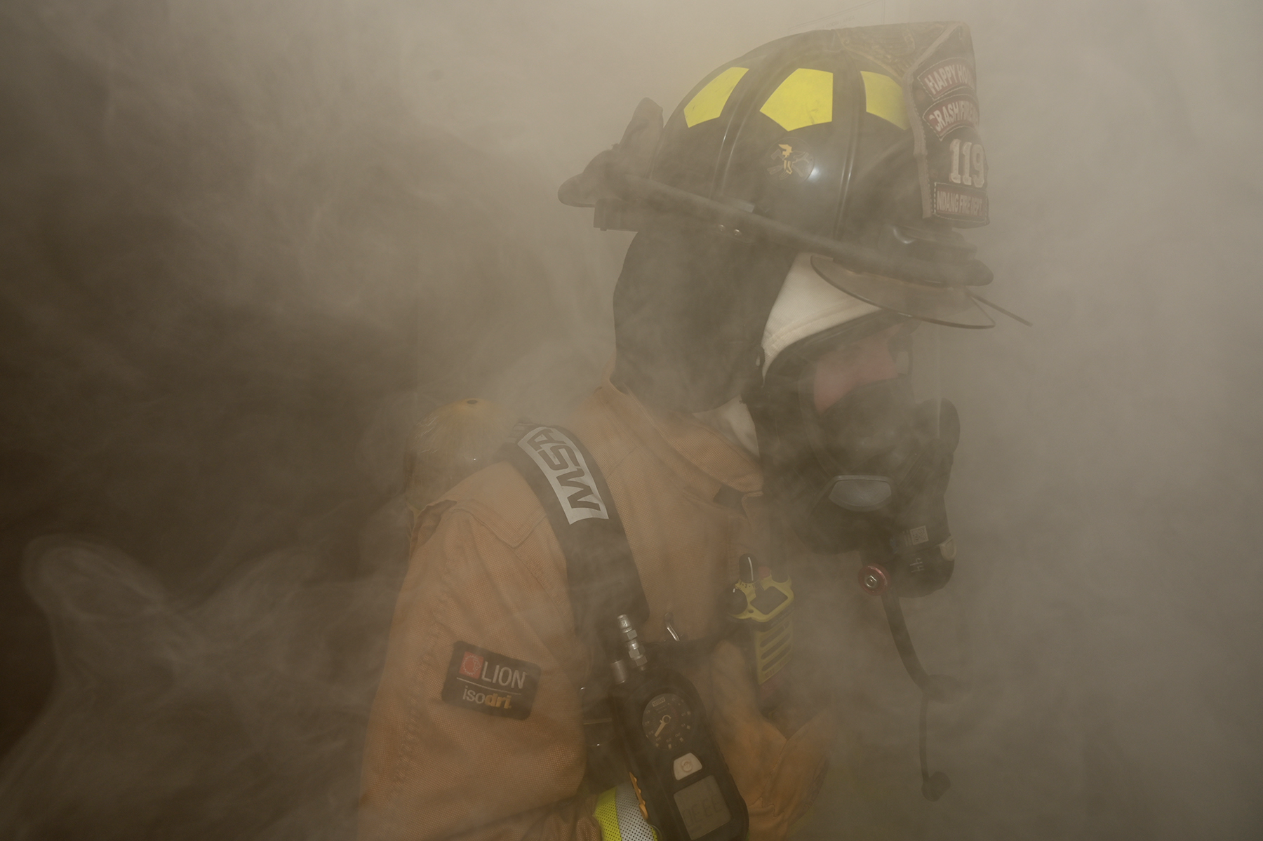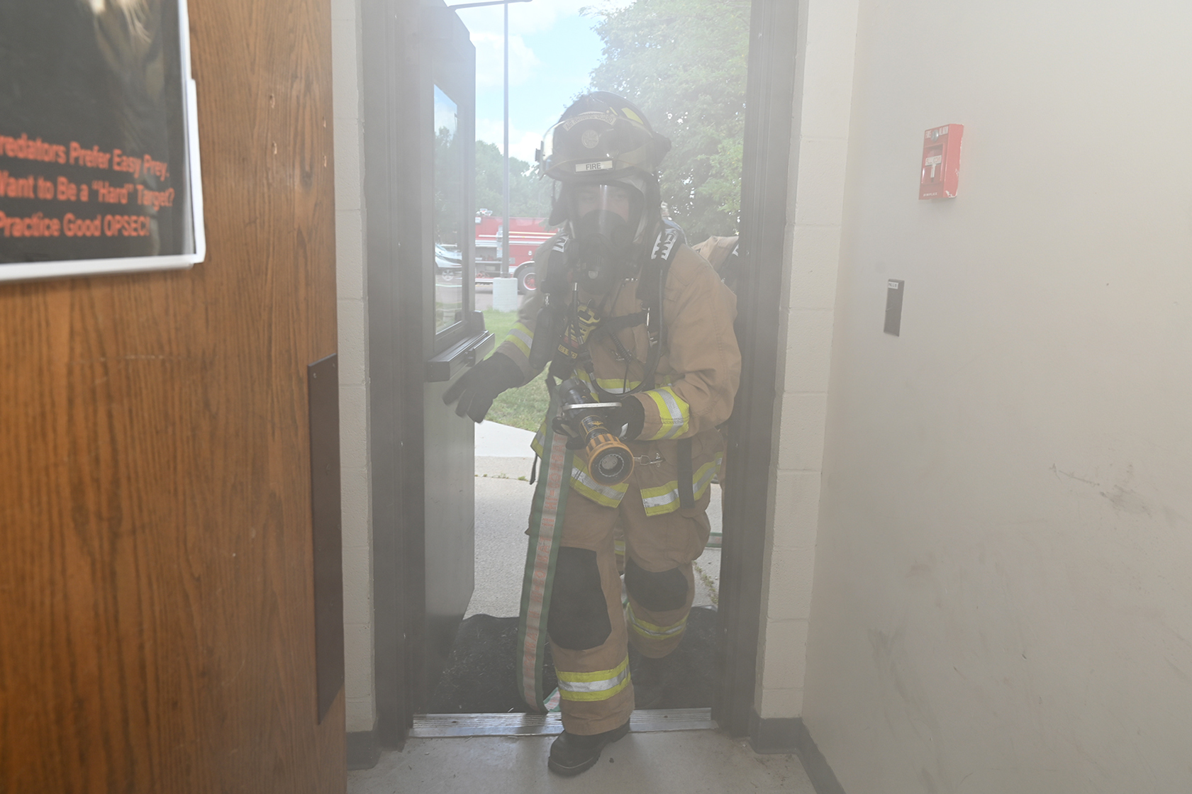 The 119th Civil Engineer Squadron conducted firefighter training at the N.D. Air National Guard Base in Fargo on August 2, 2020. Training included responding to a simulated fire alarm while people try to distract the firefighters. The smoke is created by a fog machine for the purpose of realistic training as the firefighters enter the building to search for simulated victims. (U.S. Air National Guard story and photos by Chief Master Sgt. David H Lipp)