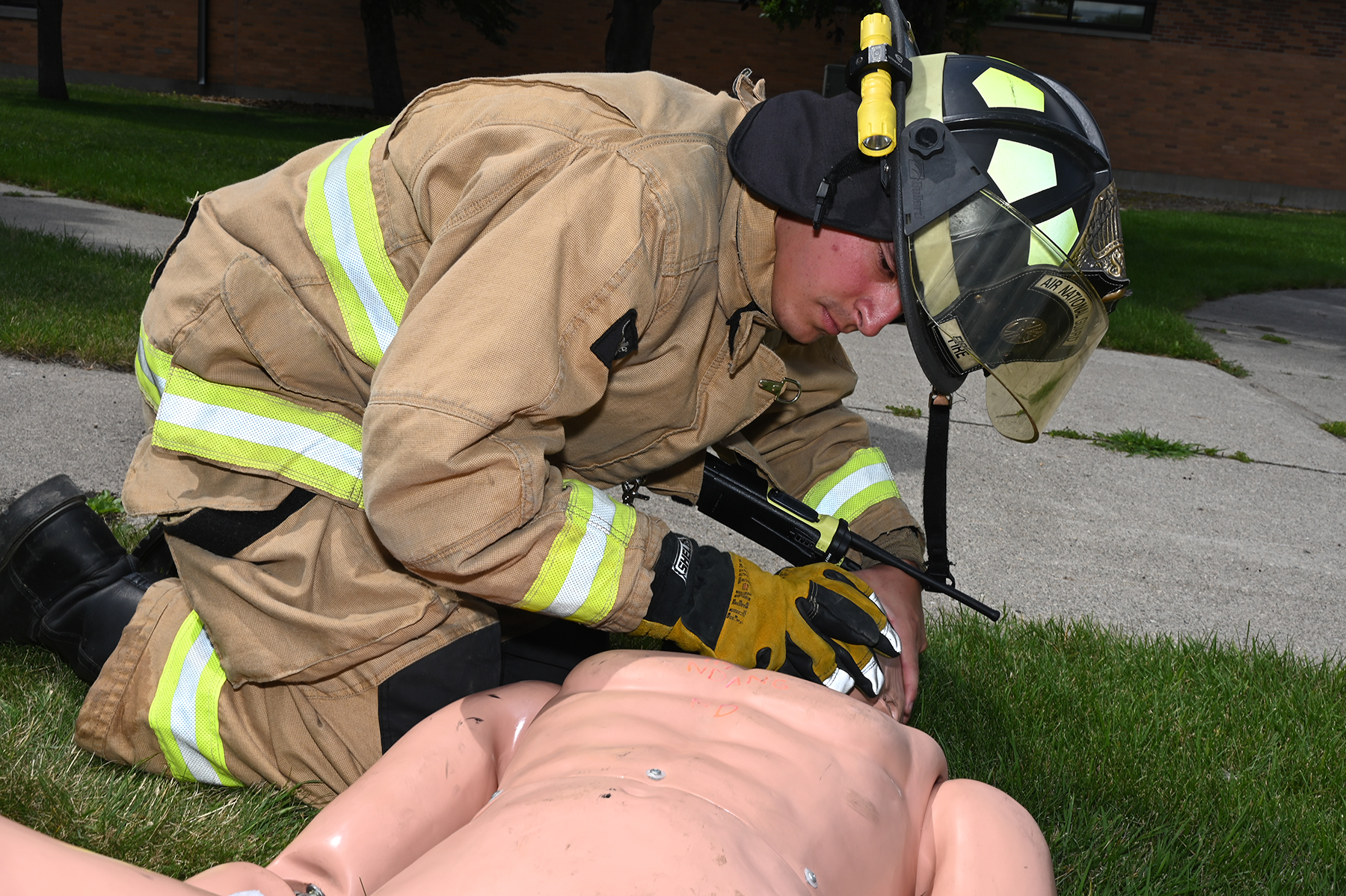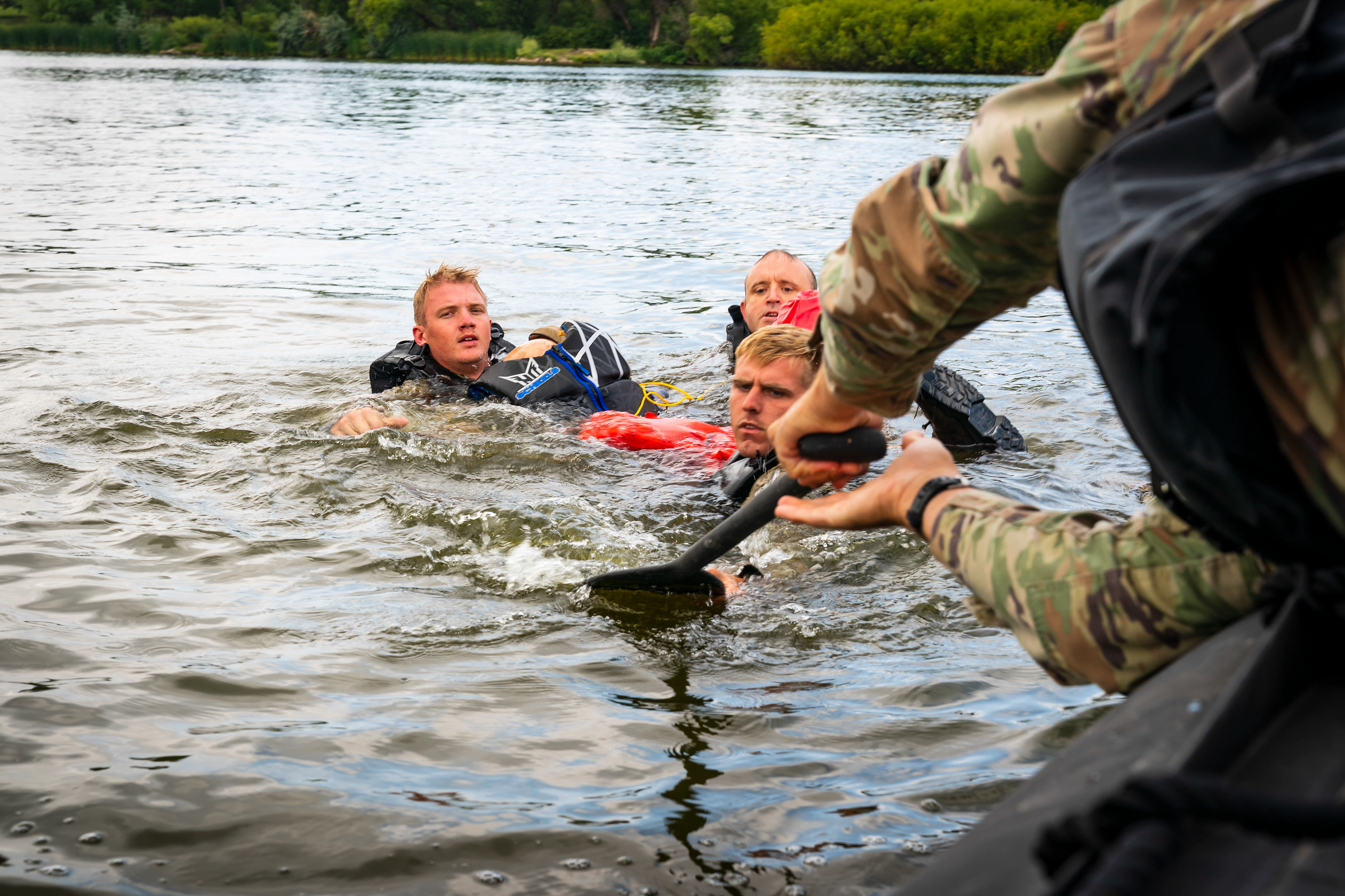 Staff Sgt. Kerry Thompson, a combat medic with the 141st Maneuver Enhancement Brigade, assists Hatton, N.D. firefighters with search and rescue during exercise Vigilant Guard 2020 at Golden Lake on August 5.