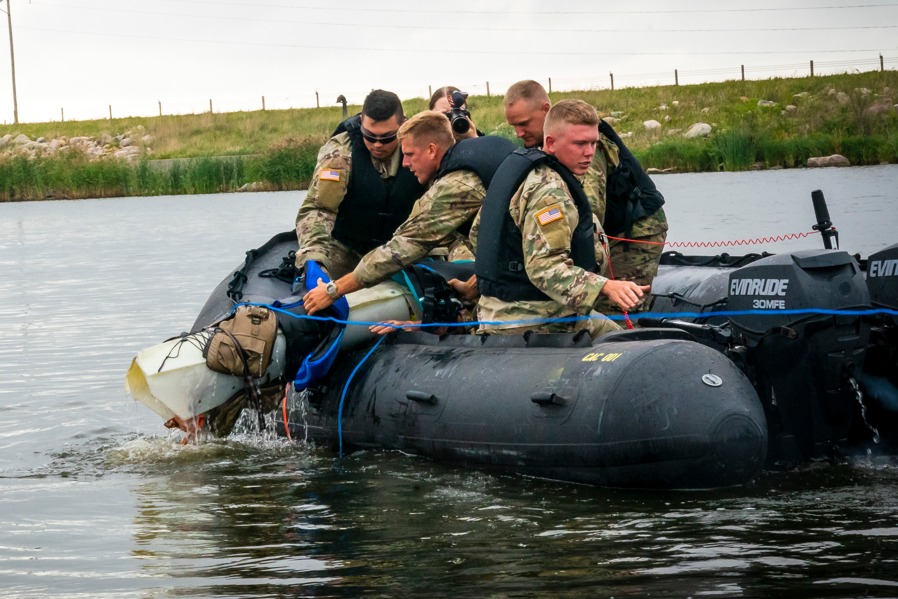 Soldiers of the 957th Engineer Company unload a Zodiac inflatable raft at Crown Butte Dam in preparation of a water search and rescue exercise with Morton County authorities on August 5.