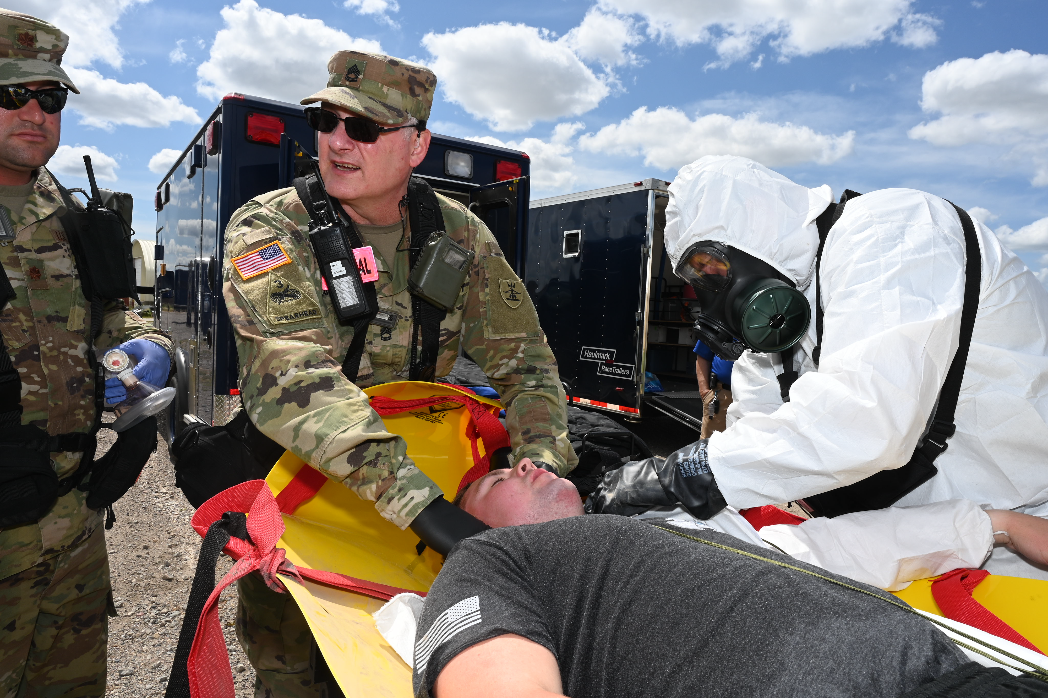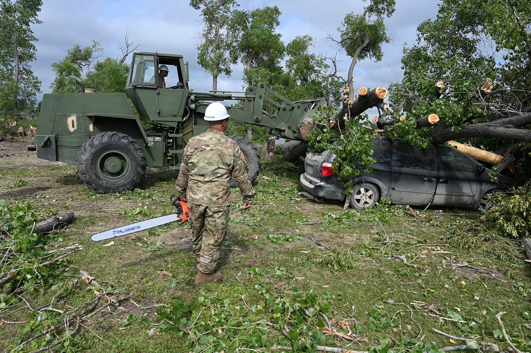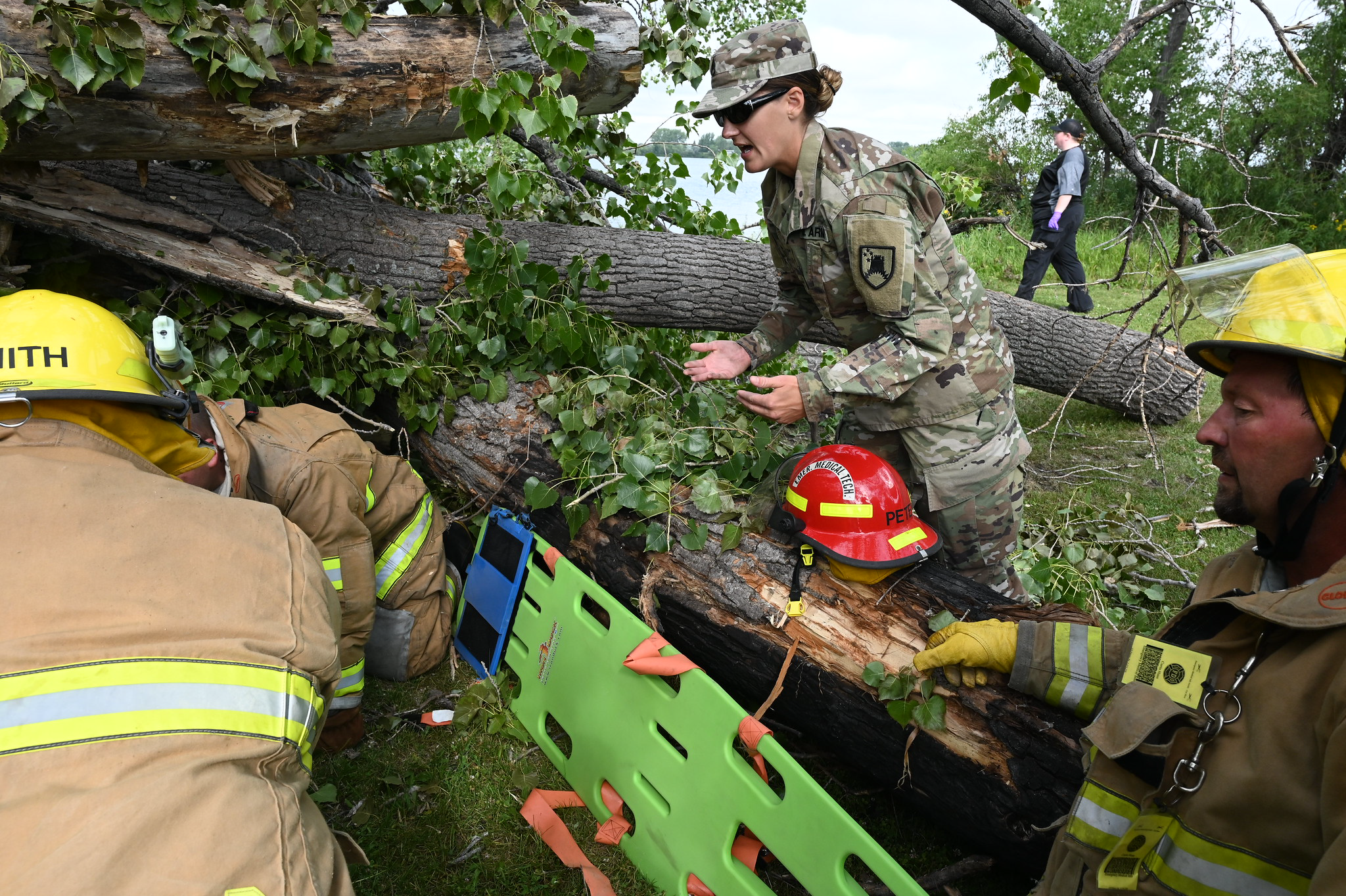 The N.D. National Guard (NDNG) partnered with several civilian agencies state-wide in a joint exercise called Vigilant Guard 2020. The exercise was conducted August 3 - 6 in areas across the state. The NDNG regularly conducts emergency response exercise scenarios to help develop, validate, and refine plans and capabilities. These exercises ensure the NDNG is ready to support real-world disaster and emergency operations for our state and communities. When ordered by the governor in response to requests through the N.D. Department of Emergency Services, the NDNG is the first military responder during a natural disaster or emergency within the state. Top photo: Pvt. Seth Horn, 188th Engineer Company, removes tree limbs that are blocking rescue access to a simulated victim during exercise Vigilant Guard 2020 at Golden Lake on Aug. 5, 2020. (U.S. Air National Guard photo by Chief Master Sgt. David H Lipp)