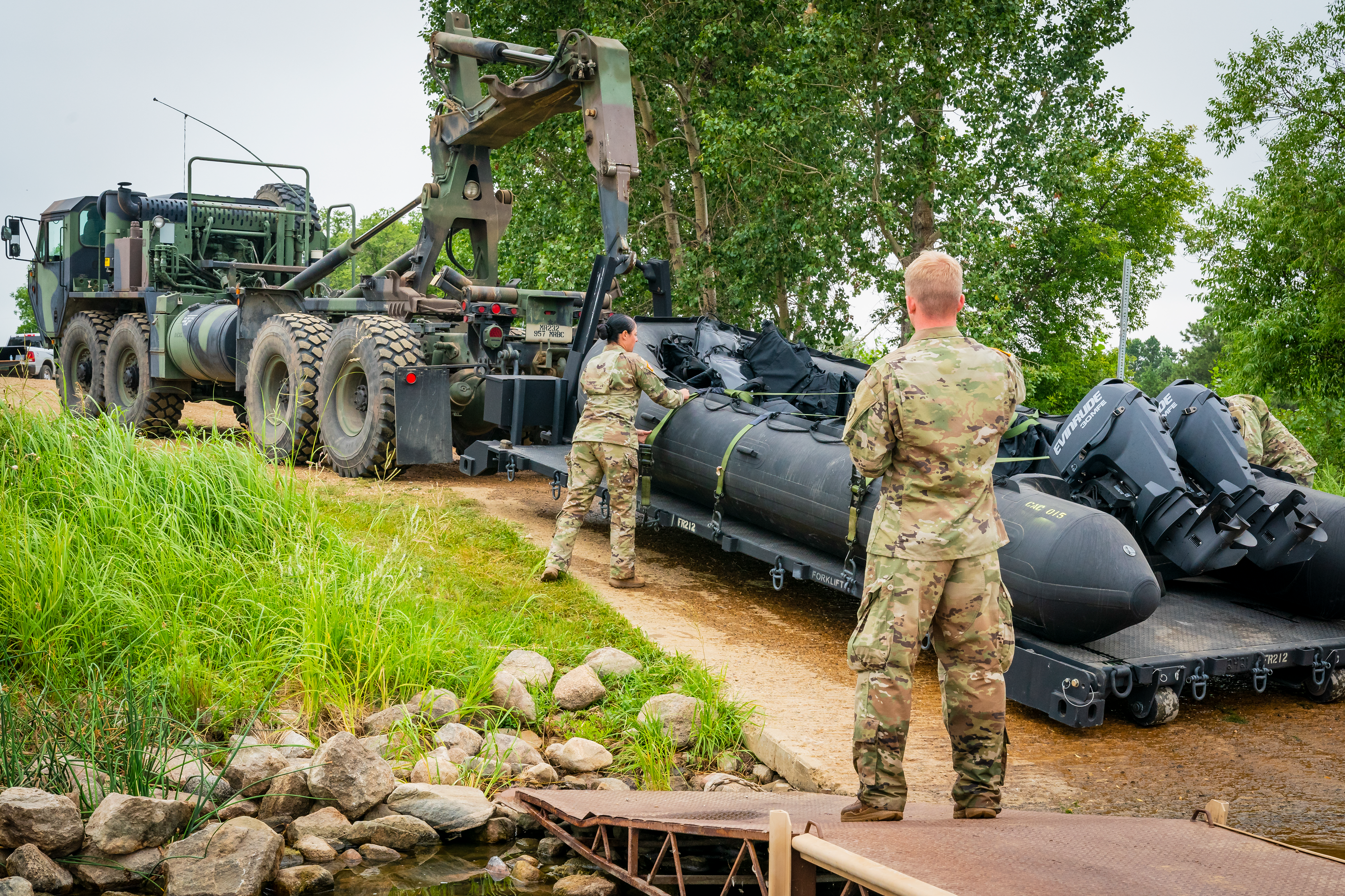 The morning of August 5, 2020, the N.D. National Guard partnered with the Morton County Sheriff’s Office and Morton County Emergency Management at the Crown Butte Dam near Mandan, N.D. Soldiers of the 957th Engineer Company (Multi-Role Bridge) assisted civil authorities with a water search and rescue after a simulated levee breech. (U.S. Army National Guard story and photos by Staff Sgt. Ashley Johlfs, 116th Public Affairs Detachment)
