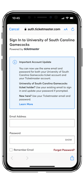 Yes, you will be able to access your tickets via the South Carolina Gameday App by entering your email address and Ticketmaster password. Alternately, you can access Ticketmaster.com via your browser.