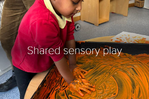 We have been using paint as both a shared and sensory activity together. Using a tuff tray, and with a little encouragement for some, we put some different coloured paints and used our hands to mix it together. We explored the texture and feeling of it on our hands and scrimbled and made marks with our fingers. Lots of messy fun!