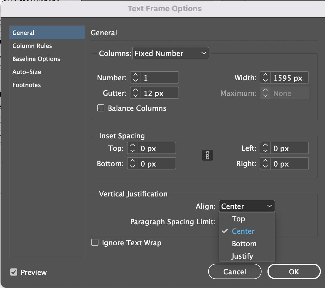 - Switch to the Selection Tool (V) and right-click on the shape. Select "Text Frame Options..." to find the vertical justification