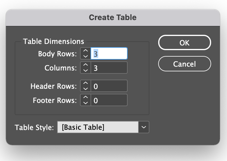 2. With a type frame selected, Go to Table> "Insert Table" and select your options. After clicking okay, The table will fill your type frame.
