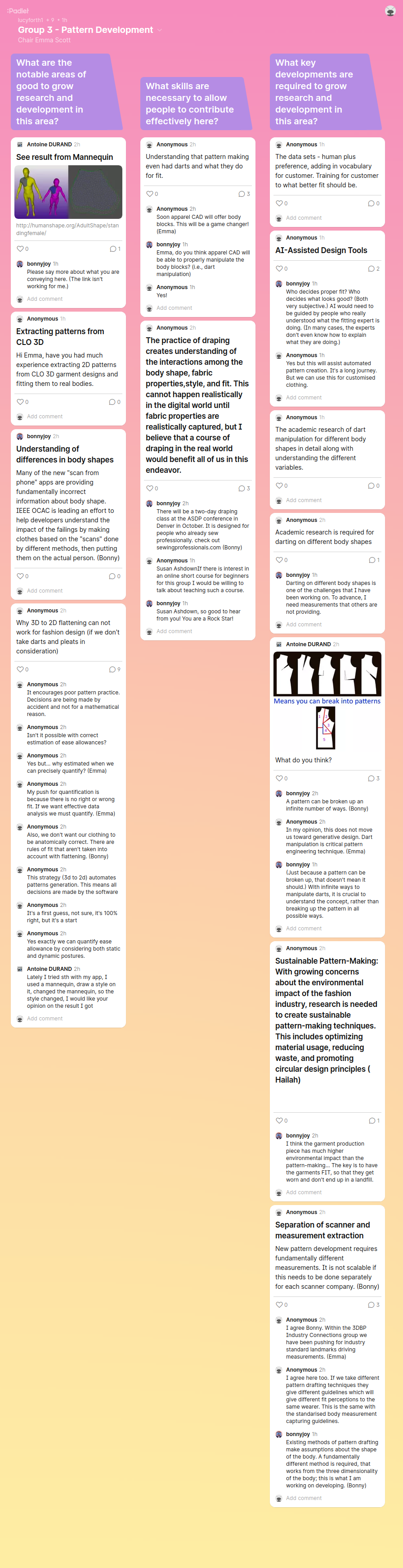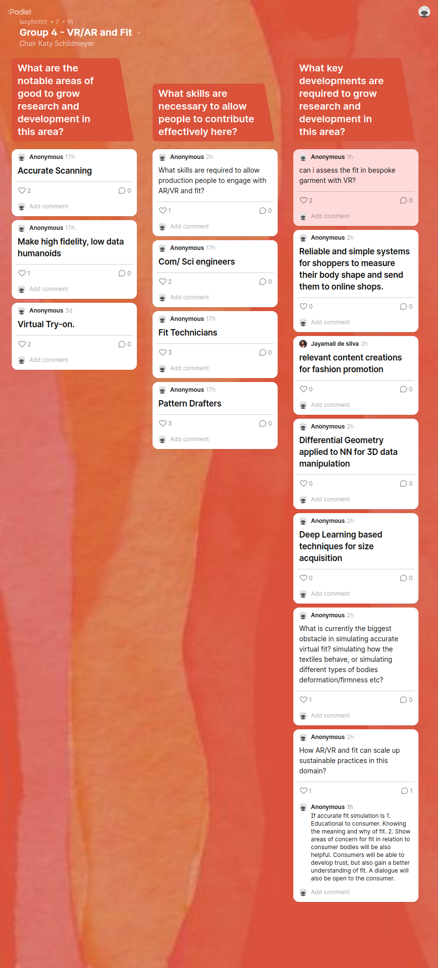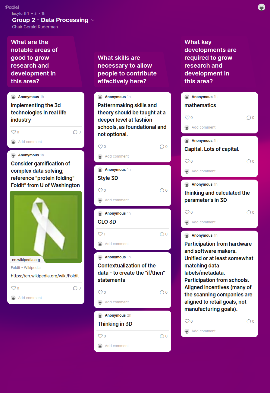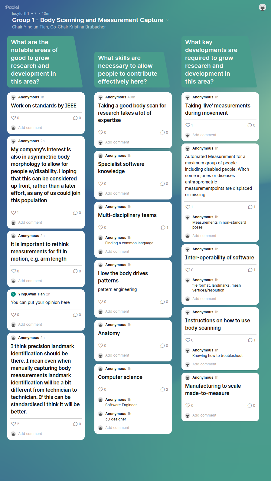 Discussions were centered around the potential of technology in achieving sustainable fashion was explored. While technology offers solutions to sustainability and waste reduction, challenges like skill shortages and exploitative practices were acknowledged. This event delved into research, followed by breakout discussions on vital areas featuring body scanning, data processing, pattern development, and VR/AR fit. This event fostered diverse perspectives, allowing shared documentation to drive industry change collaboratively.