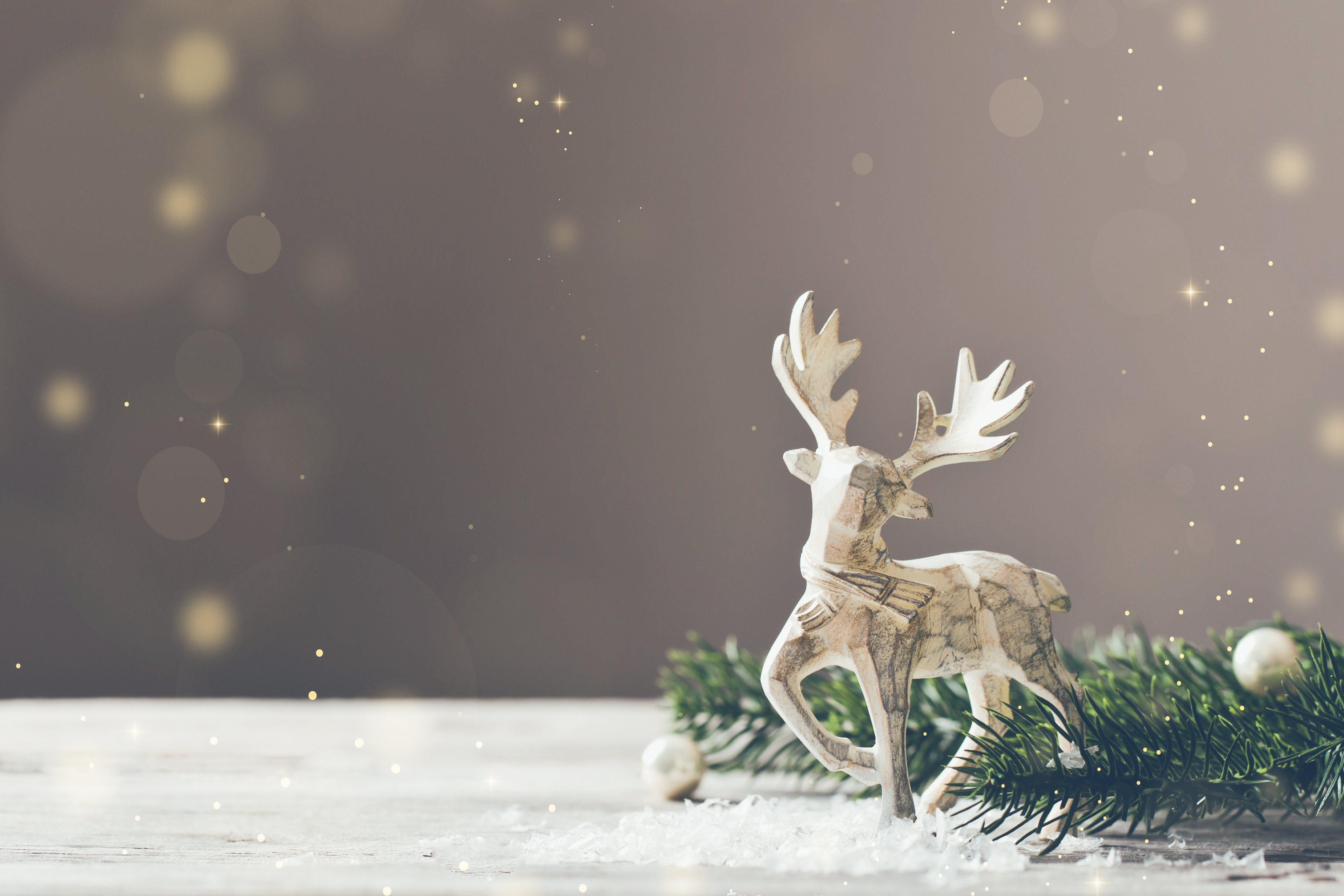 Created with images by puhimec - "Christmas cozy background with decor details, snow and blurry lights copy space." • jutarat - "The nativity scene with Jesus Christ as a newborn in the manger, surrounded by Mary, Joseph, and the shepherds under a starry sky" • Ivanna Pavliuk - "Christmas card conception. Christmas toy deer decoration with christmas tree branch and snow"