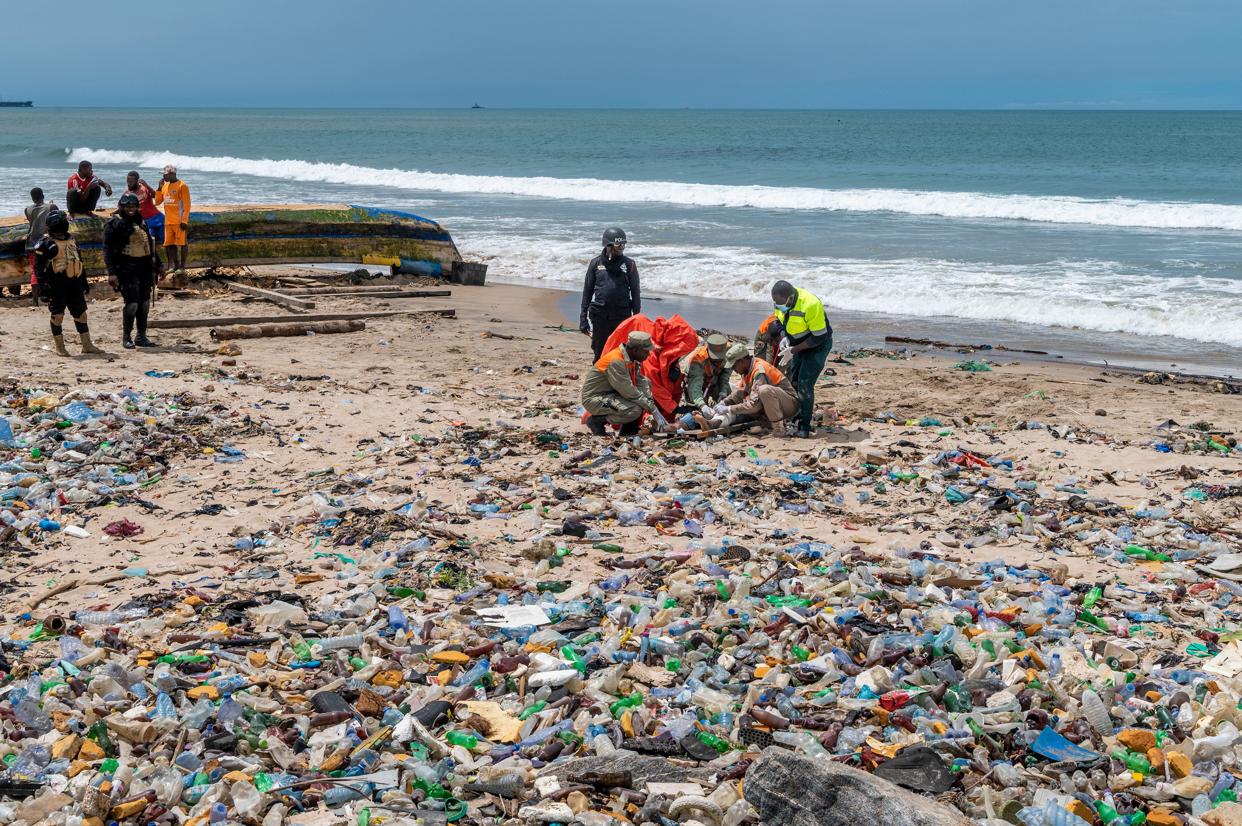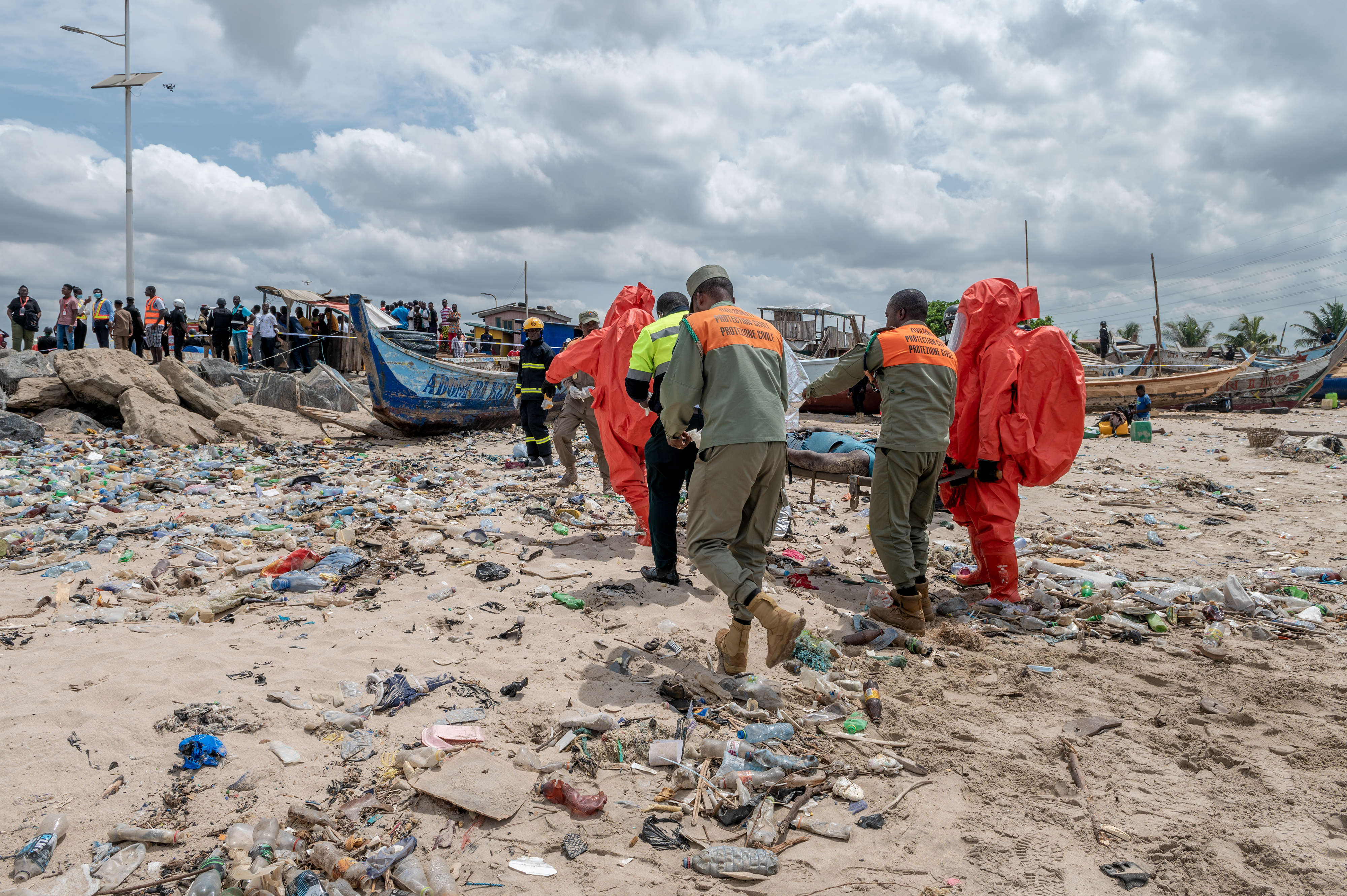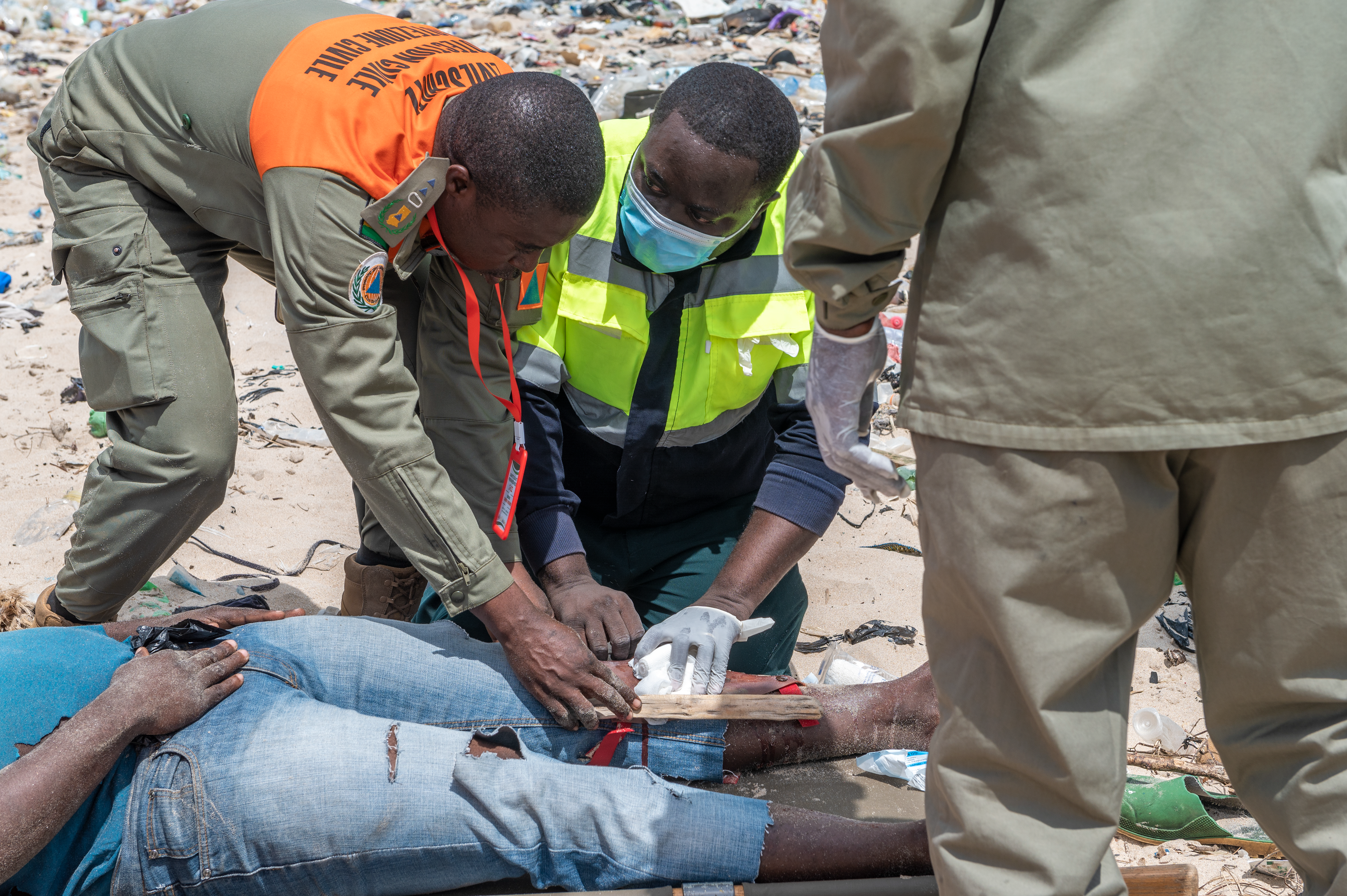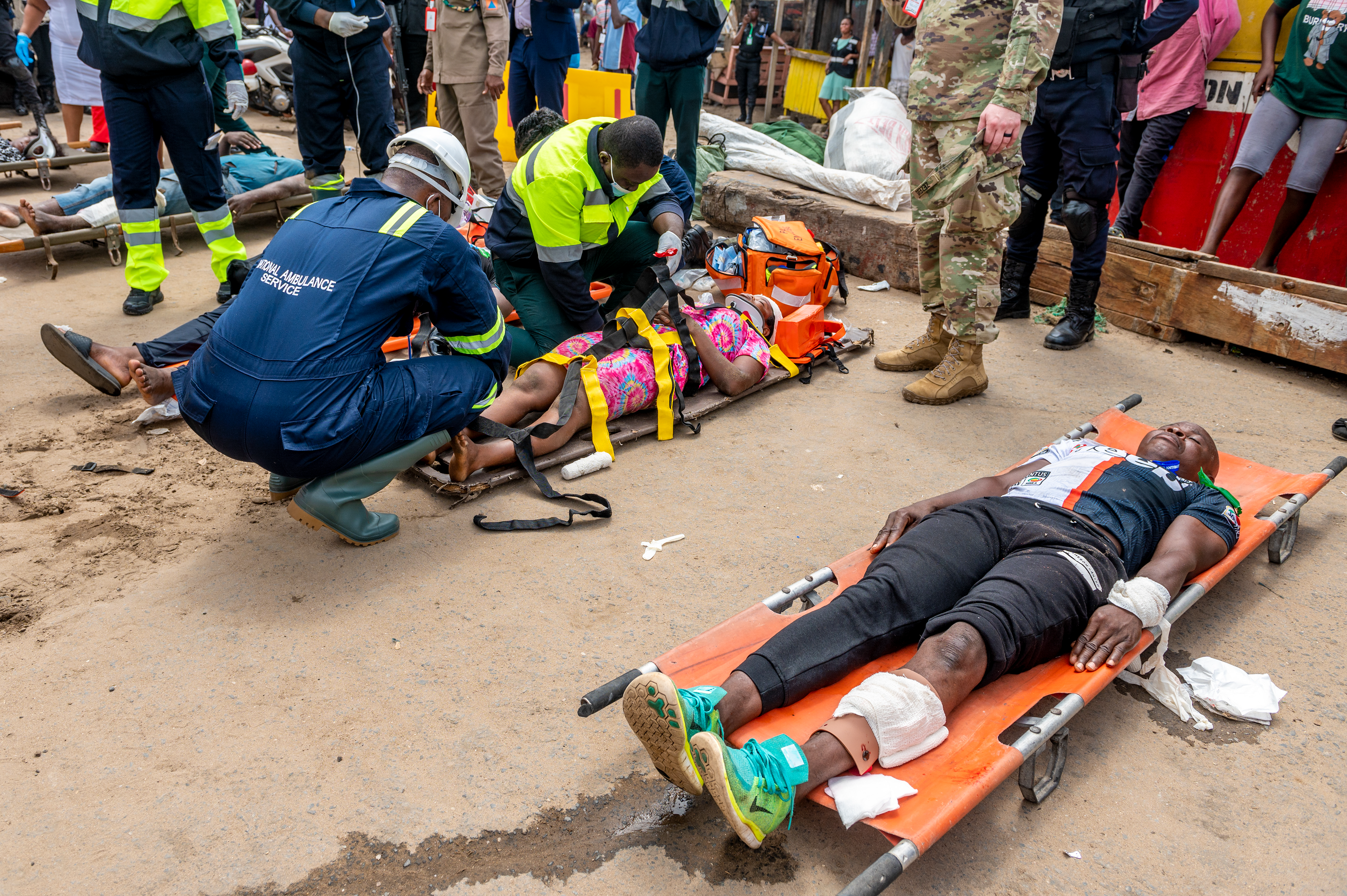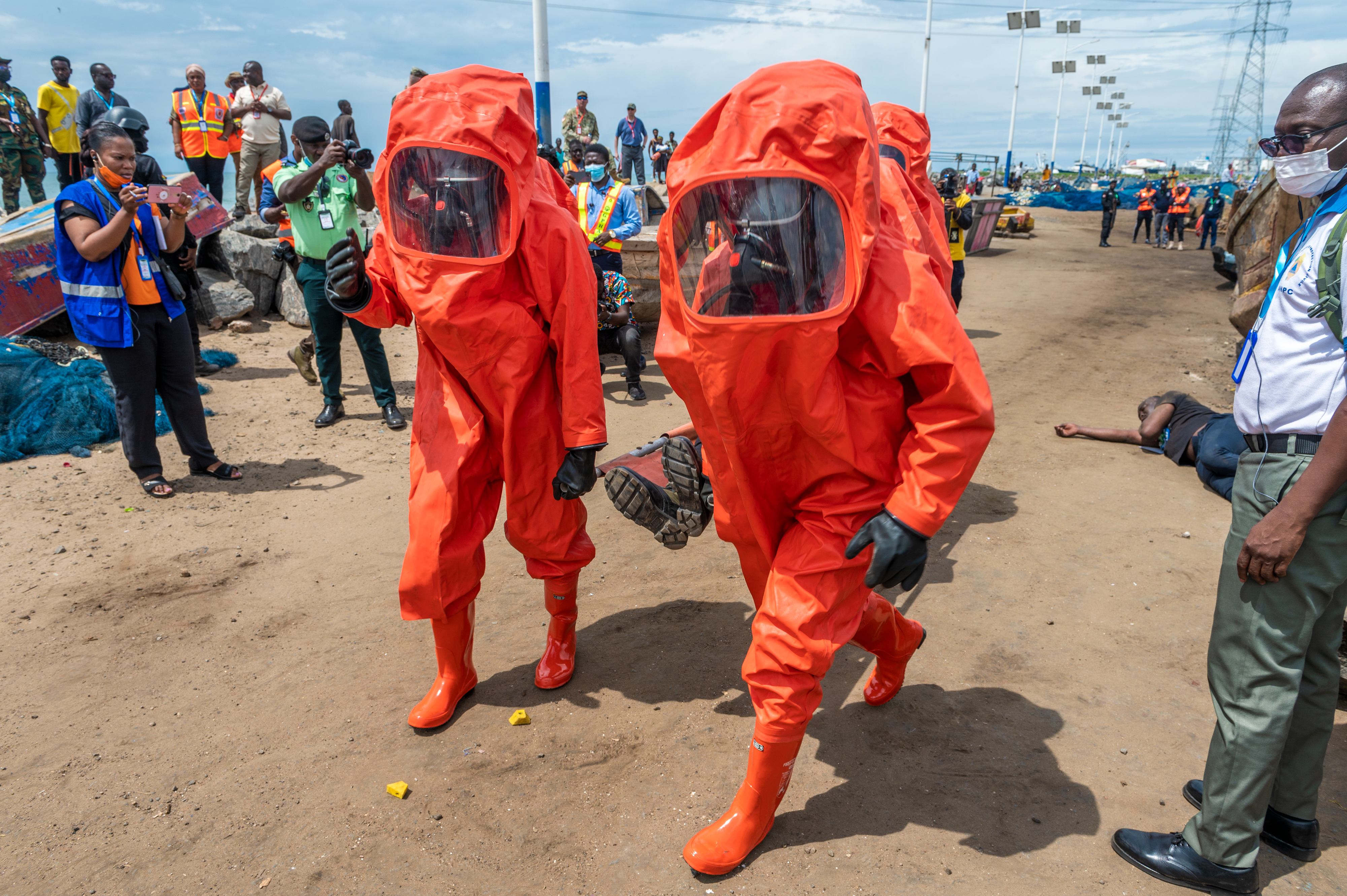 Members of the Ghana National Disaster Management Organization, in tan and orange, with a member of the Ghana National Fire Service in orange HAZMAT protective gear, and a member of the National Ambulance Service, stabilize a survivor during Lignite Coast 2022 Preparedness Exercise "Shikpon Wosomo", at the Tema Canoe Harbor, Ghana, June 21, 2022.