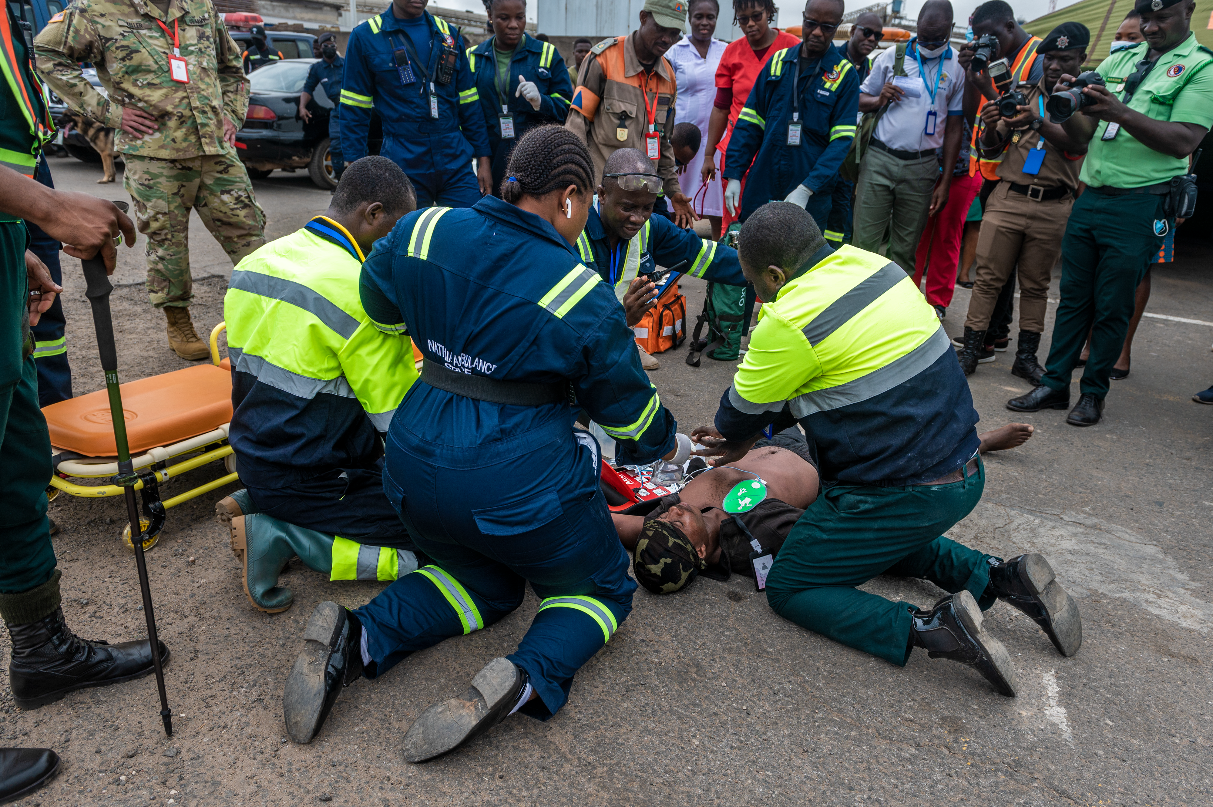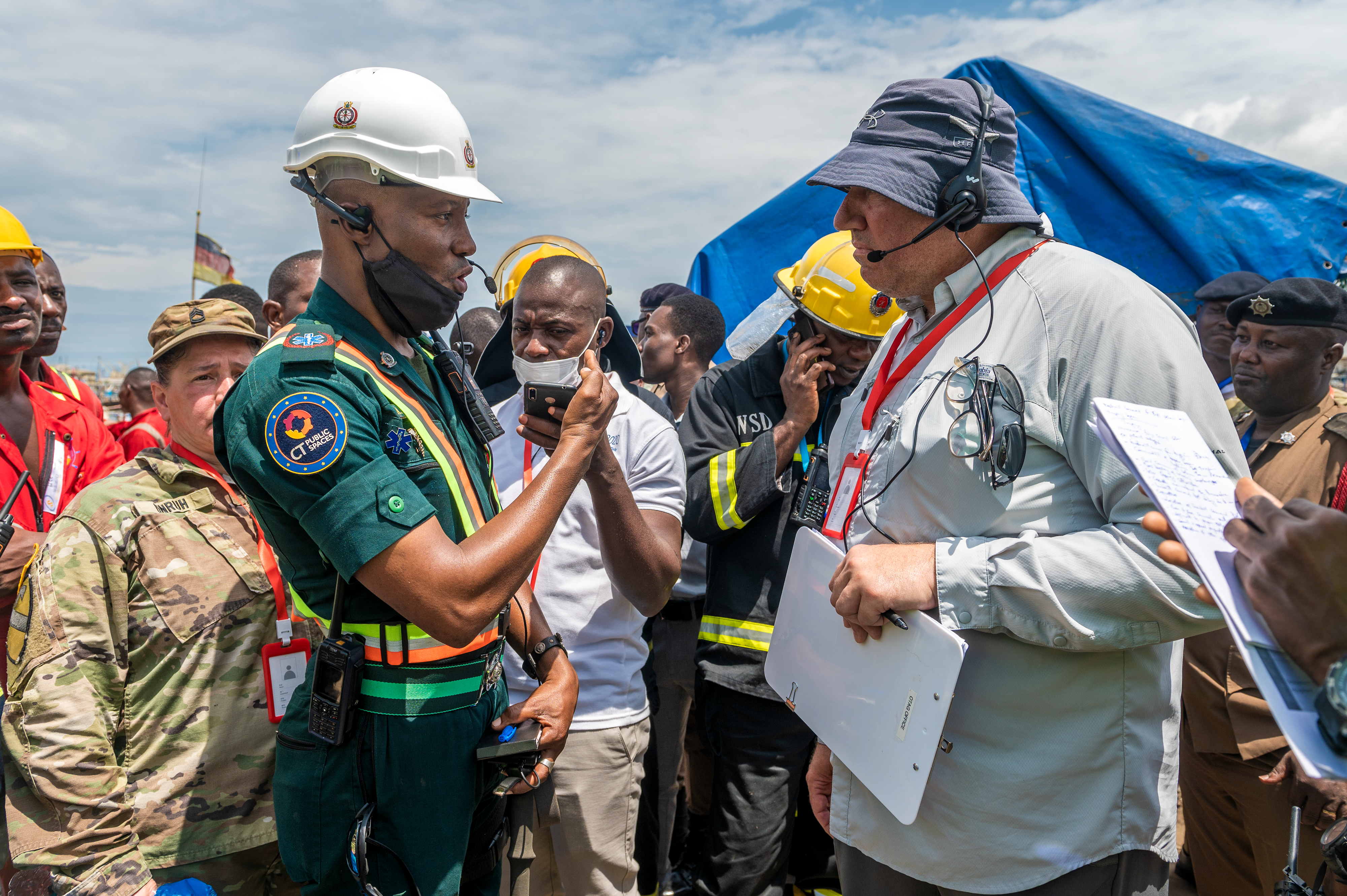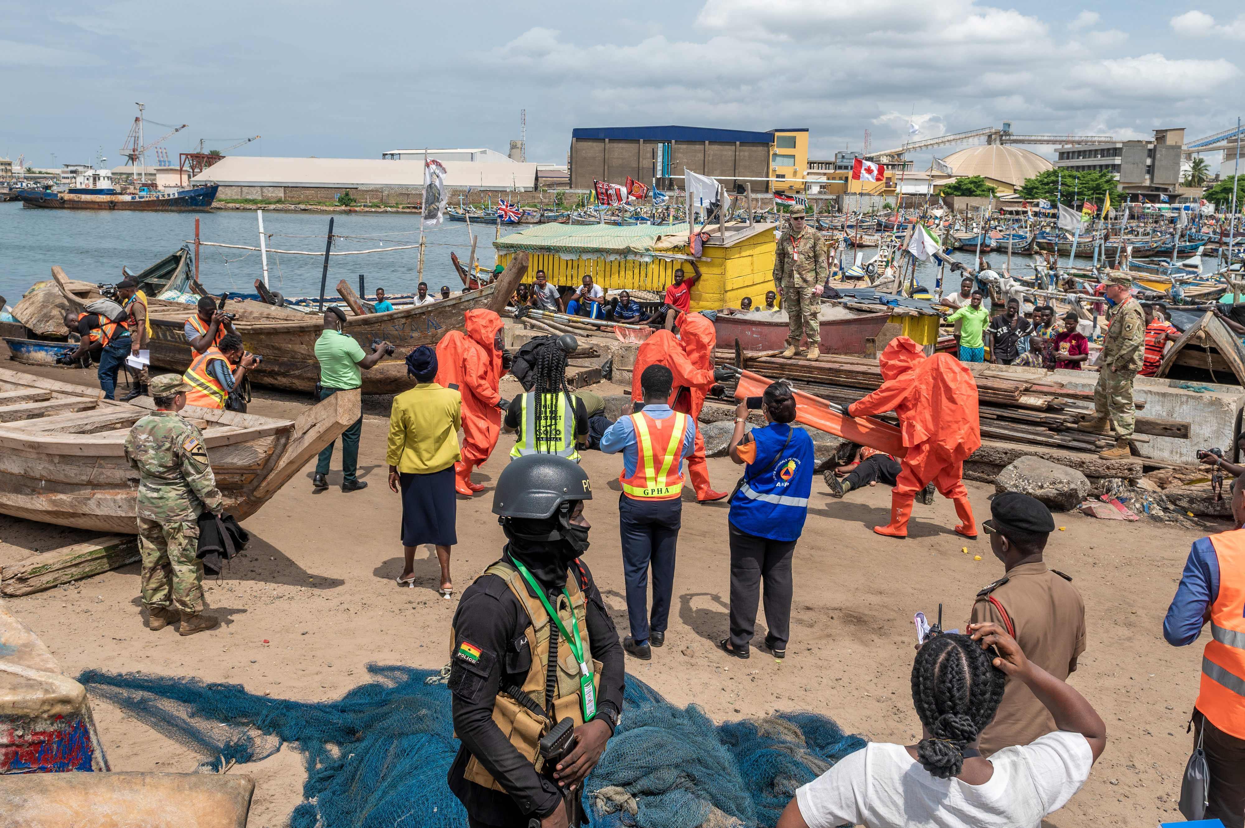 The first exercise took place at the Tema Canoe Harbor, a heavily used fishing harbor in Ghana, June 21, 2022. The scenario began after a notional earthquake injured several people at the harbor while other people at the scene were panicking, rushing toward anyone who could render assistance. The Ghanaian agencies would have to collaborate to control the panicked crowd, recover victims, and establish a casualty collection point under the guidance of the incident commander from the National Ambulance Service.