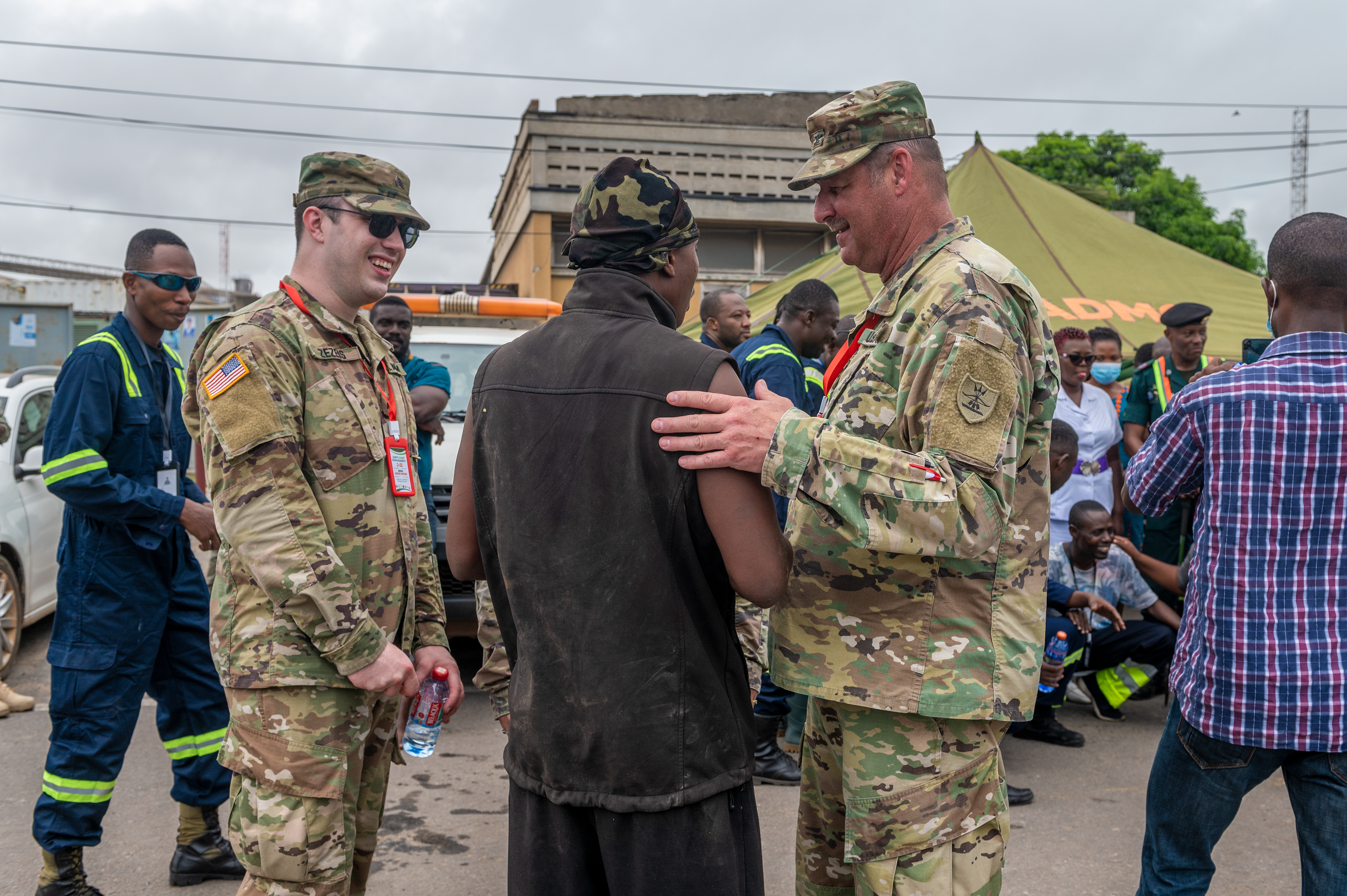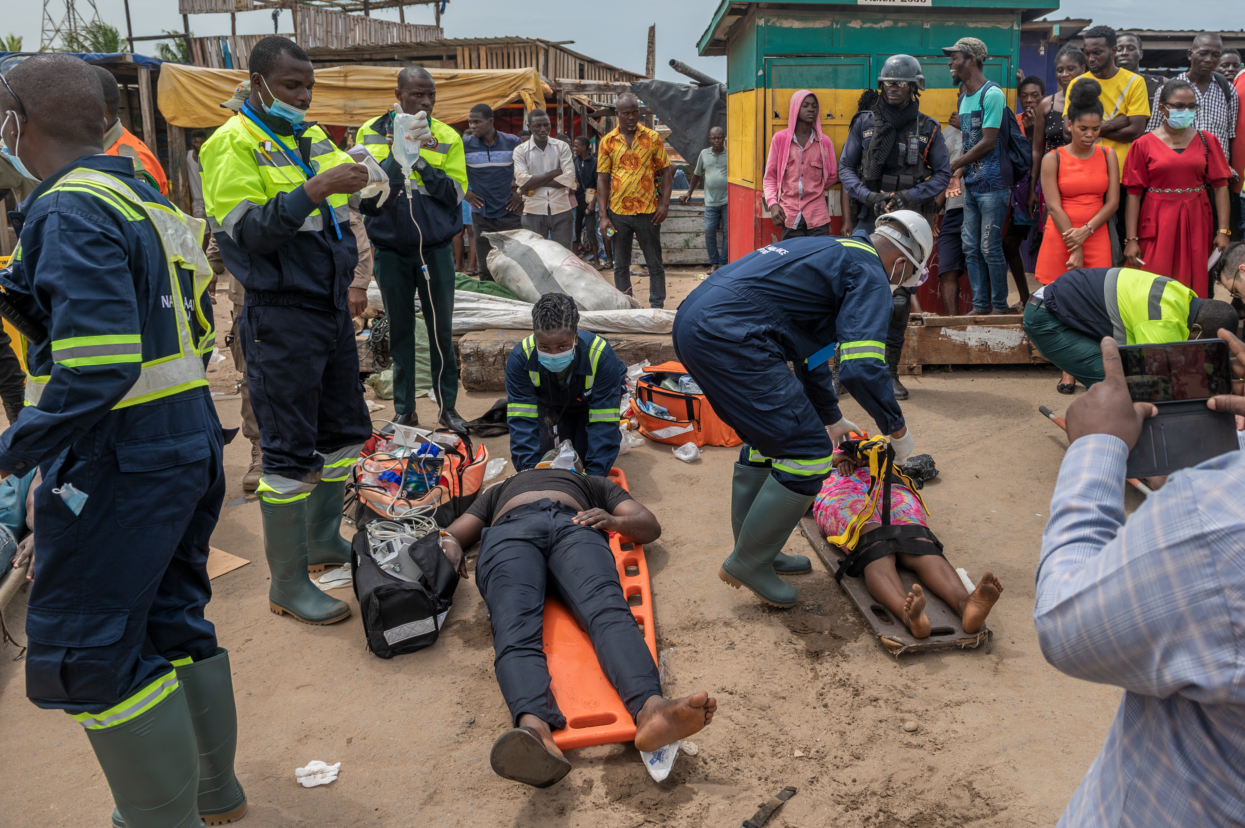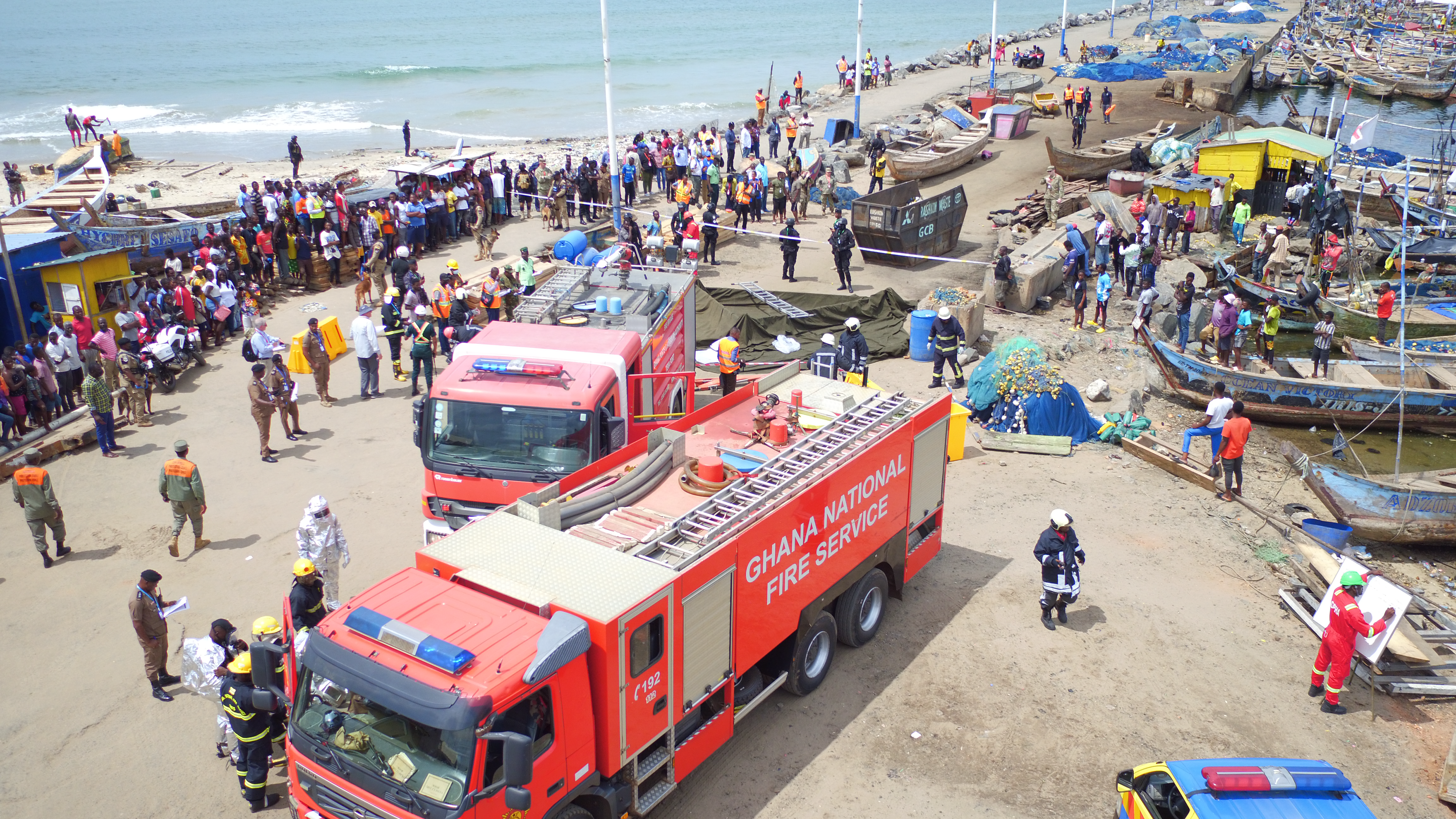 The first exercise took place at the Tema Canoe Harbor, a heavily used fishing harbor in Ghana, June 21, 2022. The scenario began after a notional earthquake injured several people at the harbor while other people at the scene were panicking, rushing toward anyone who could render assistance. The Ghanaian agencies would have to collaborate to control the panicked crowd, recover victims, and establish a casualty collection point under the guidance of the incident commander from the National Ambulance Service.