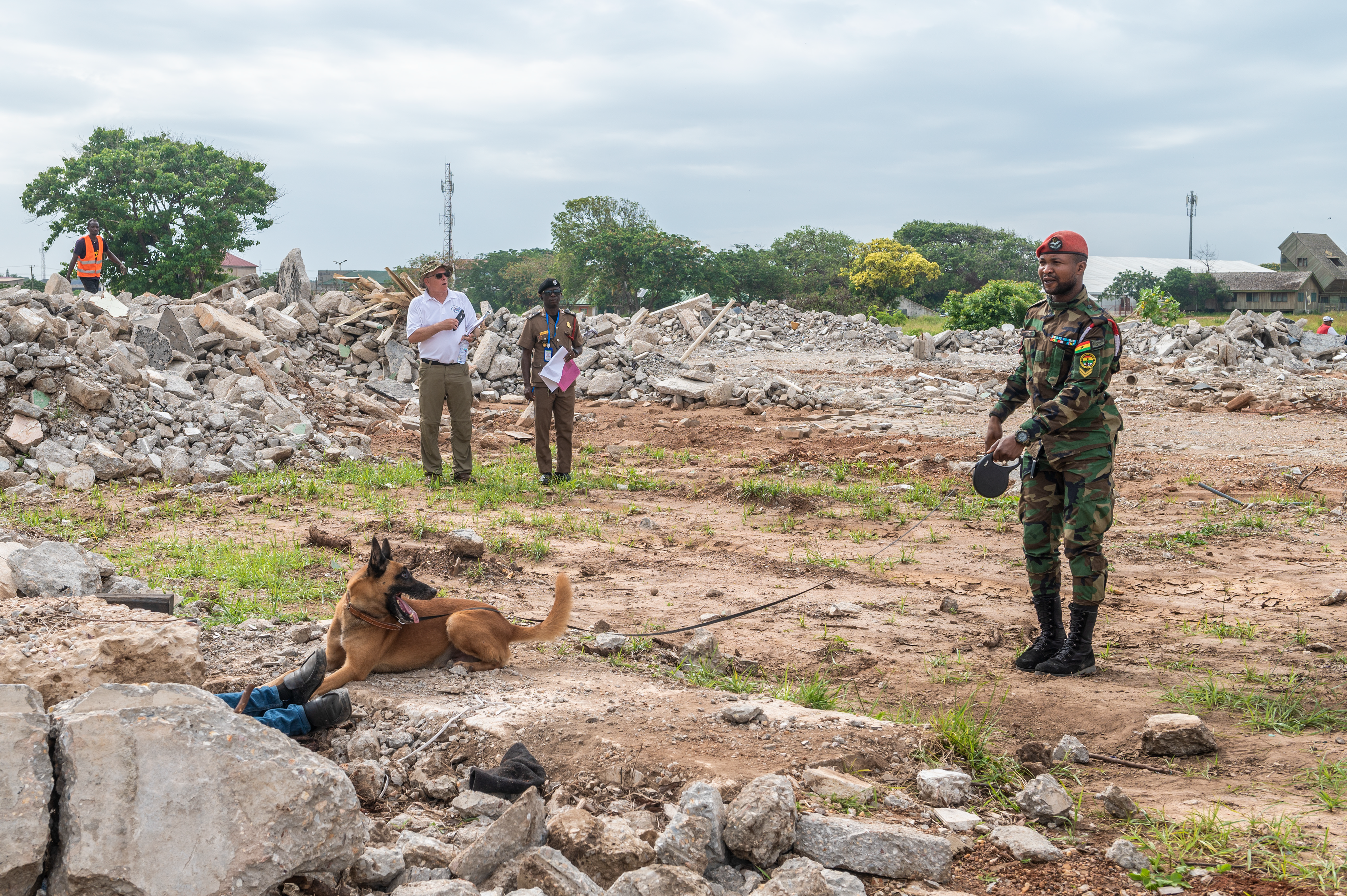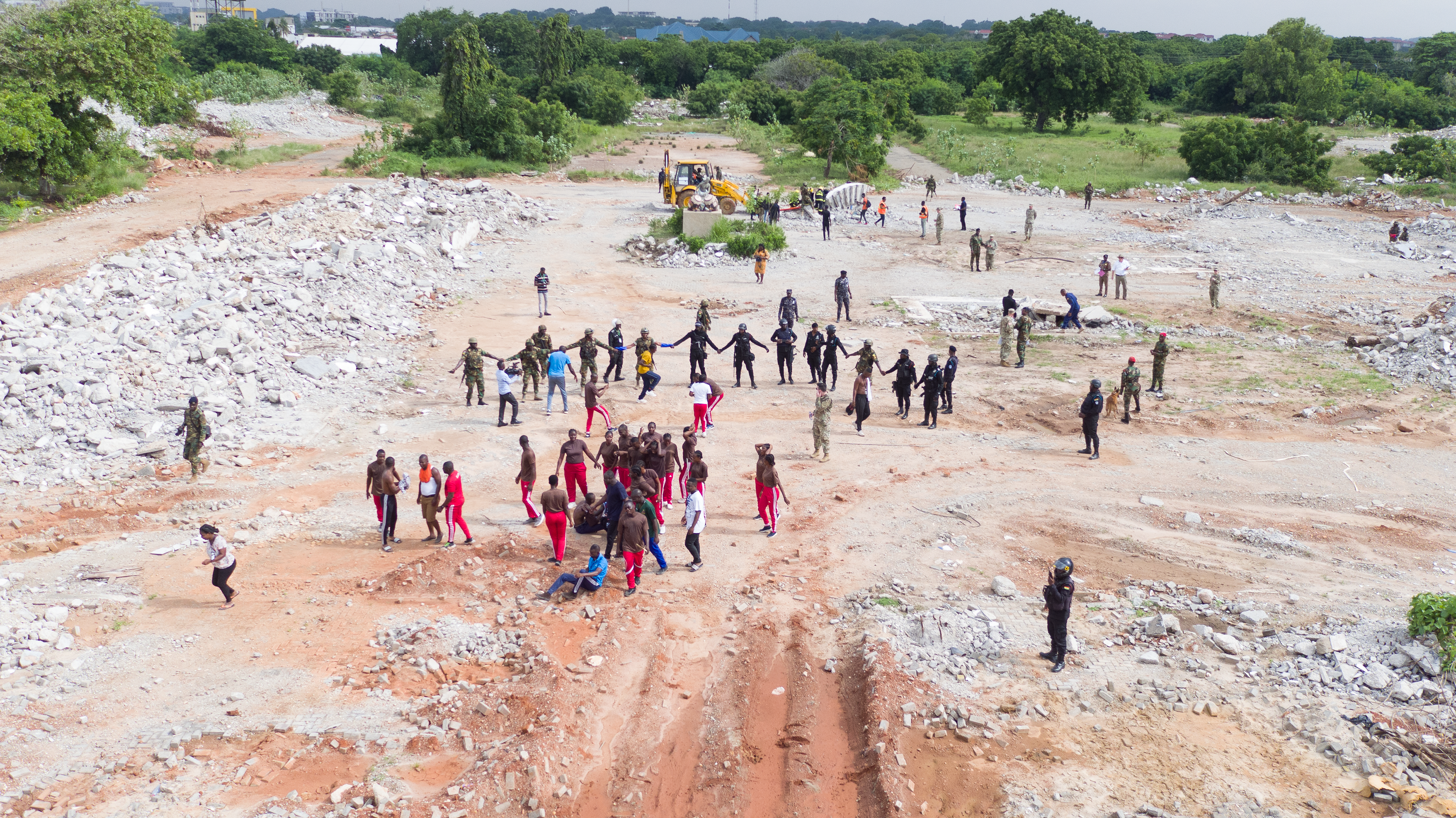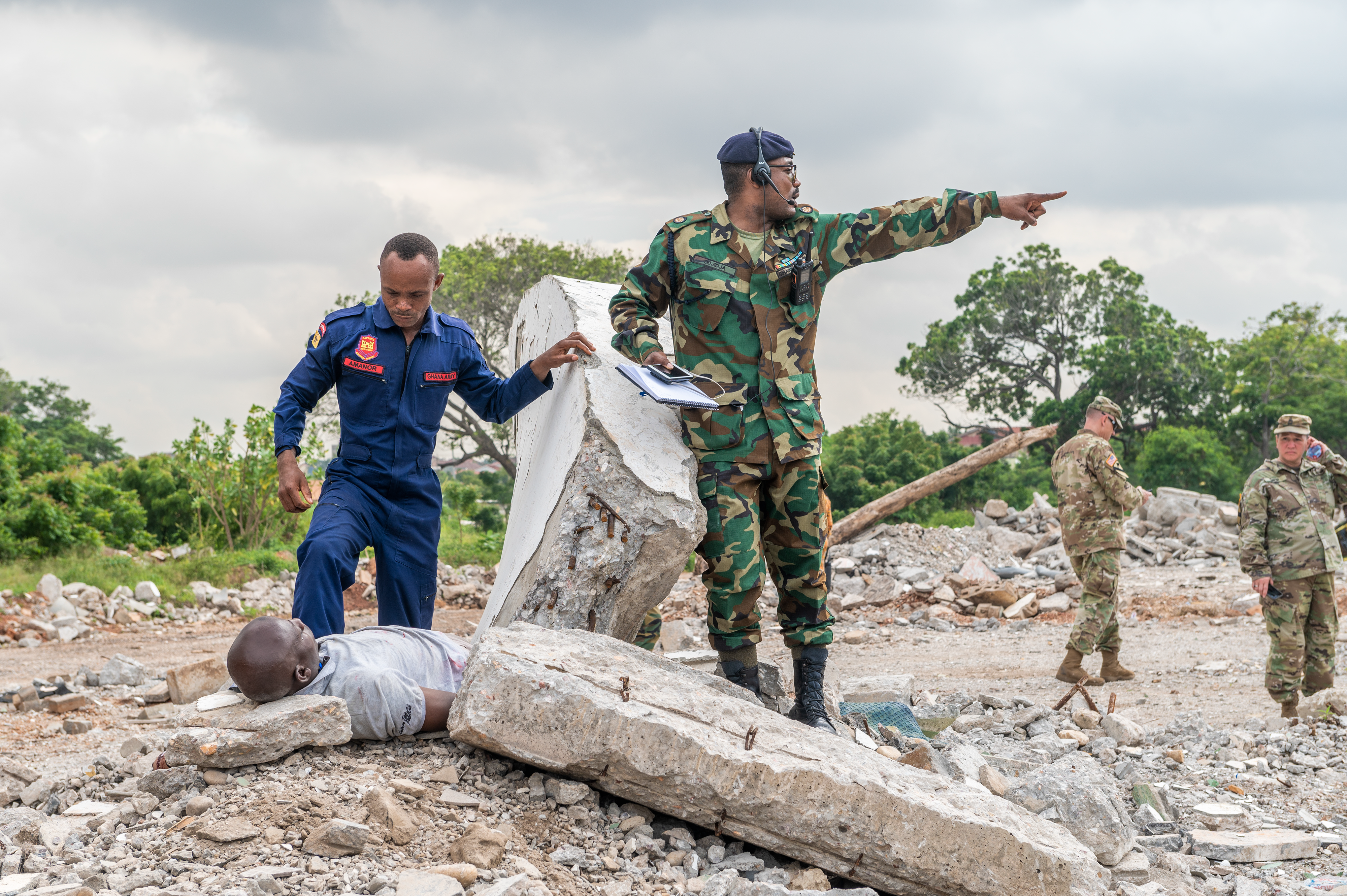 The final exercise was a search and rescue scenario in a rubble pile as a result of a simulated earthquake, June 23, 2022. The Ghana Armed Forces served as the Incident Commander for this engagement, in which a large crowd of panicked bystanders prevented first responders from being able to properly locate, triage, and care for the victims. Many of the victims in the scenario were also notionally trapped under the rubble and needed heavy equipment to free them. The Ghana Armed Forces assisted the Ghana Police Service in controlling the large crowd and also brought search and rescue dogs to assist the first responders in locating the victims.