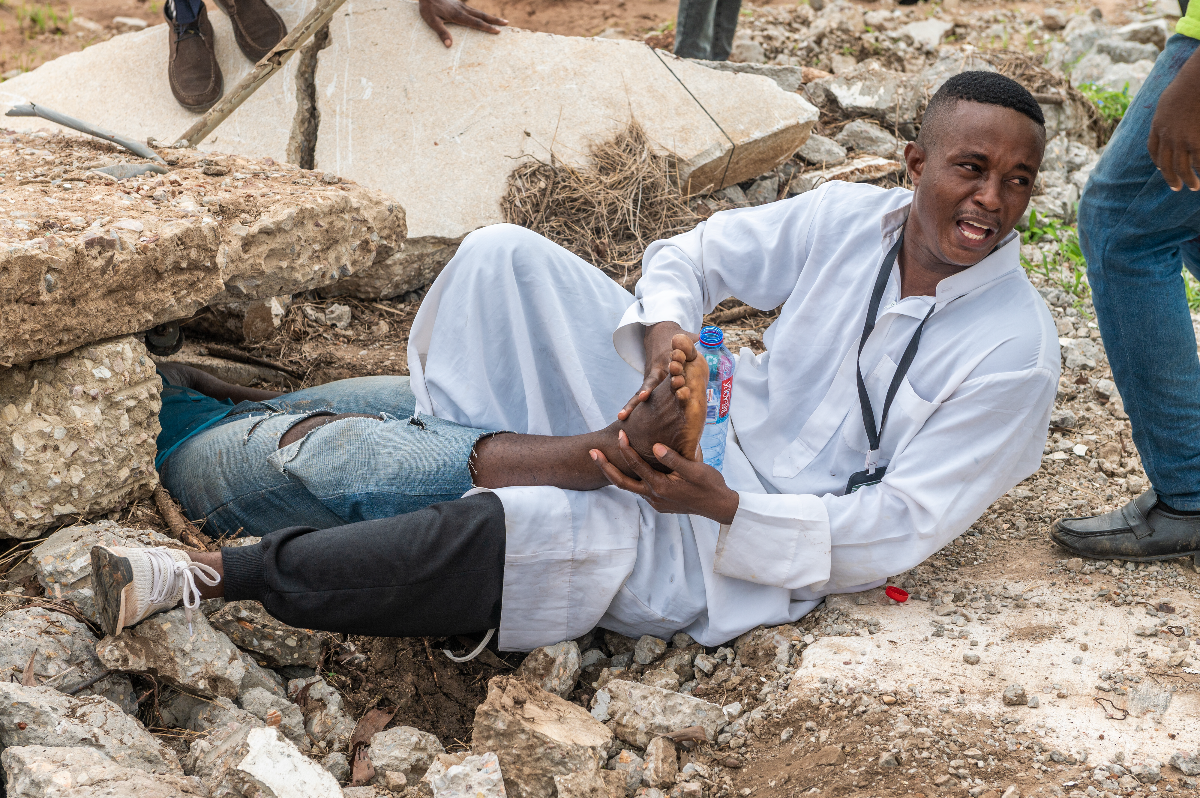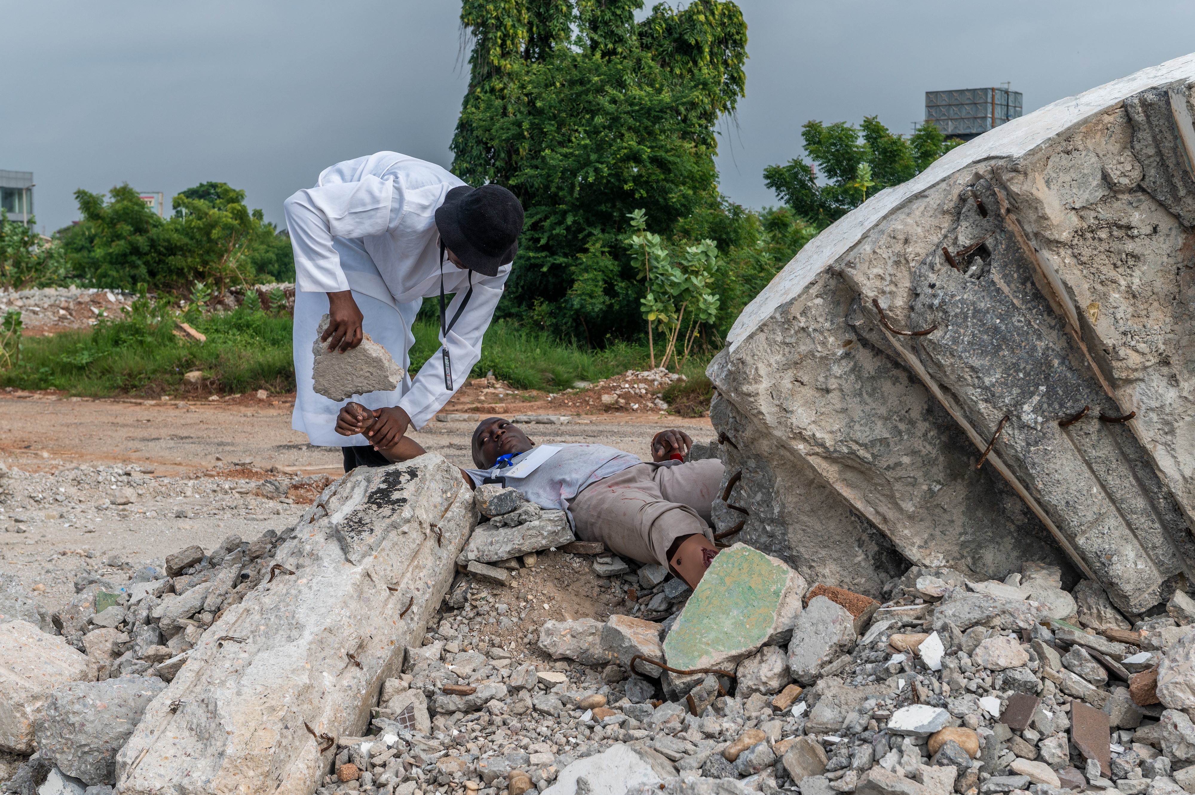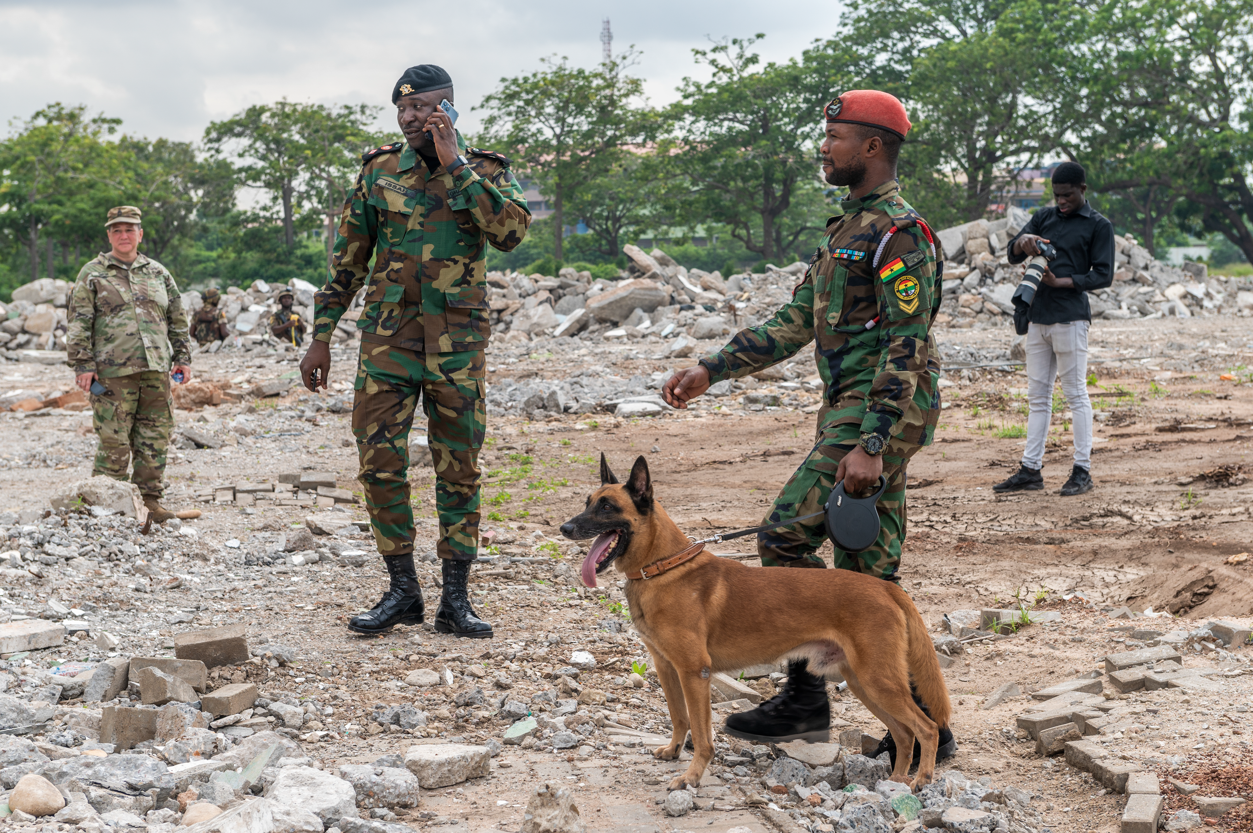 The final exercise was a search and rescue scenario in a rubble pile as a result of a simulated earthquake, June 23, 2022. The Ghana Armed Forces served as the Incident Commander for this engagement, in which a large crowd of panicked bystanders prevented first responders from being able to properly locate, triage, and care for the victims. Many of the victims in the scenario were also notionally trapped under the rubble and needed heavy equipment to free them. The Ghana Armed Forces assisted the Ghana Police Service in controlling the large crowd and also brought search and rescue dogs to assist the first responders in locating the victims.