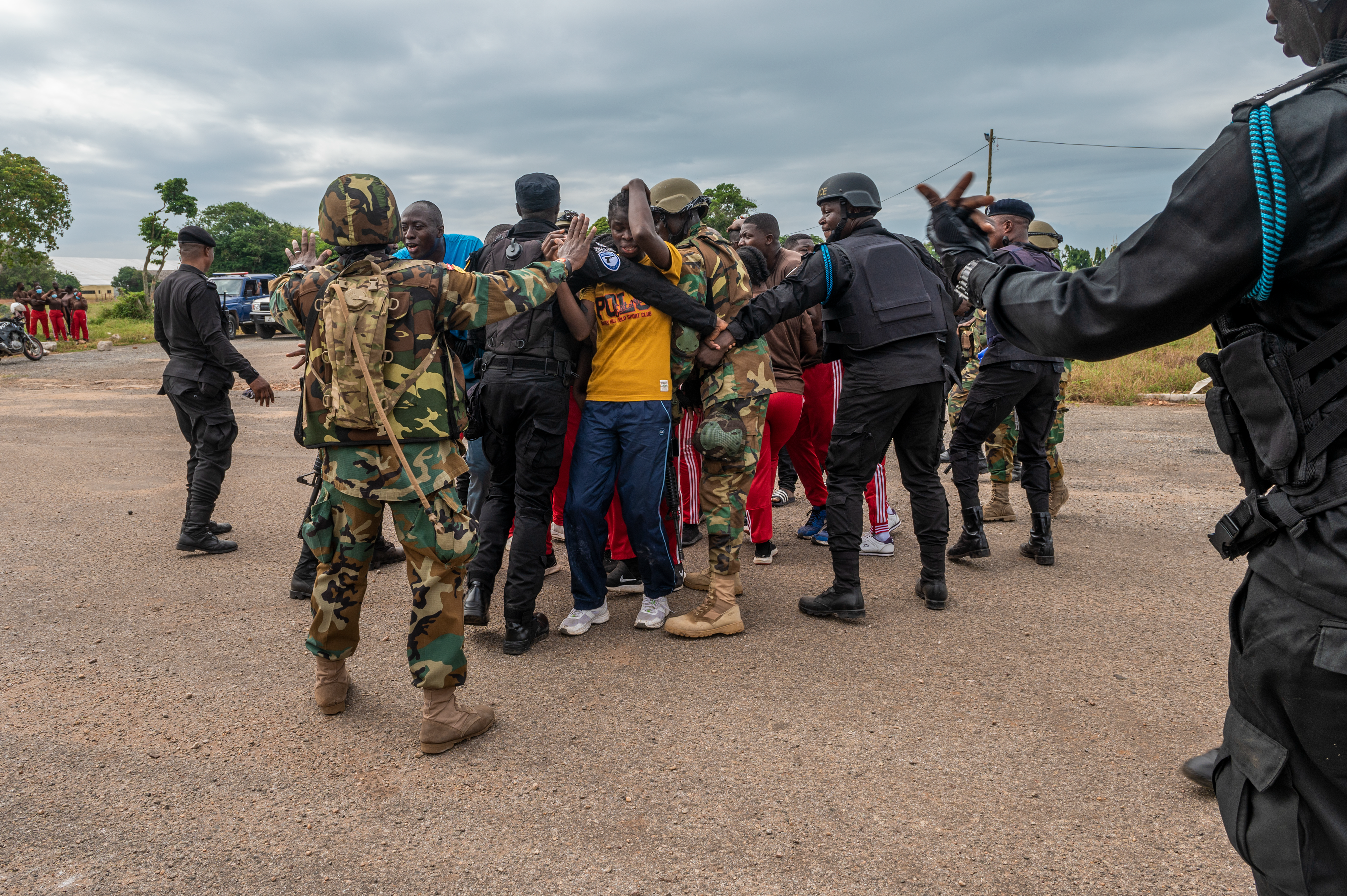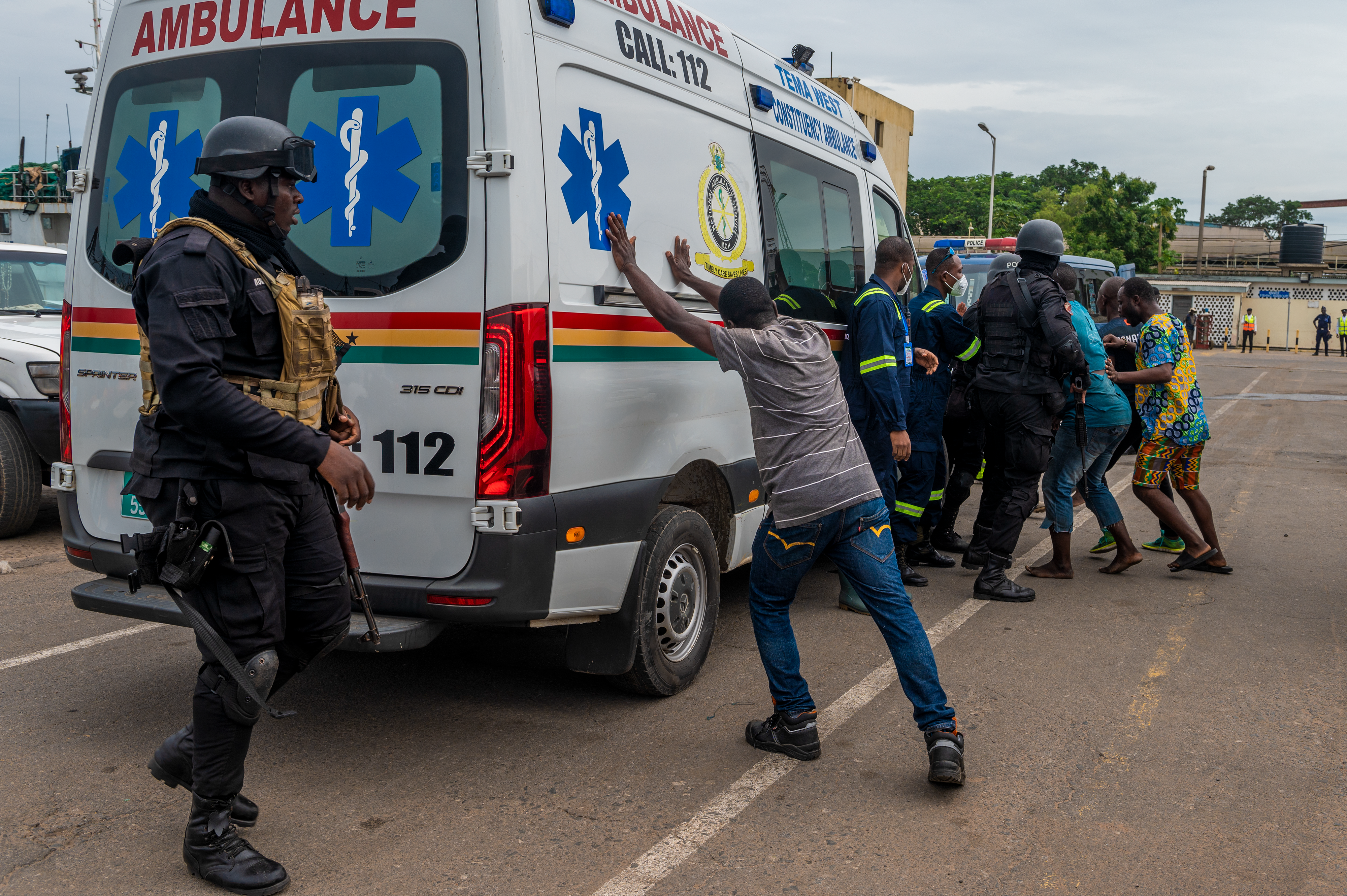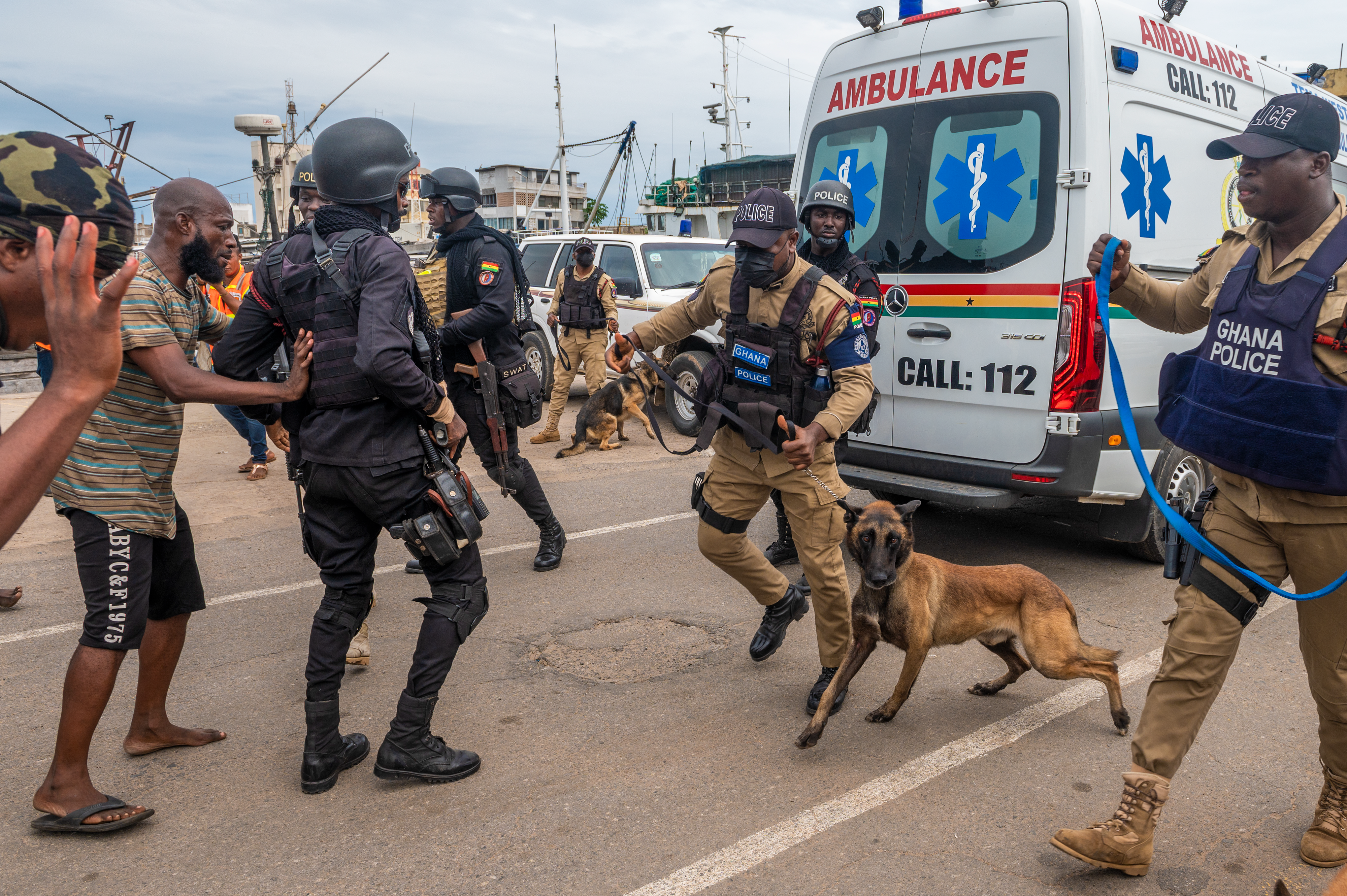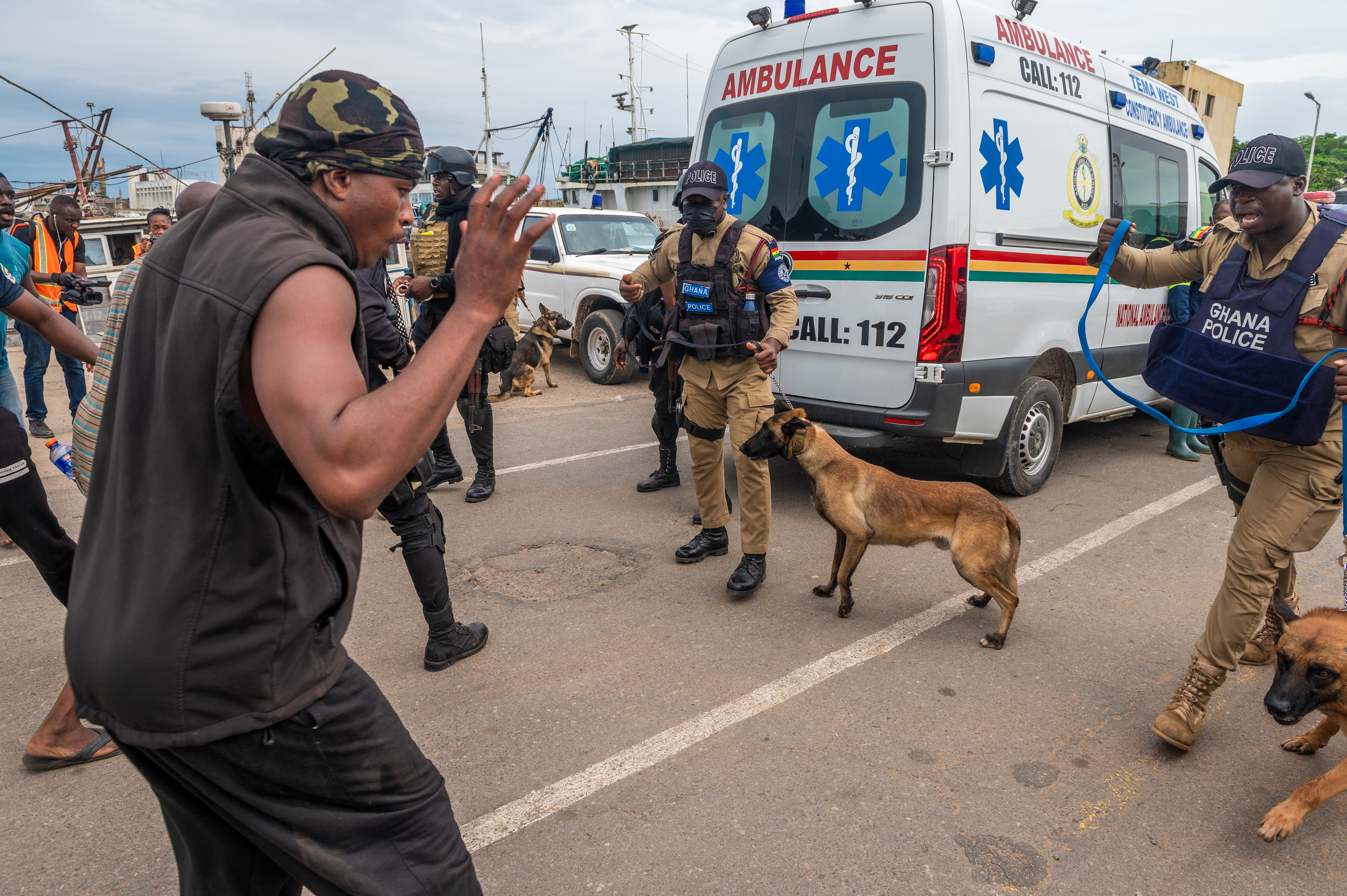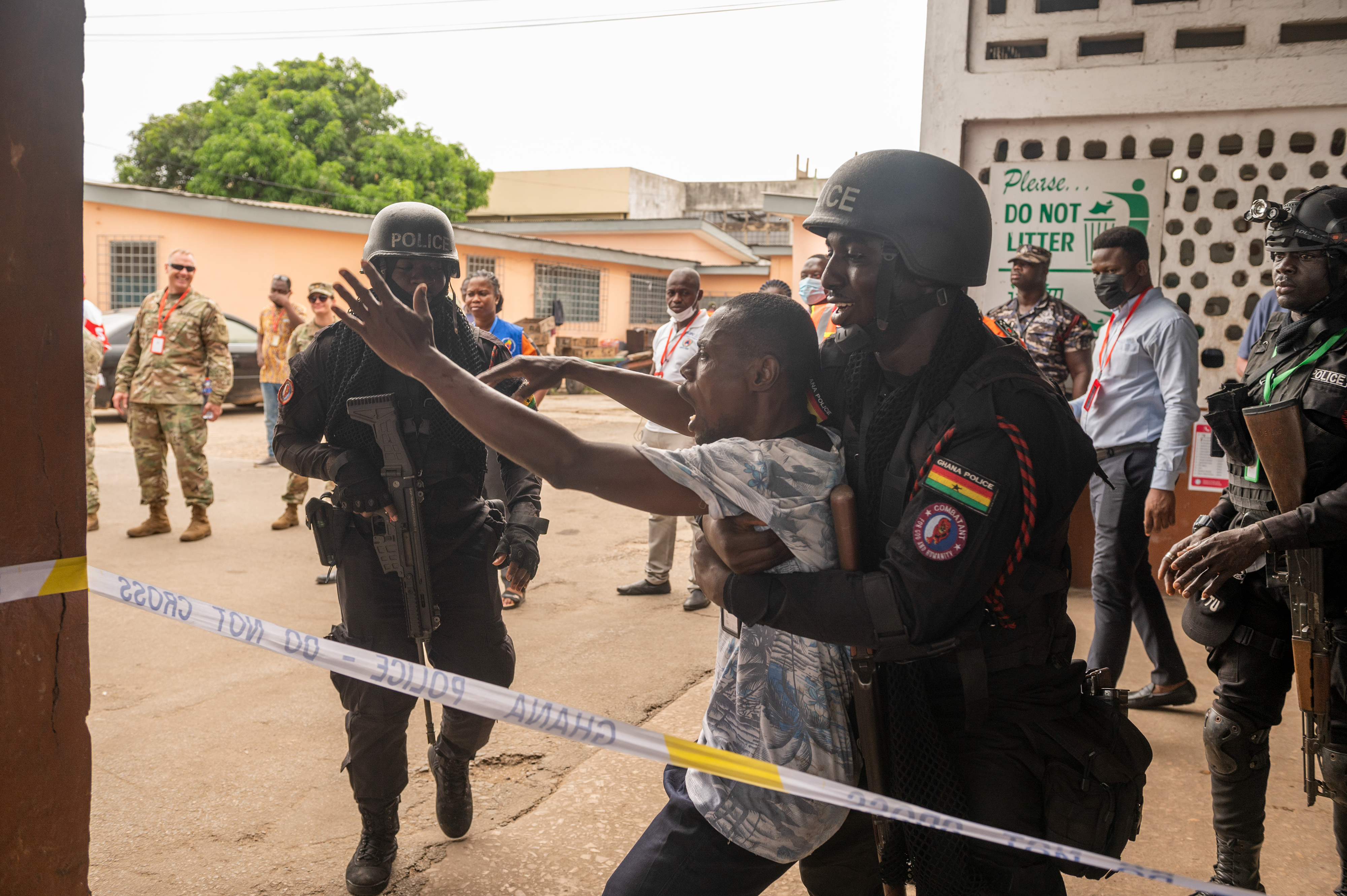 After the disturbance broke out, the Ghana Police Service moved the more aggressive participants away from the fish market. In response, the unruly crowd surged toward the ambulances and began to rock them; the actors pretending to attempt to tip them over. The Ghana Police Service brought out their K9 unit and riot shields and were able to use them to maneuver the crowd away from the National Ambulance Service. The first responders could then move in, collect the injured, and move them to the casualty collection point.