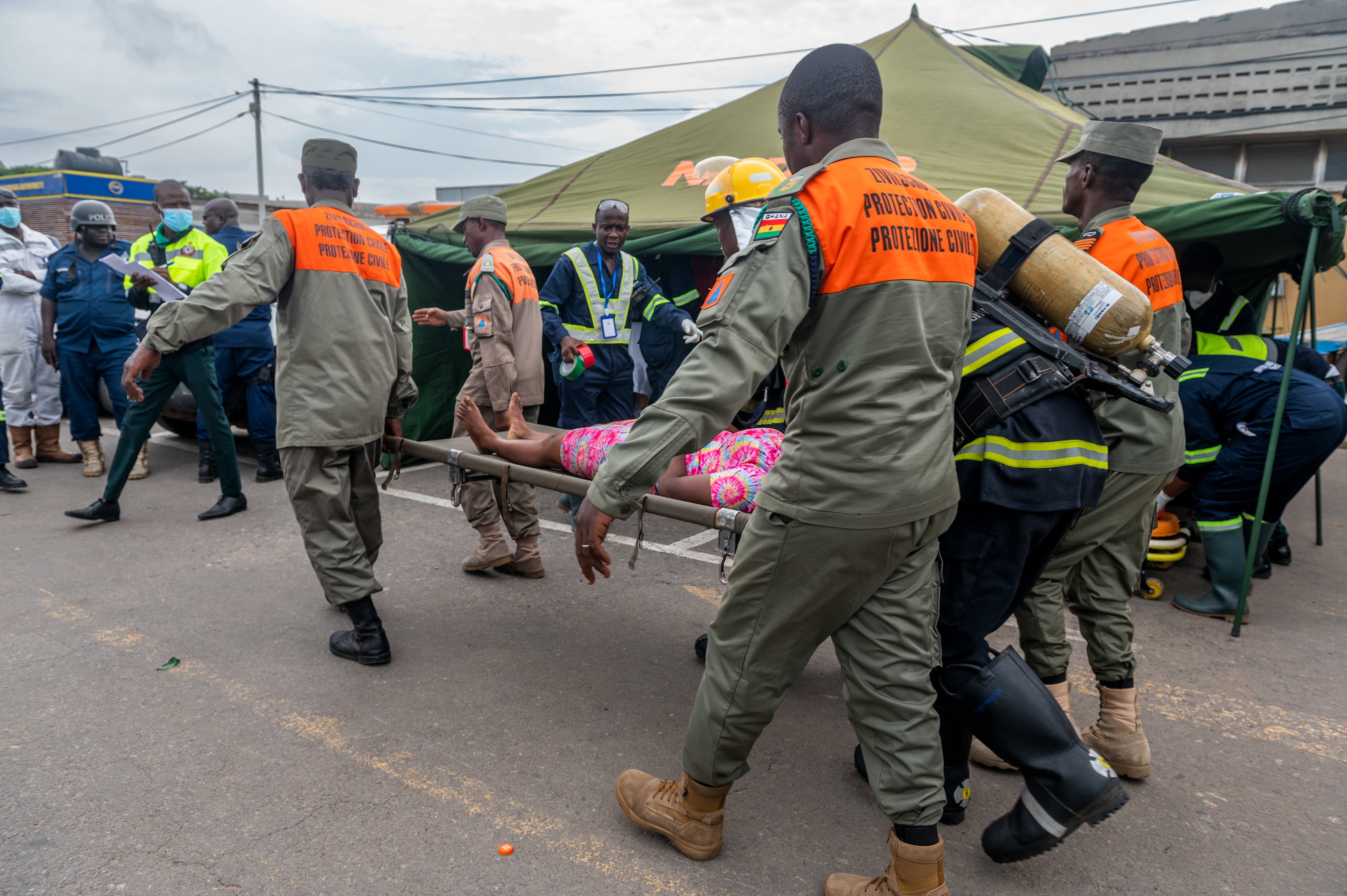 Members of the Ghana National Disaster Management Organization carry a survivor to the casualty collection point inside the tent during Lignite Coast 2022 Preparedness Exercise "Shikpon Wosomo", in a Tema fishing village, Ghana, June 21, 2022.