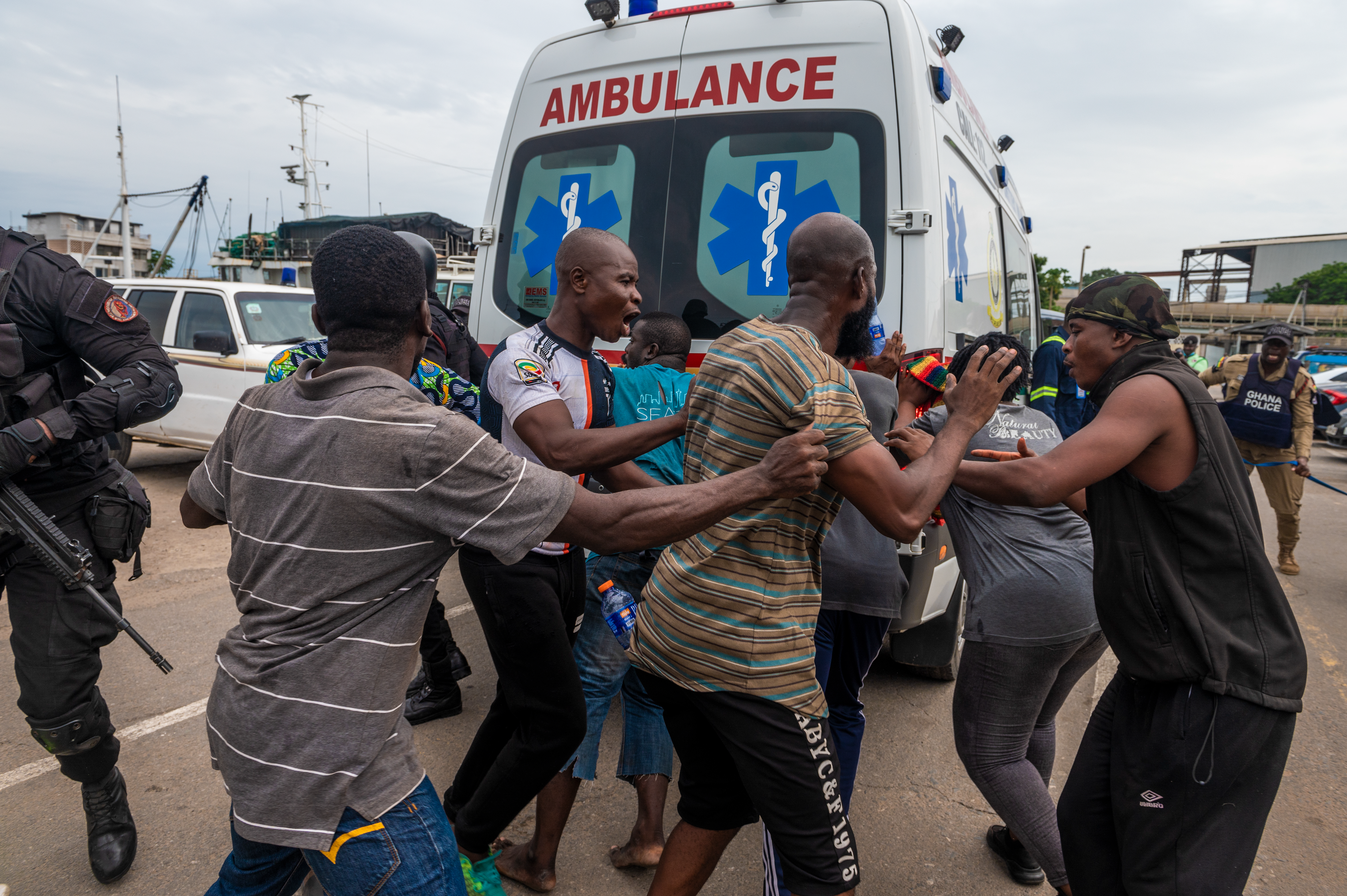 A member of the Ghana Police Service stops a man from rushing the National Ambulance Service during Lignite Coast 2022 Preparedness Exercise "Shikpon Wosomo", at the Tema Canoe Harbor, Ghana, June 21, 2022.