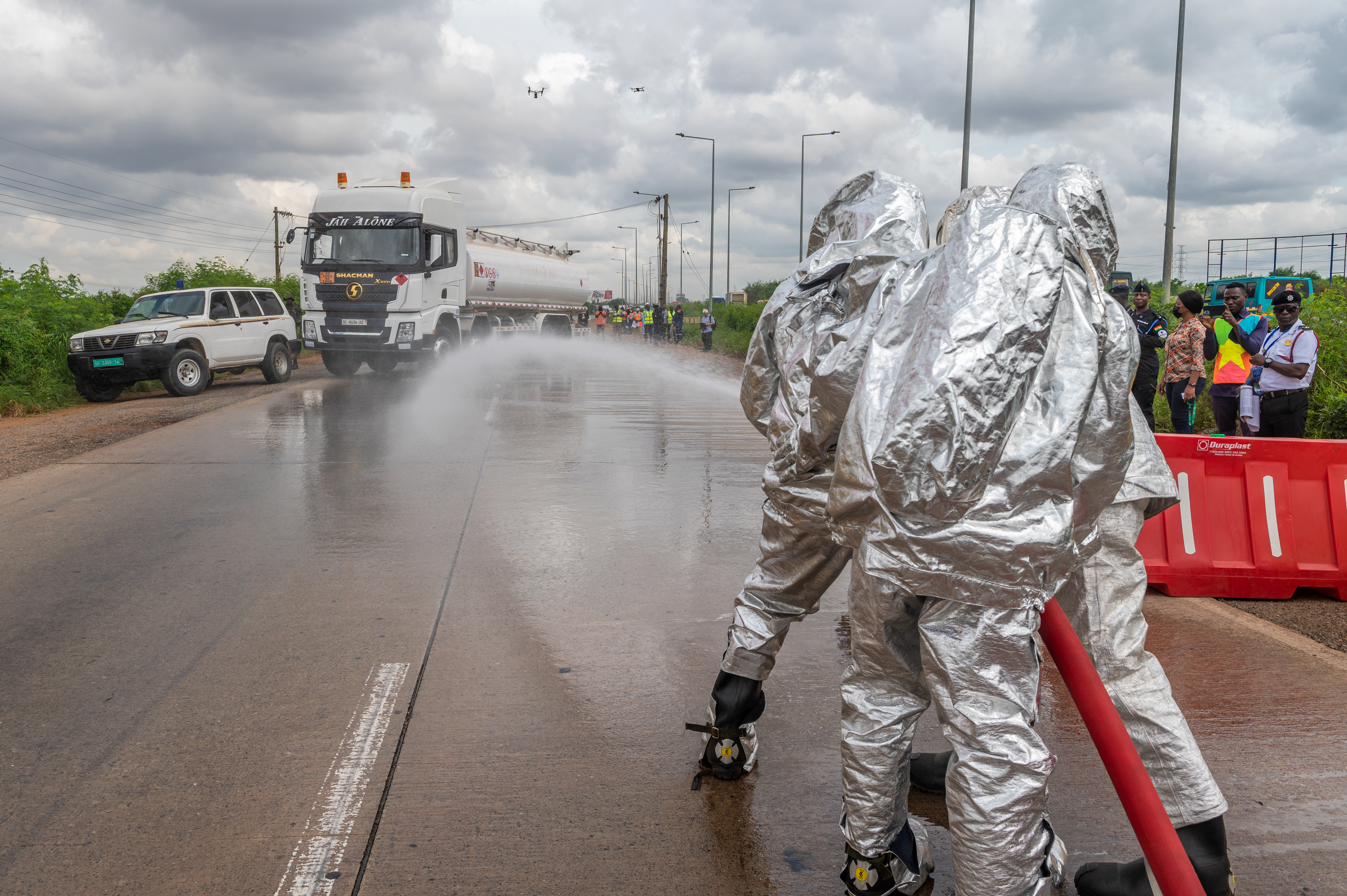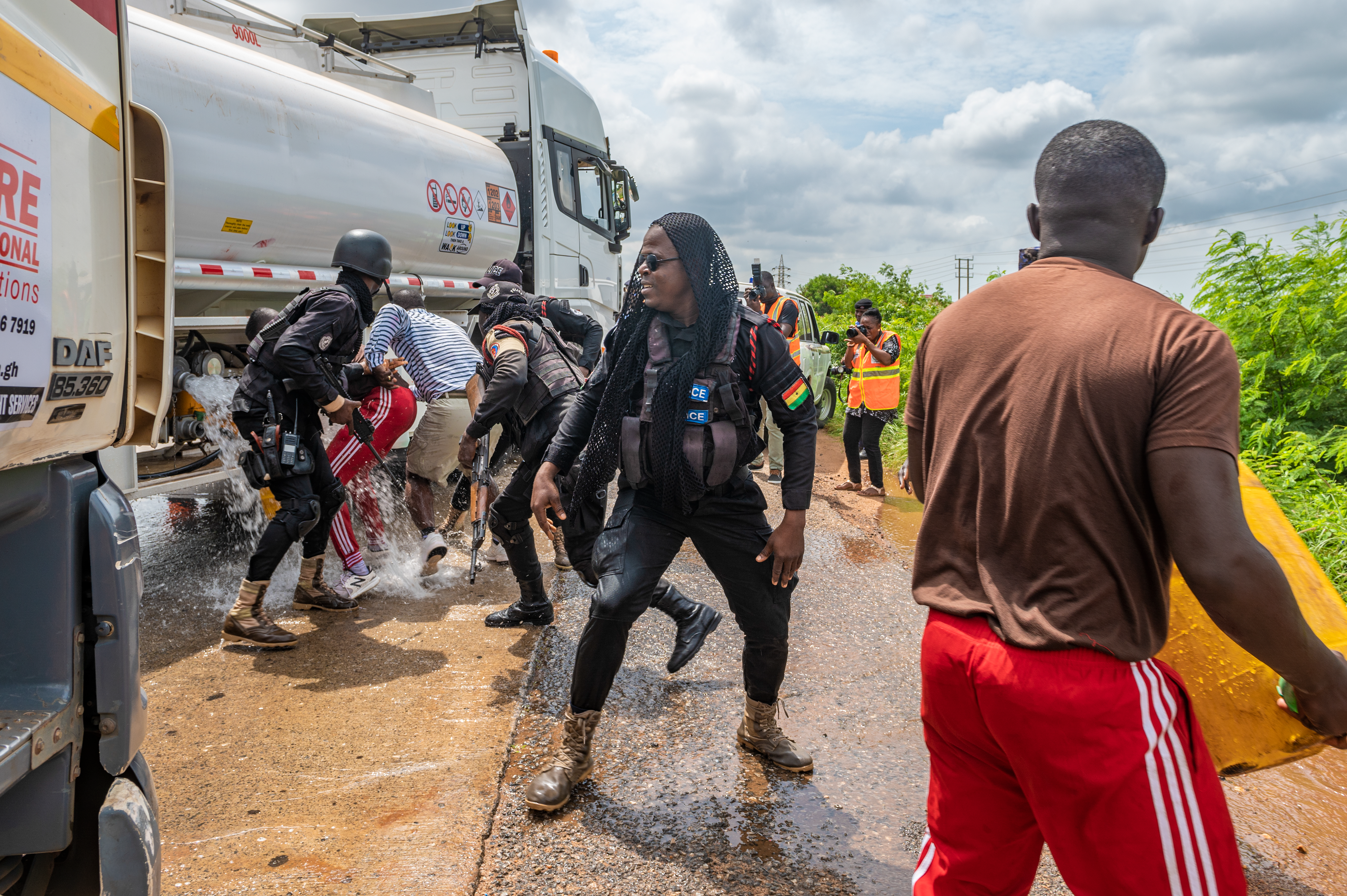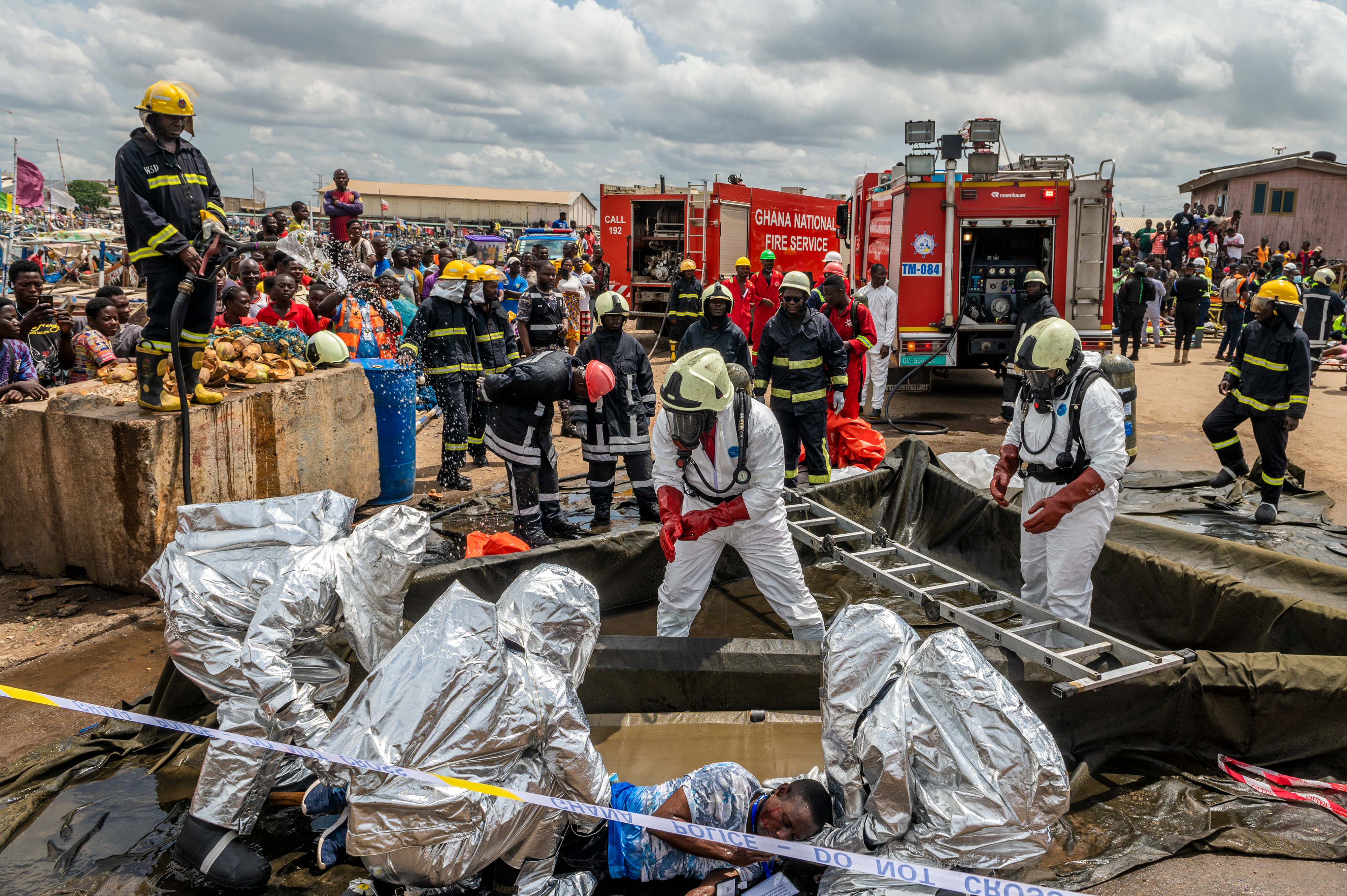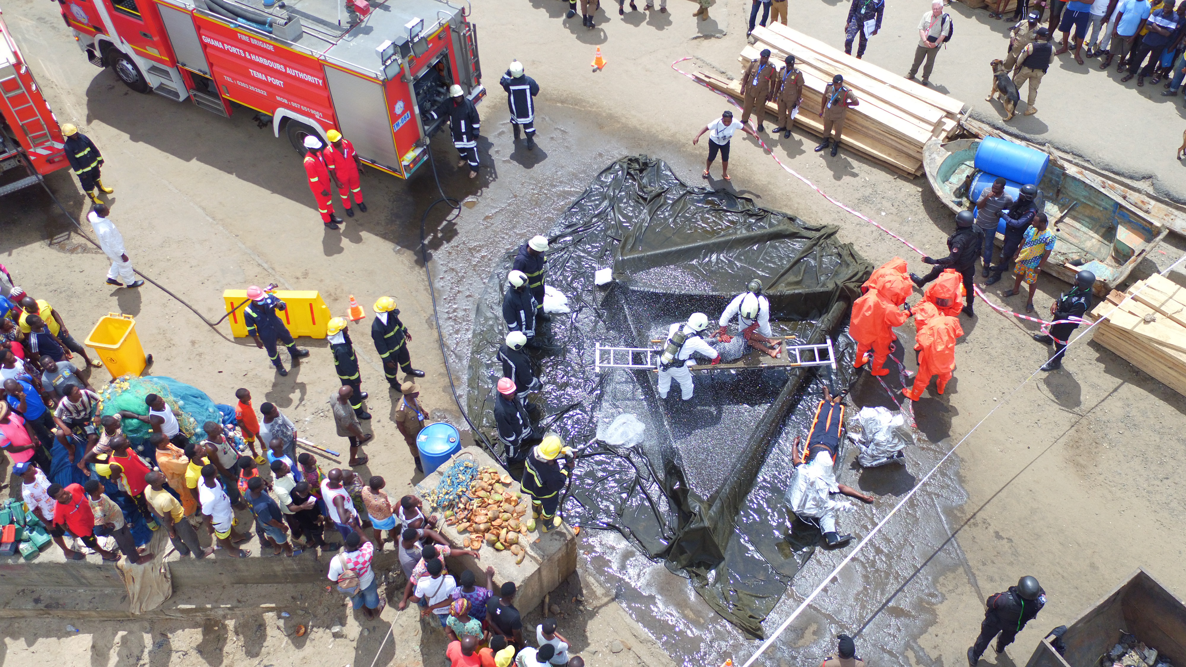 During the chaos, a group of volunteers rushed to the vehicle to steal the gas that was pouring out (replaced with water for the exercise). The Ghana Police Service worked to prevent them from stealing the simulated fuel, interfering with first responders, and from harming themselves.