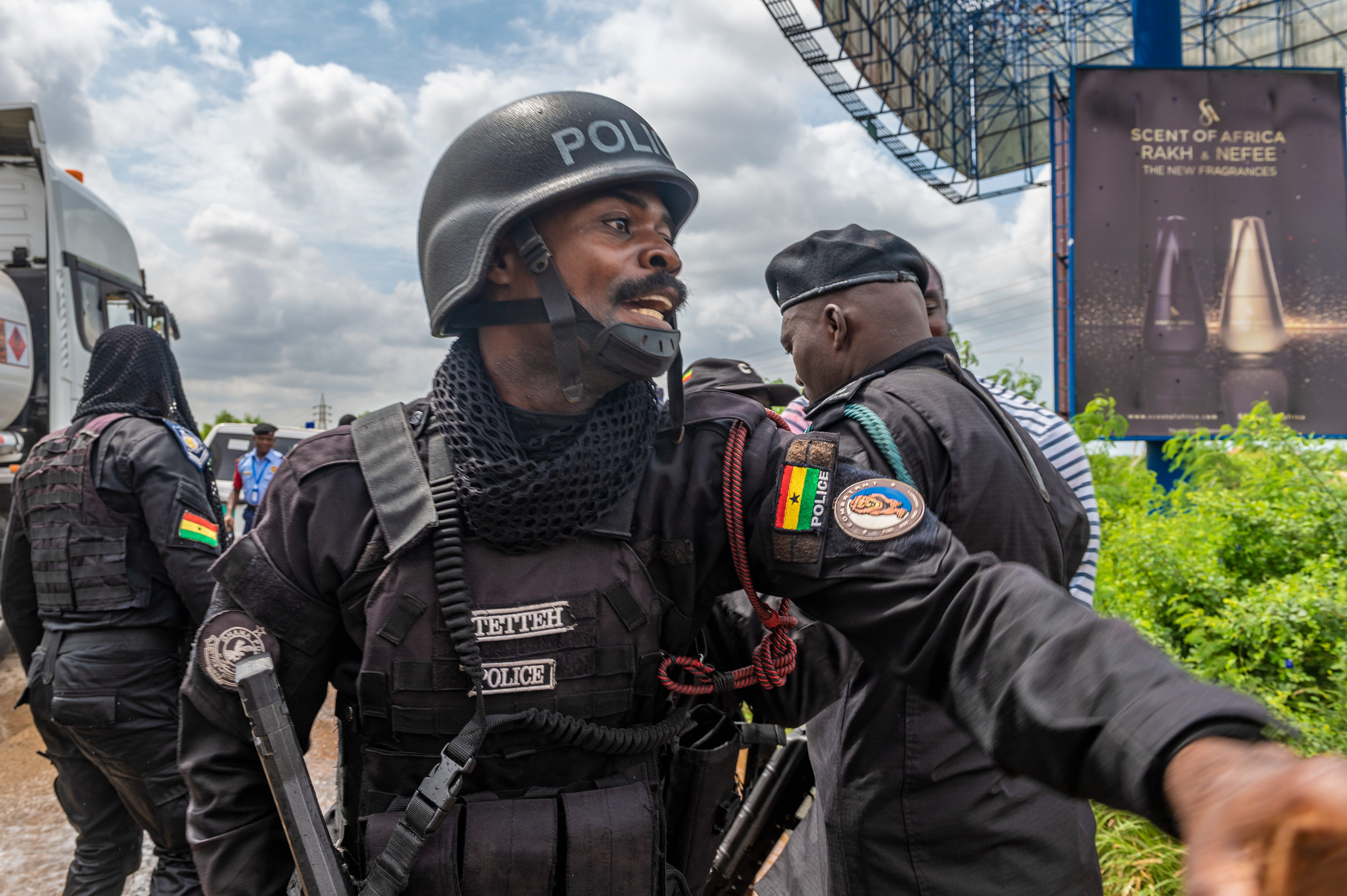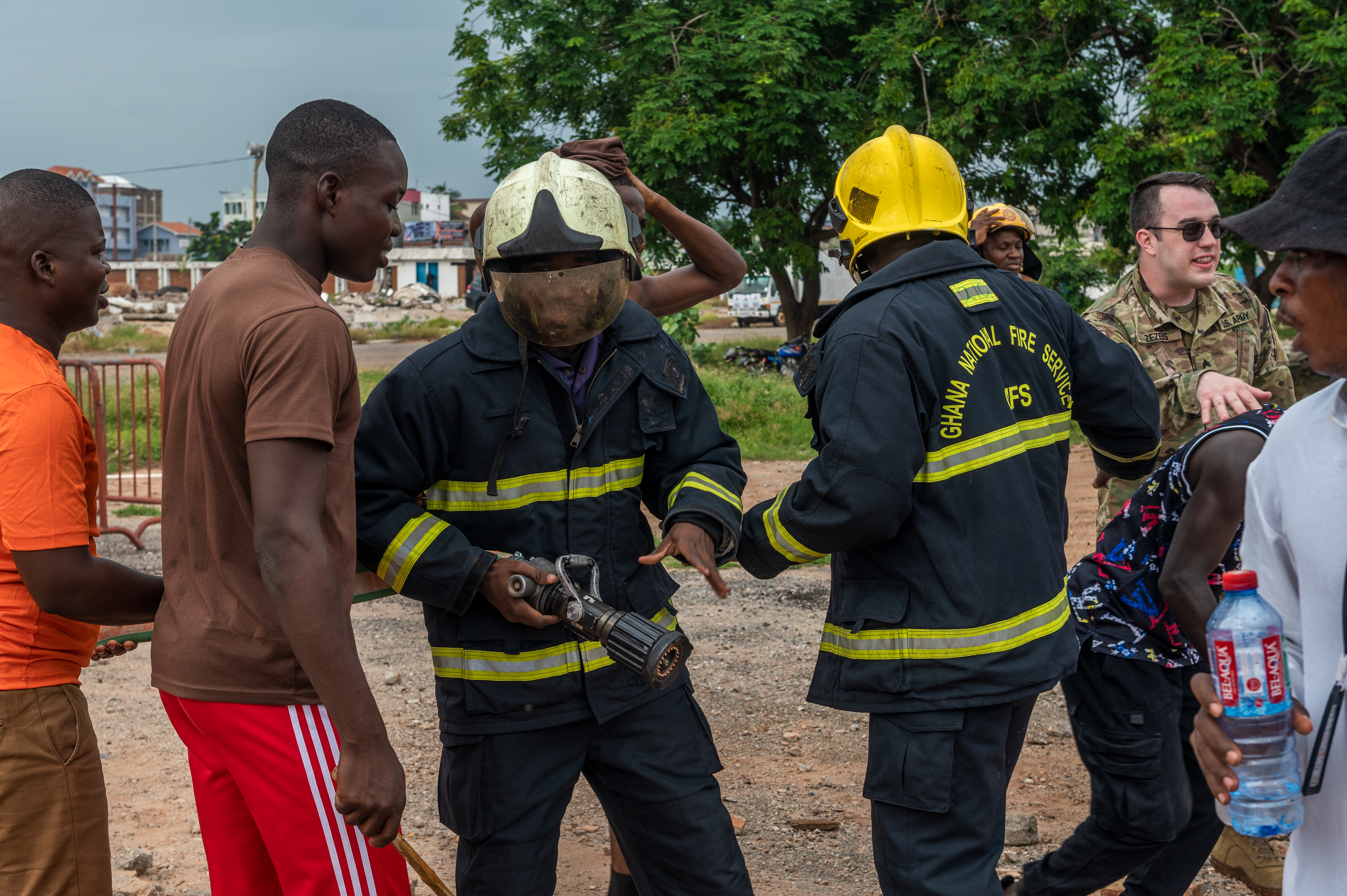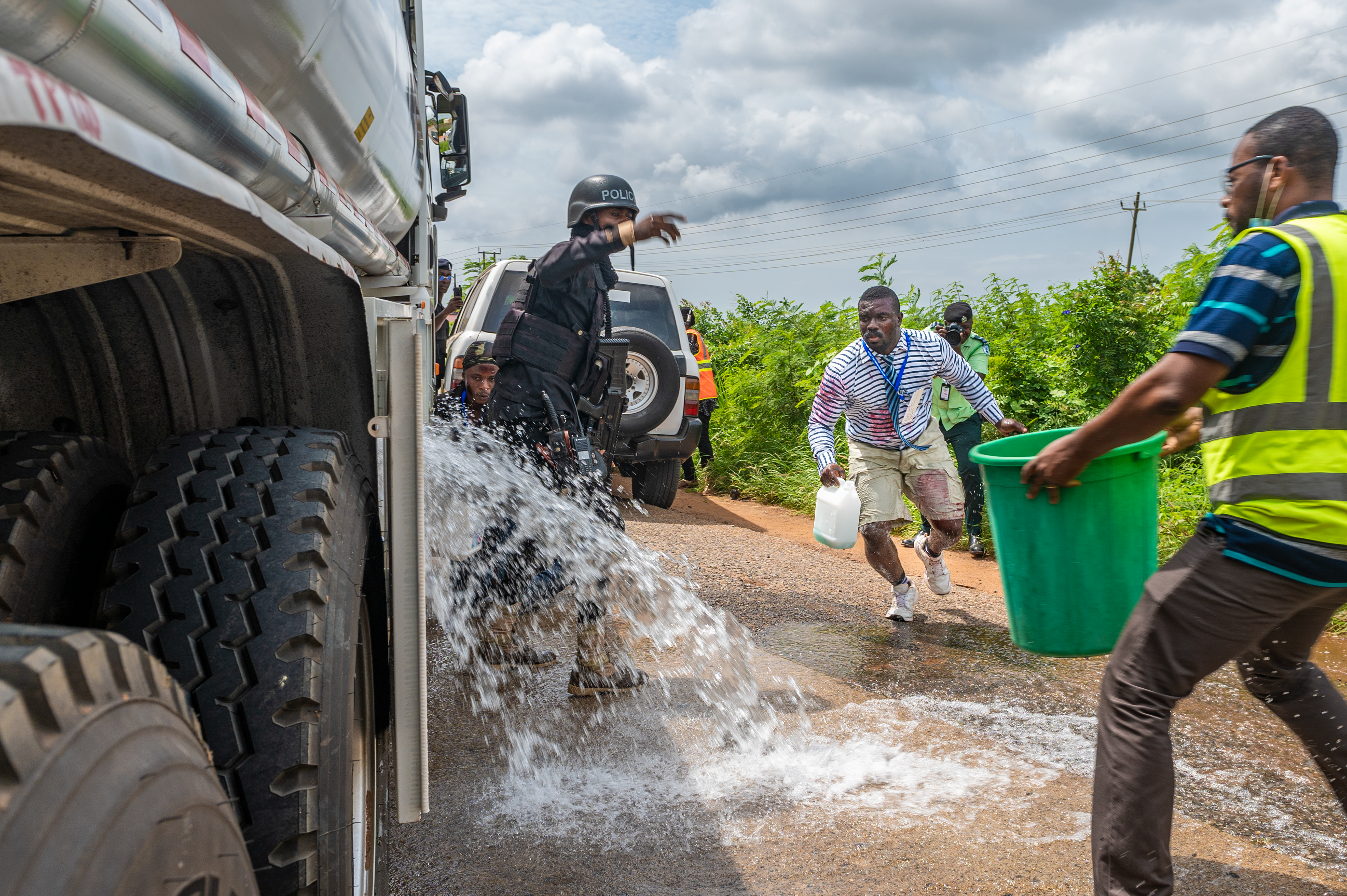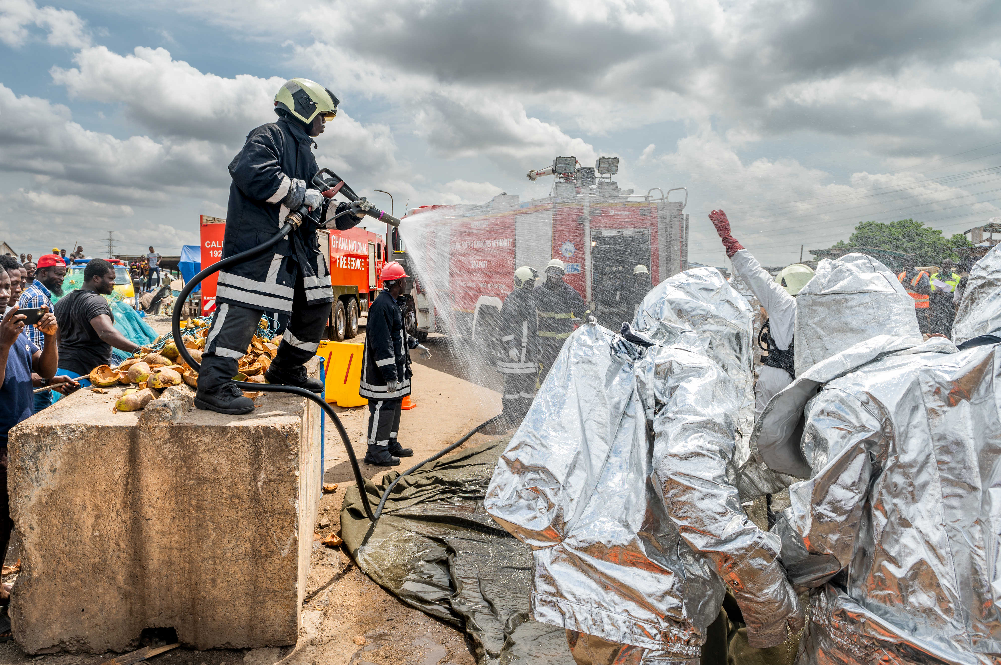 During the chaos, a group of volunteers rushed to the vehicle to steal the gas that was pouring out (replaced with water for the exercise). The Ghana Police Service worked to prevent them from stealing the simulated fuel, interfering with first responders, and from harming themselves.