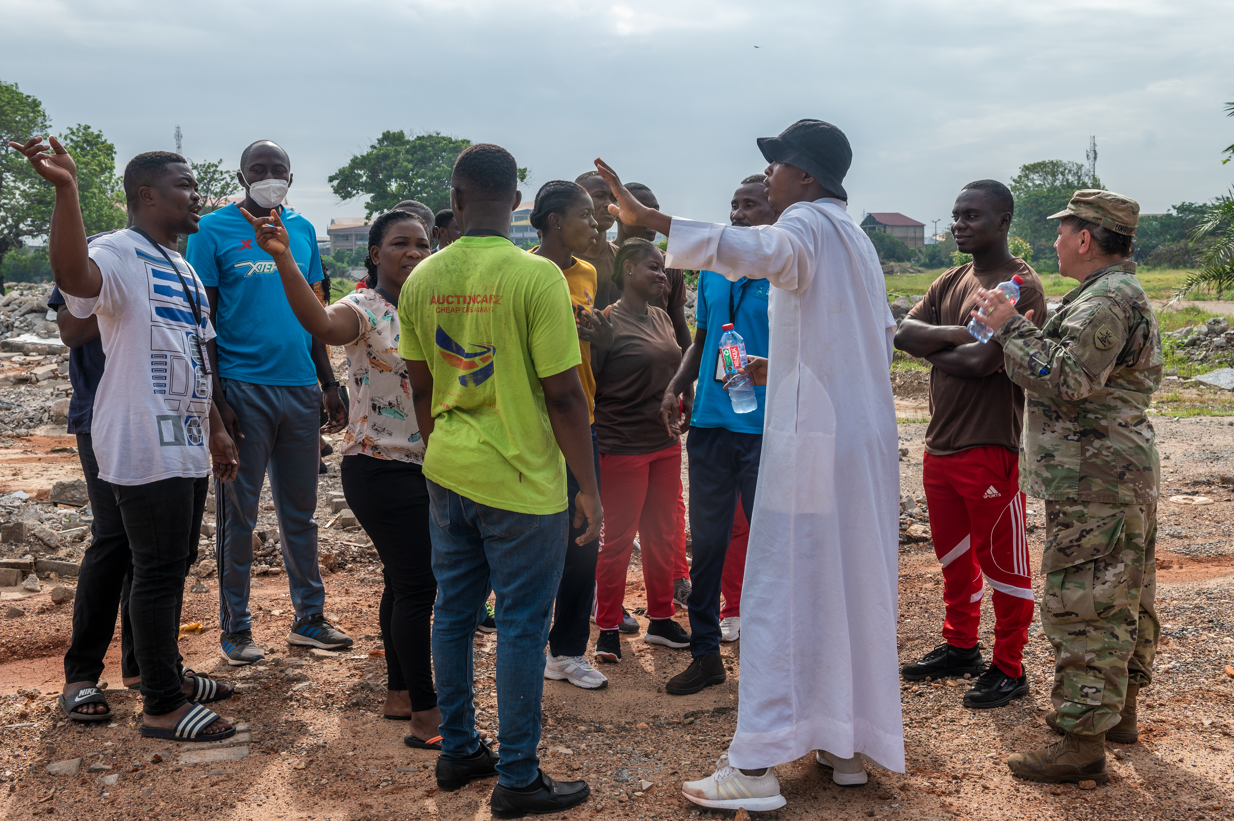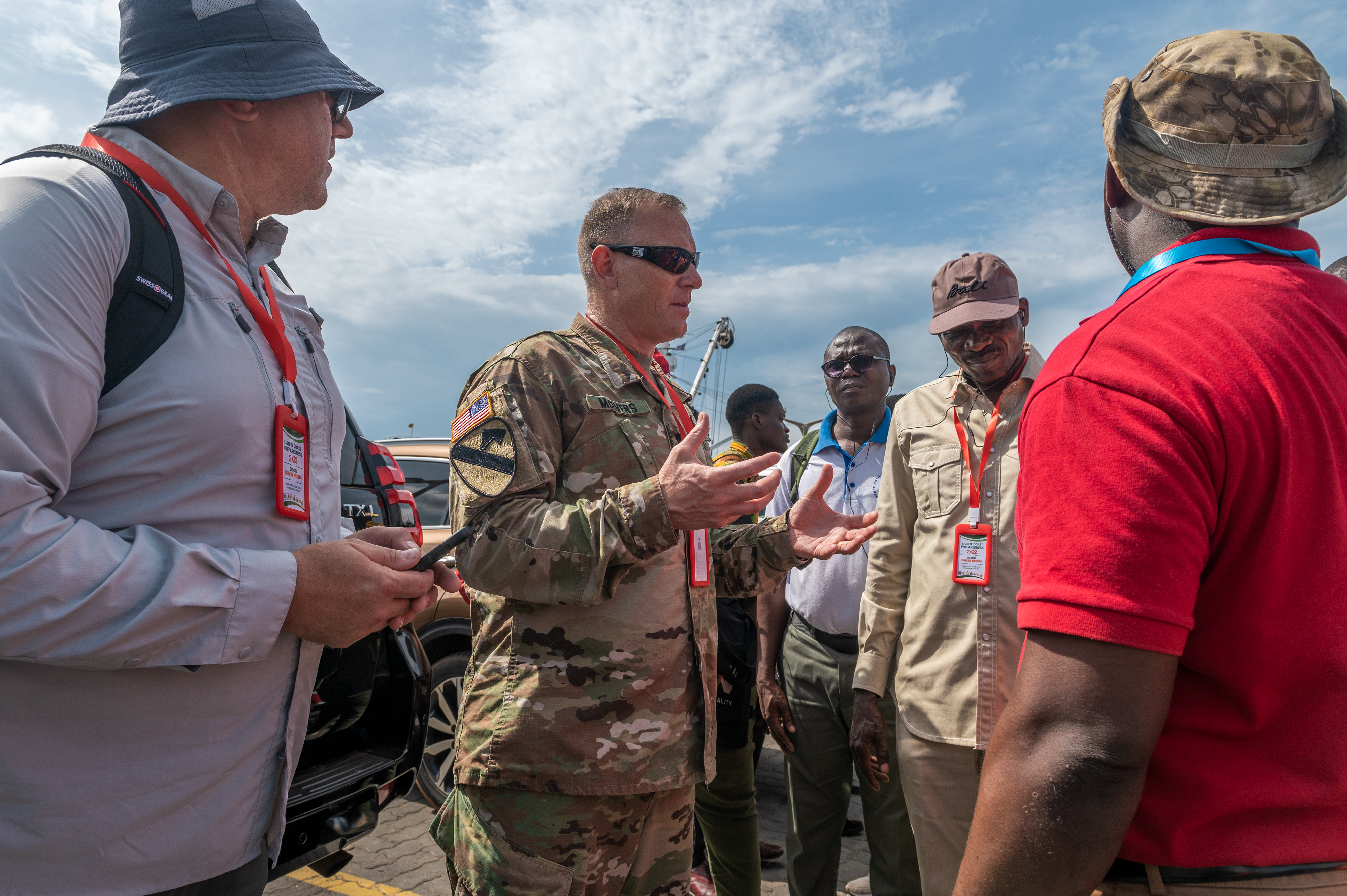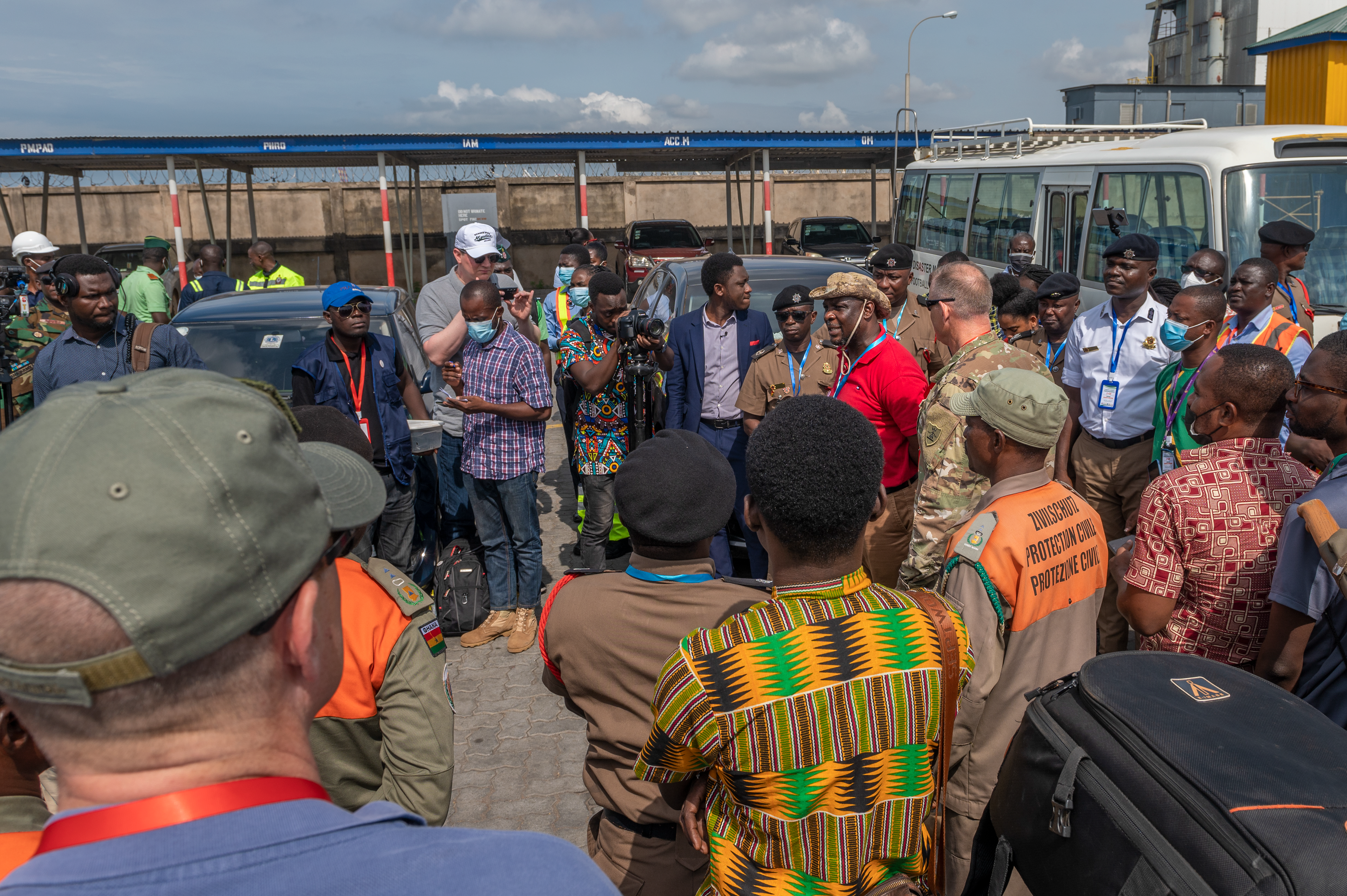 Seji Saji, Ghana National Disaster Management Organization deputy director, wearing red, and Lt. Col. Mark McEvers, N.D. National Guard State Partnership Program director, give a safety brief before the exercise begins, Tema, Ghana, June 21, 2022.