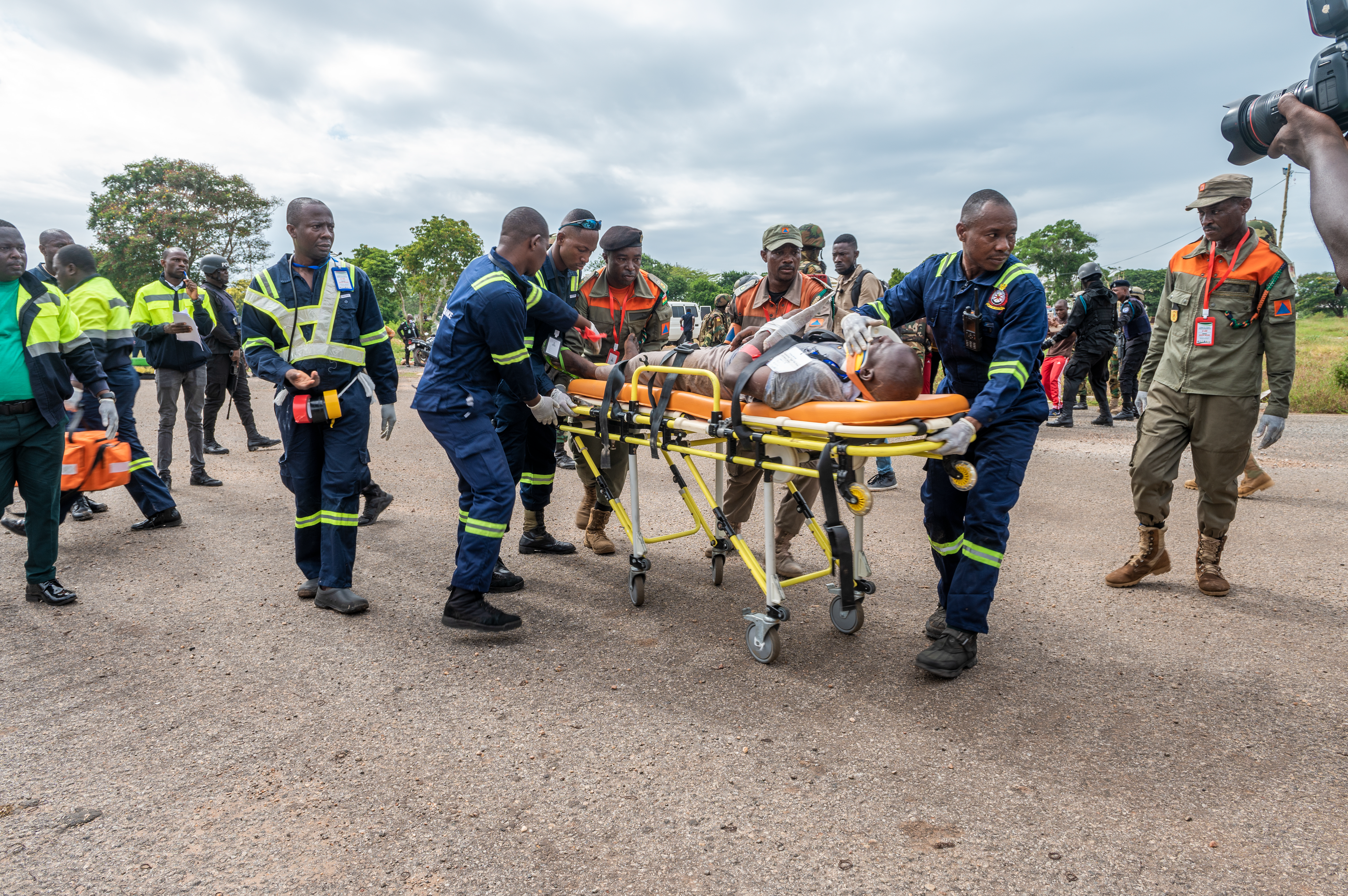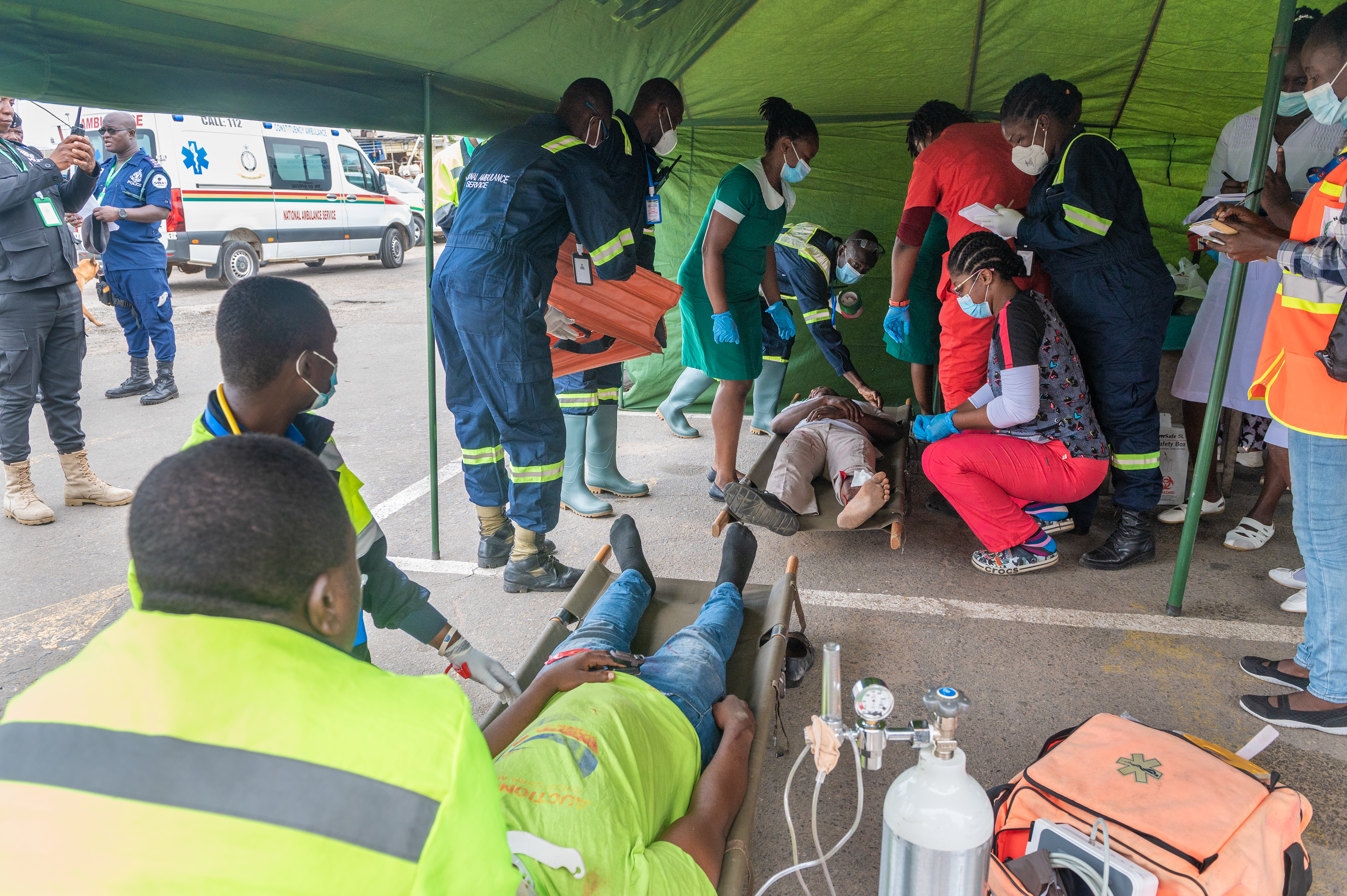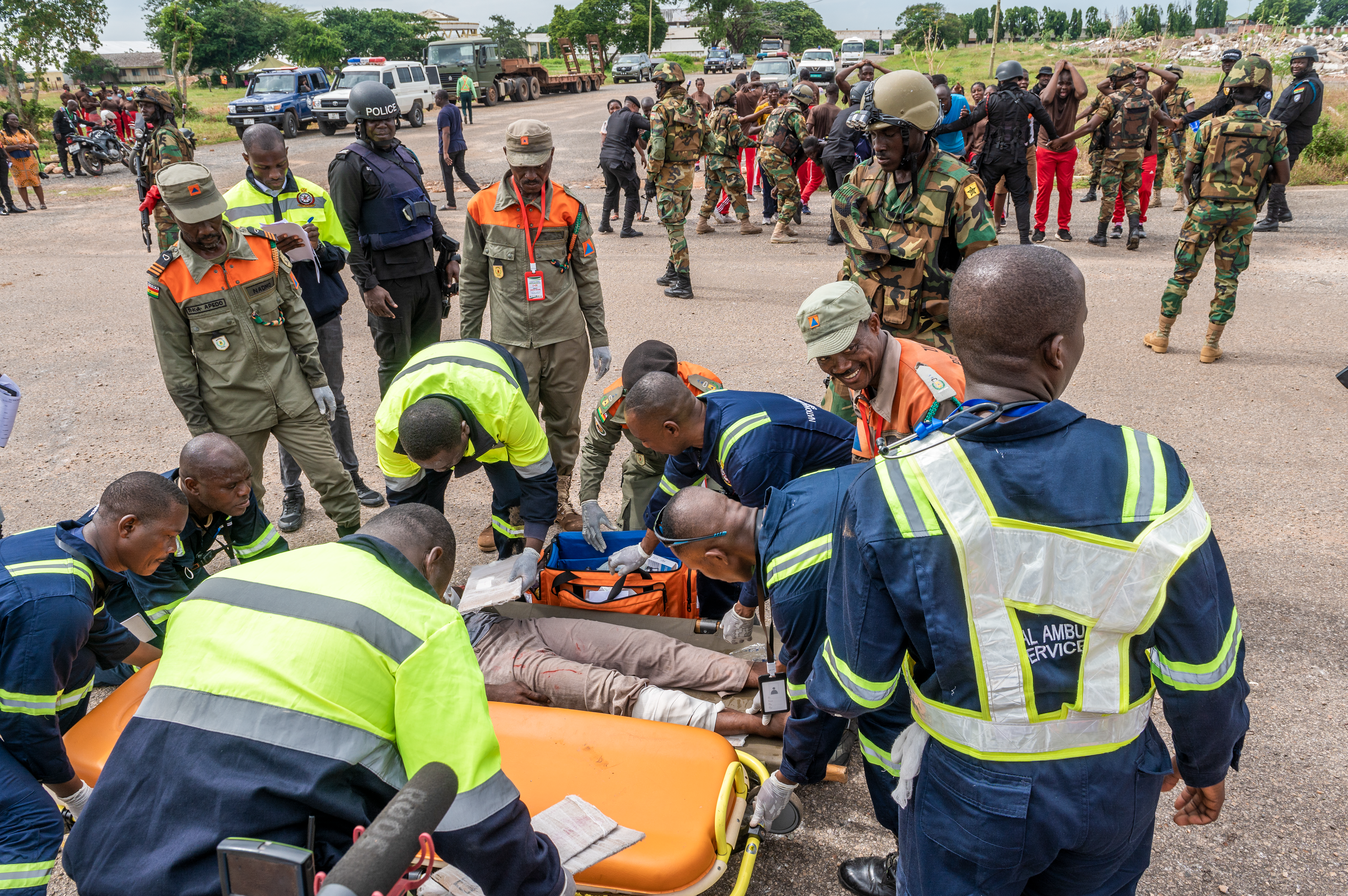 After the Ghana Police Service establish a perimeter to help control the crowd, the Ghana National Fire Service and the National Ambulance Service recovered and stabilized the simulated casualties, moving them to a decontamination area and then on to the casualty collection point. From there, the National Ambulance Service could safely triage the injured, provide aid and move victims into ambulances as needed.