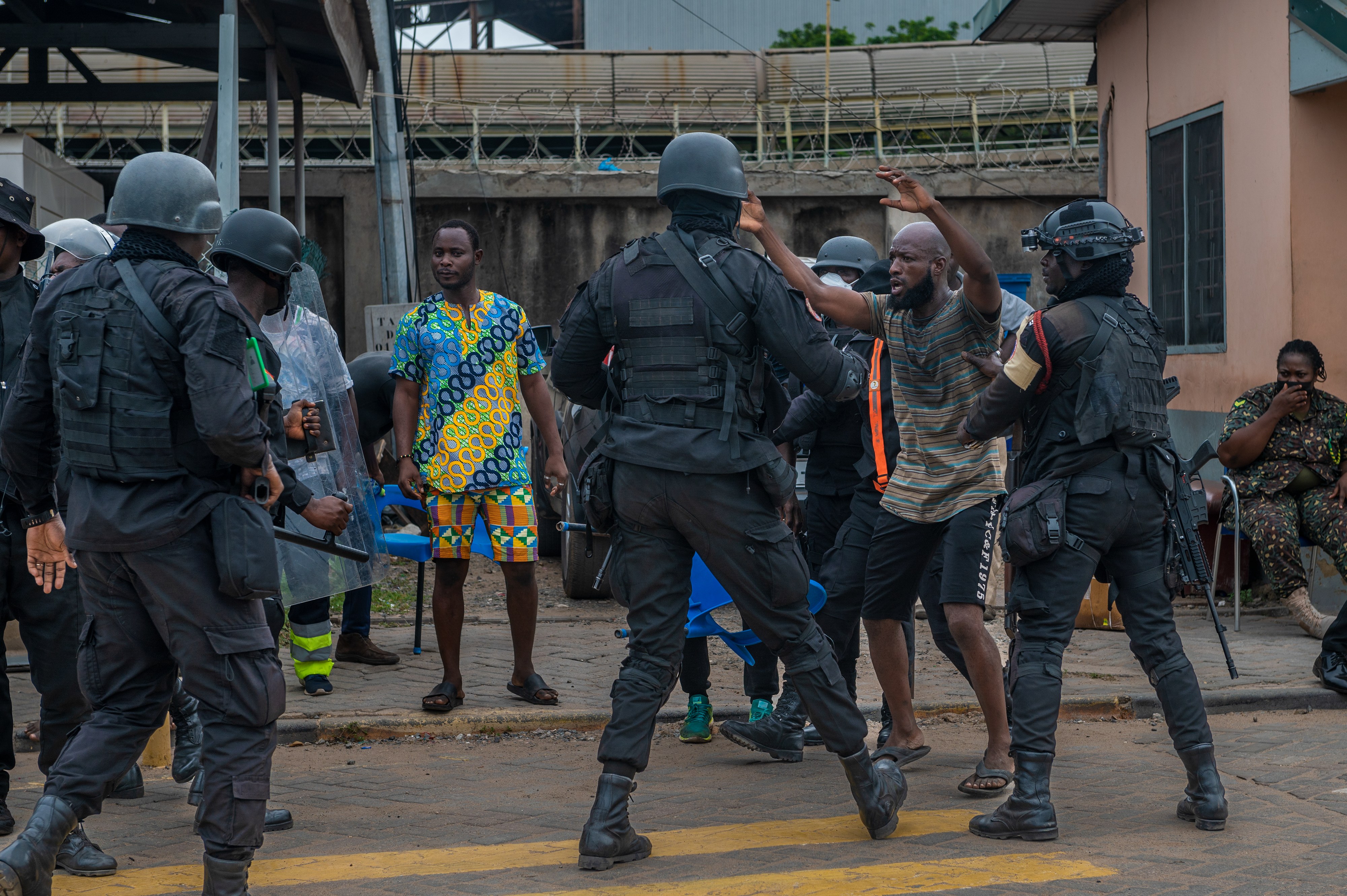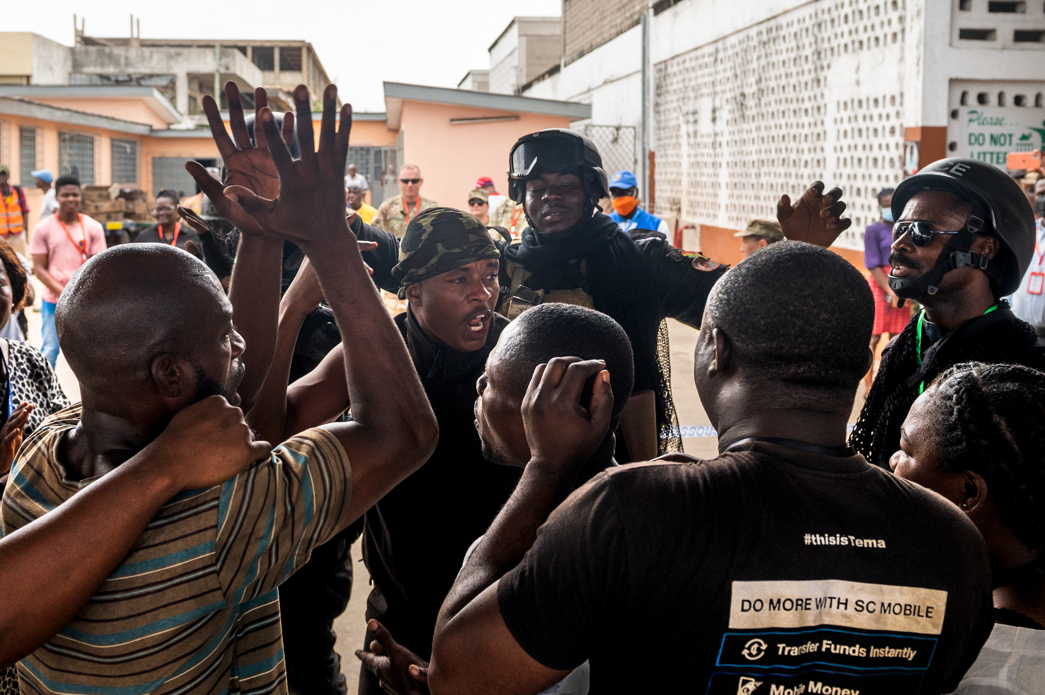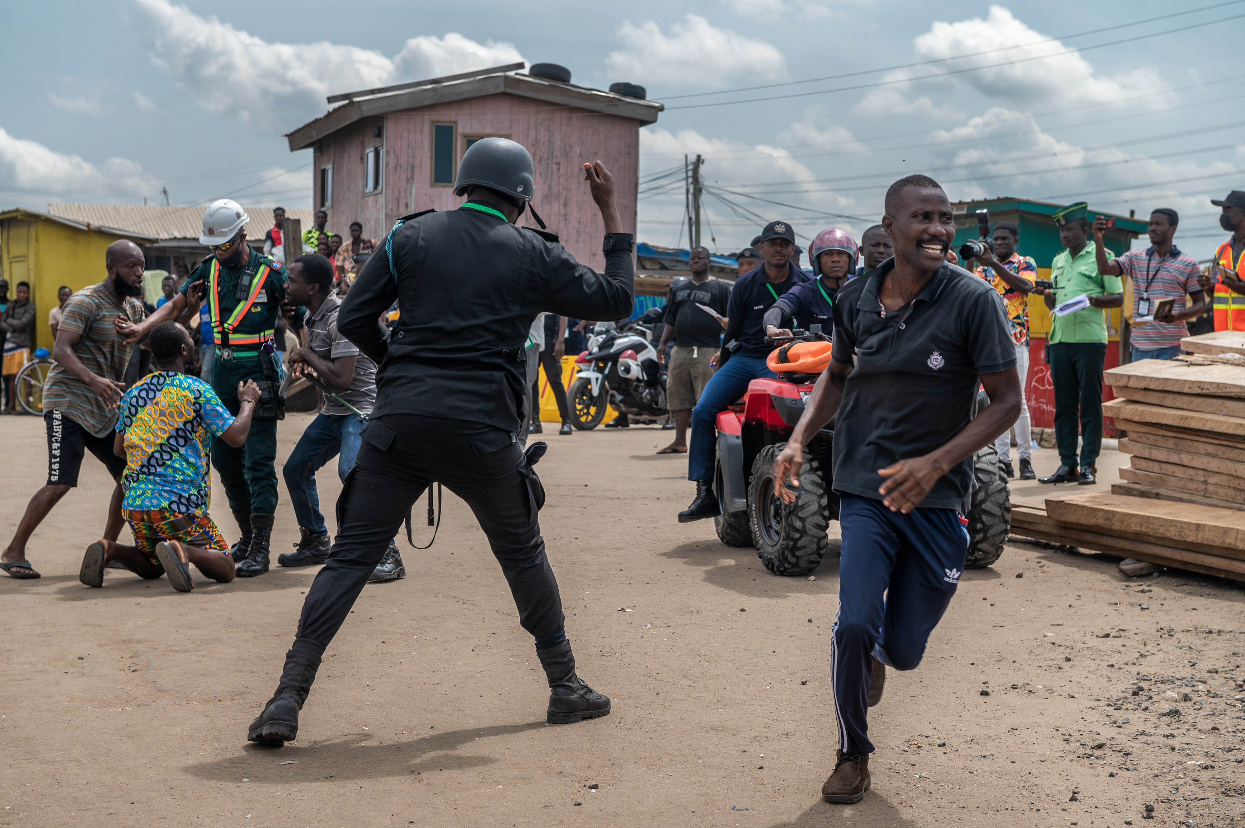 The Ghana Police Service works to control a group of volunteers pretending to be an unruly crowd in a Tema fish market during Lignite Coast 2022 Preparedness Exercise "Shikpon Wosomo", Ghana, June 21, 2022.