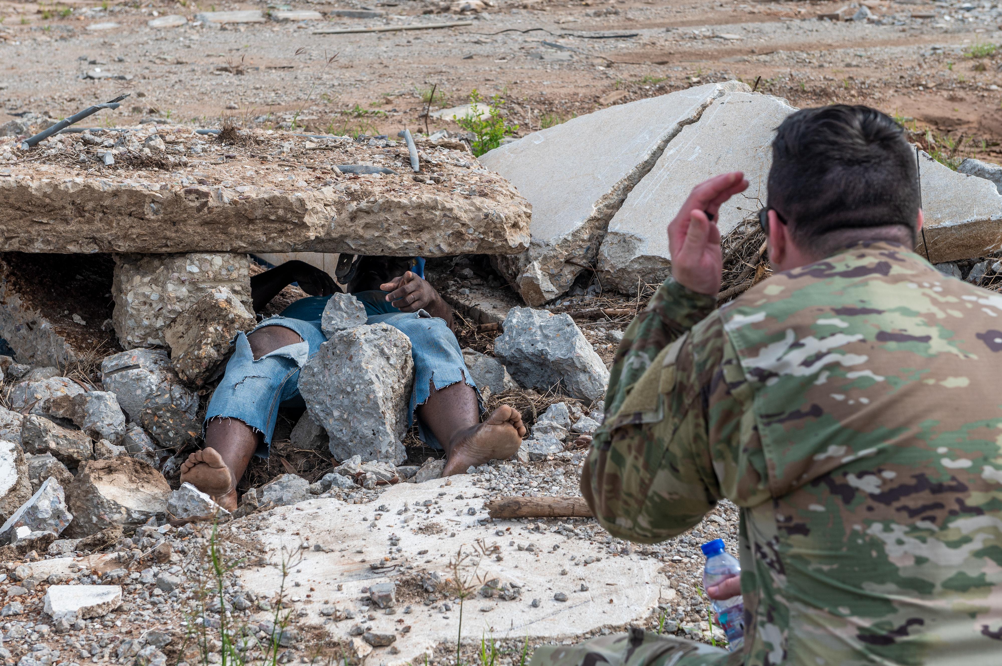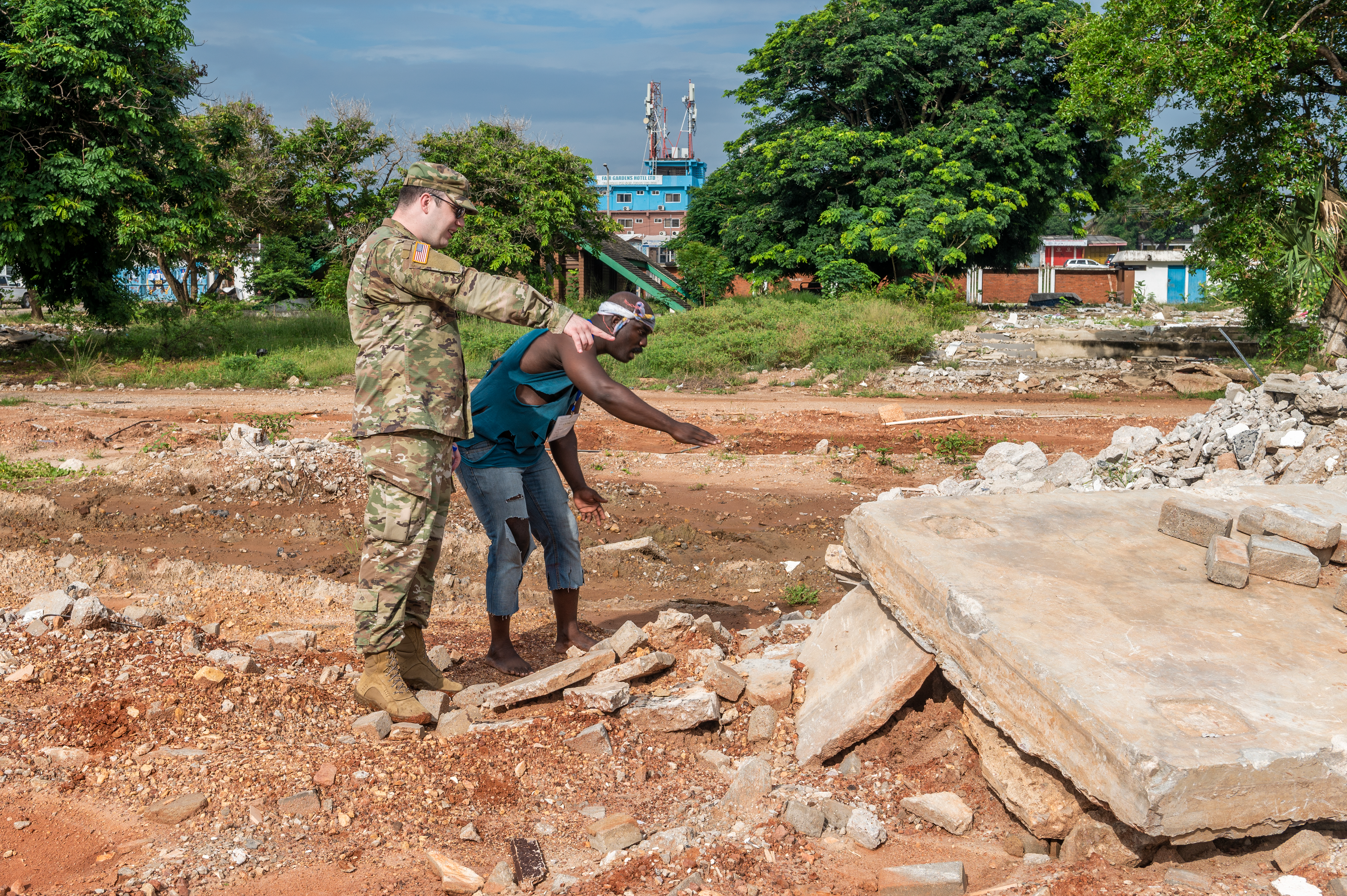 Sgt. Sam Zezeus, N.D. Army State Medical Detachment, and one of the volunteers find a safe location for him to pretend to be trapped under the rocks during Lignite Coast 2022 Preparedness Exercise "Shikpon Wosomo", Labadi, Ghana, June 23, 2022.
