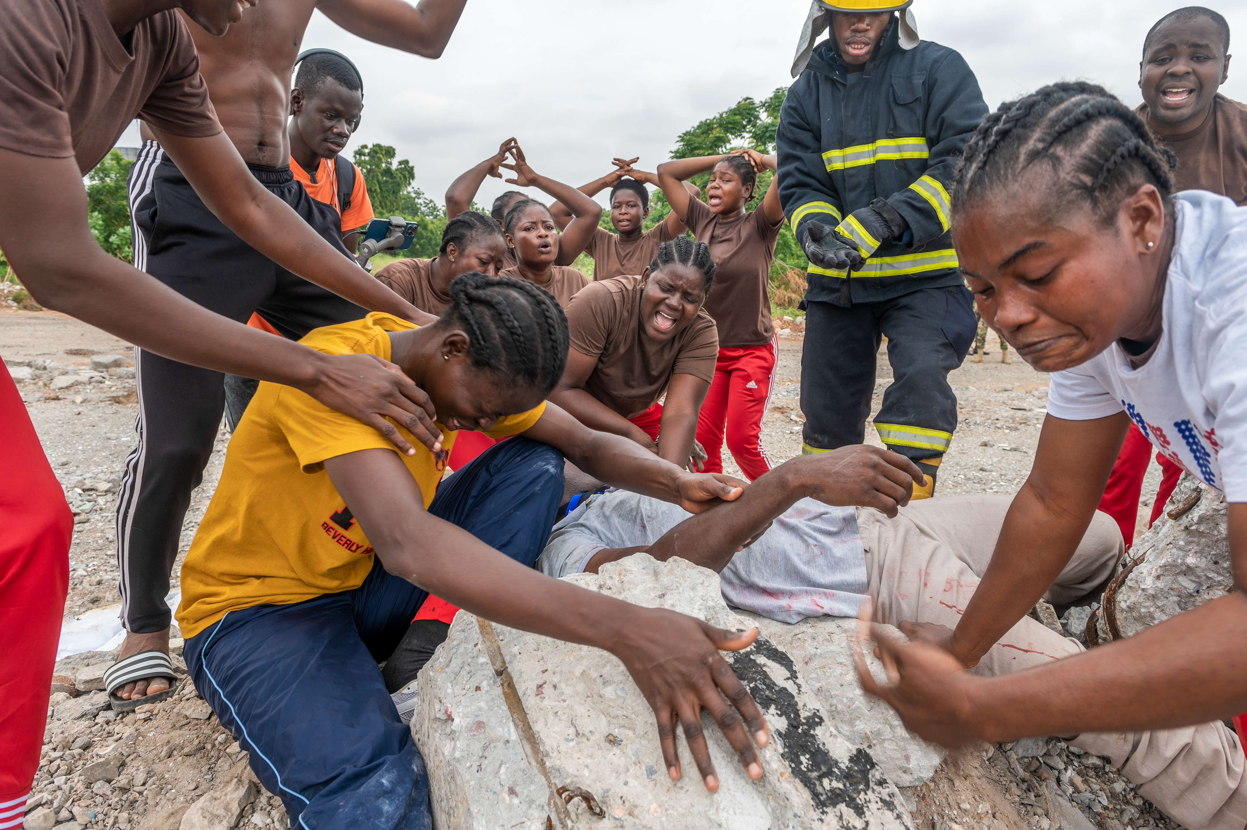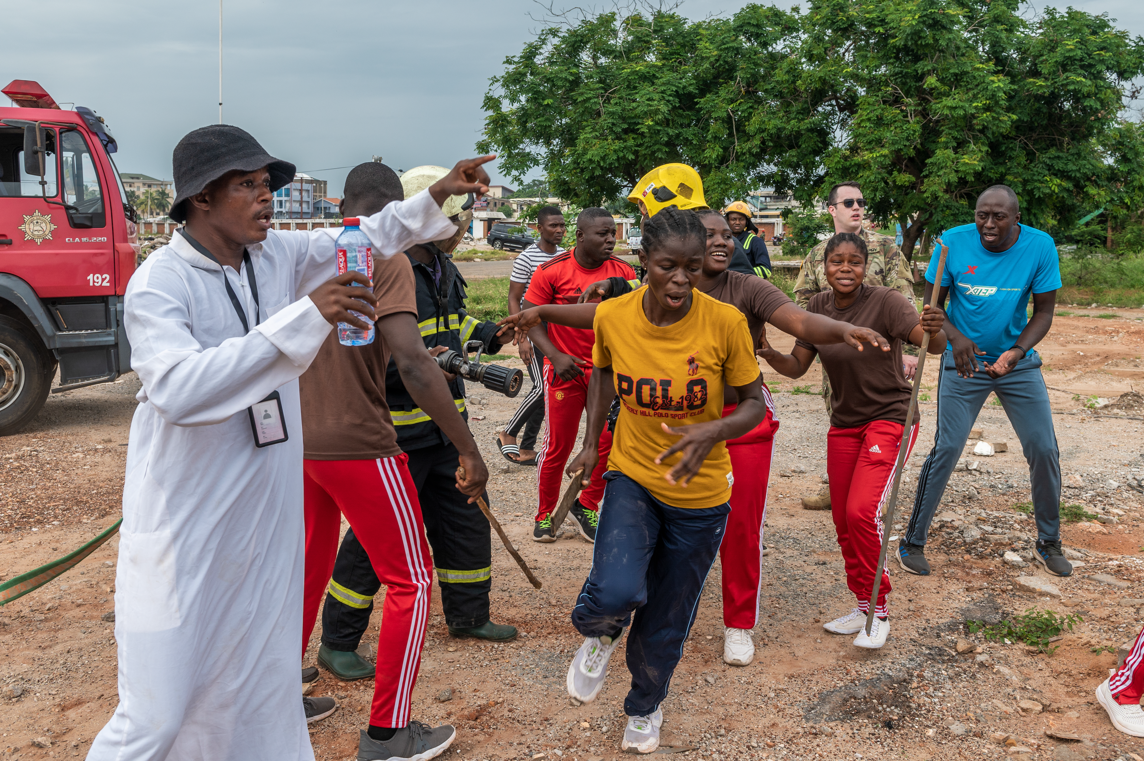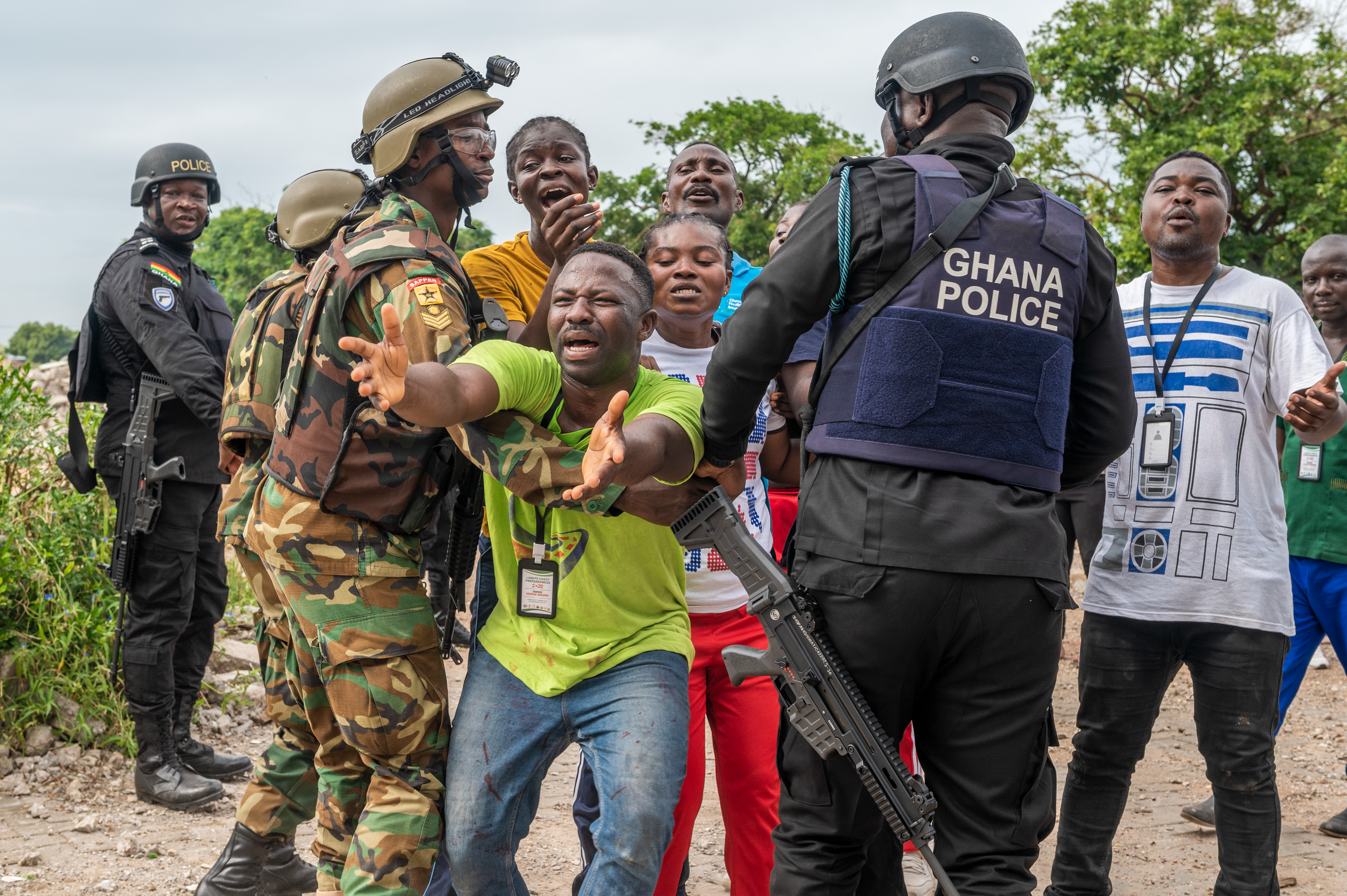 A member of the Ghana National Fire Service is overwhelmed by volunteers pretending to be panicked bystanders, who beg them to rescue their friends and family, during Lignite Coast 2022 Preparedness Exercise "Shikpon Wosomo", Labadi, Ghana, June 23, 2022.