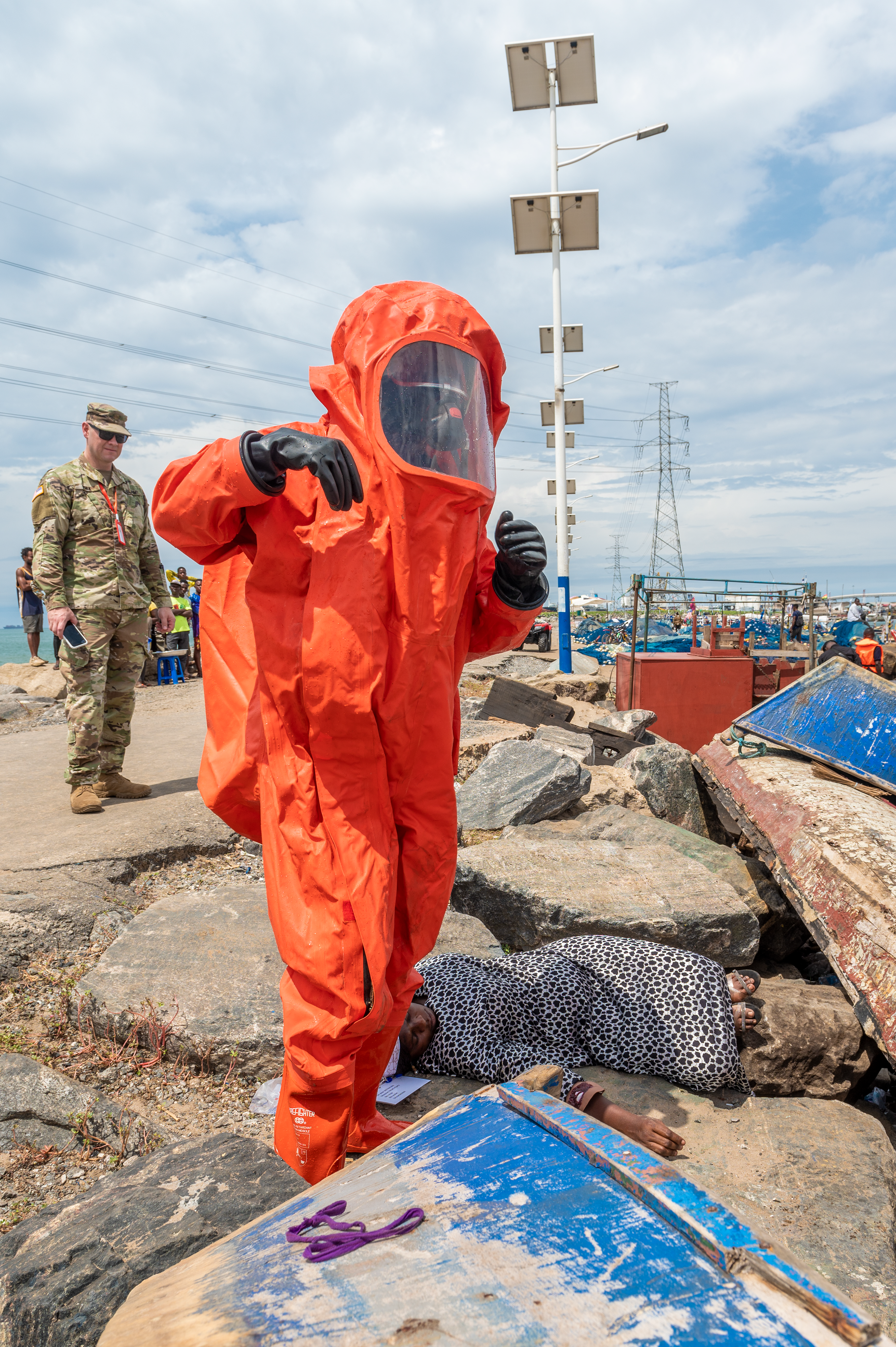 Members of the Ghana National Fire Service in HAZMAT gear locate and recover victims as Soldiers of the N.D. National Guard observe during Lignite Coast 2022 Preparedness Exercise "Shikpon Wosomo", at the Tema Canoe Harbor, Ghana, June 21, 2022.