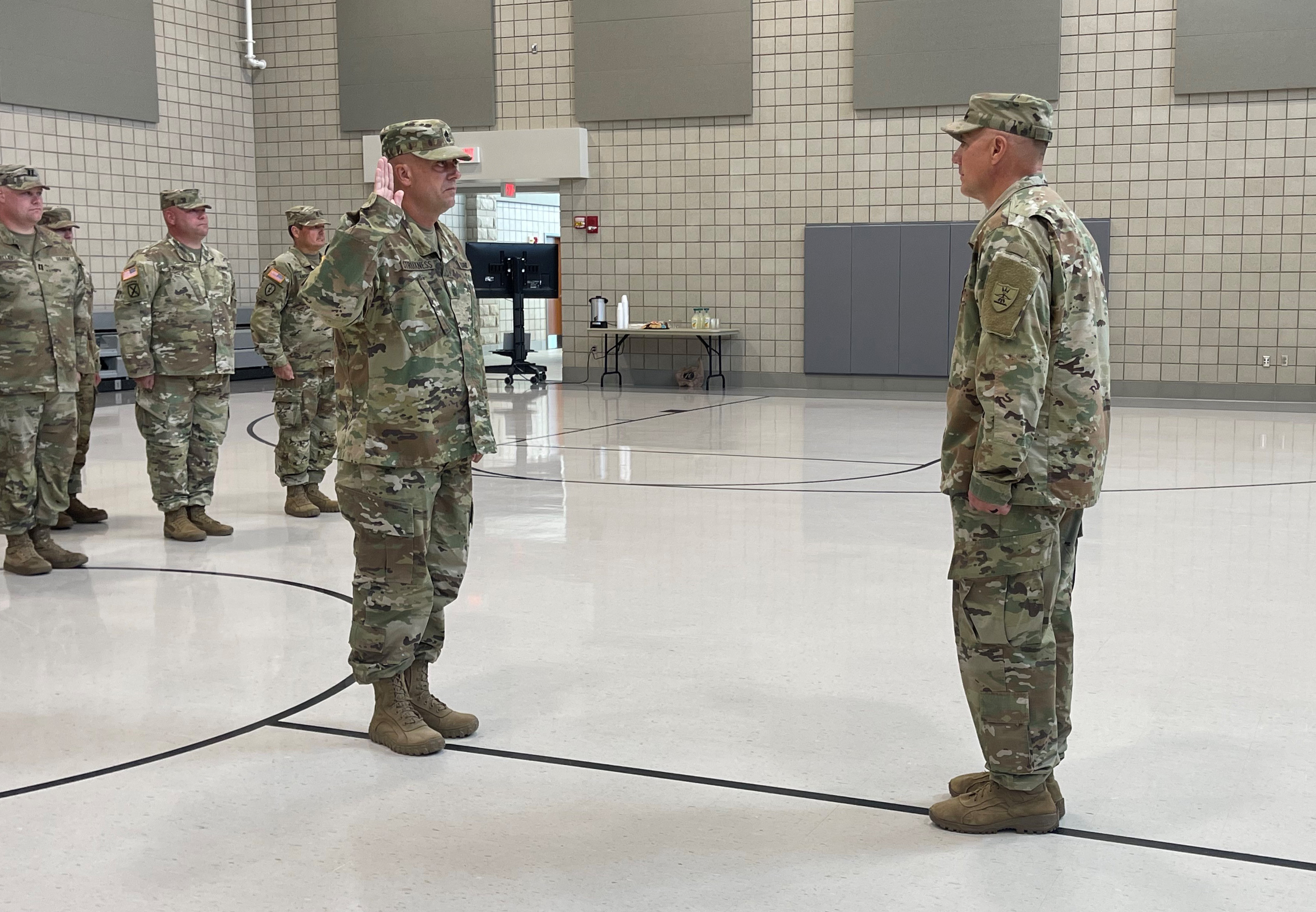 Kendall Struxness, 141st Maneuver Enhancement Brigade, was promoted to sergeant major during a ceremony, Fargo Readiness Center, Fargo, N.D., June 30, 2022. (National Guard story and photo by Maj. Lucas Klettke, 141st Maneuver Enhancement Brigade)