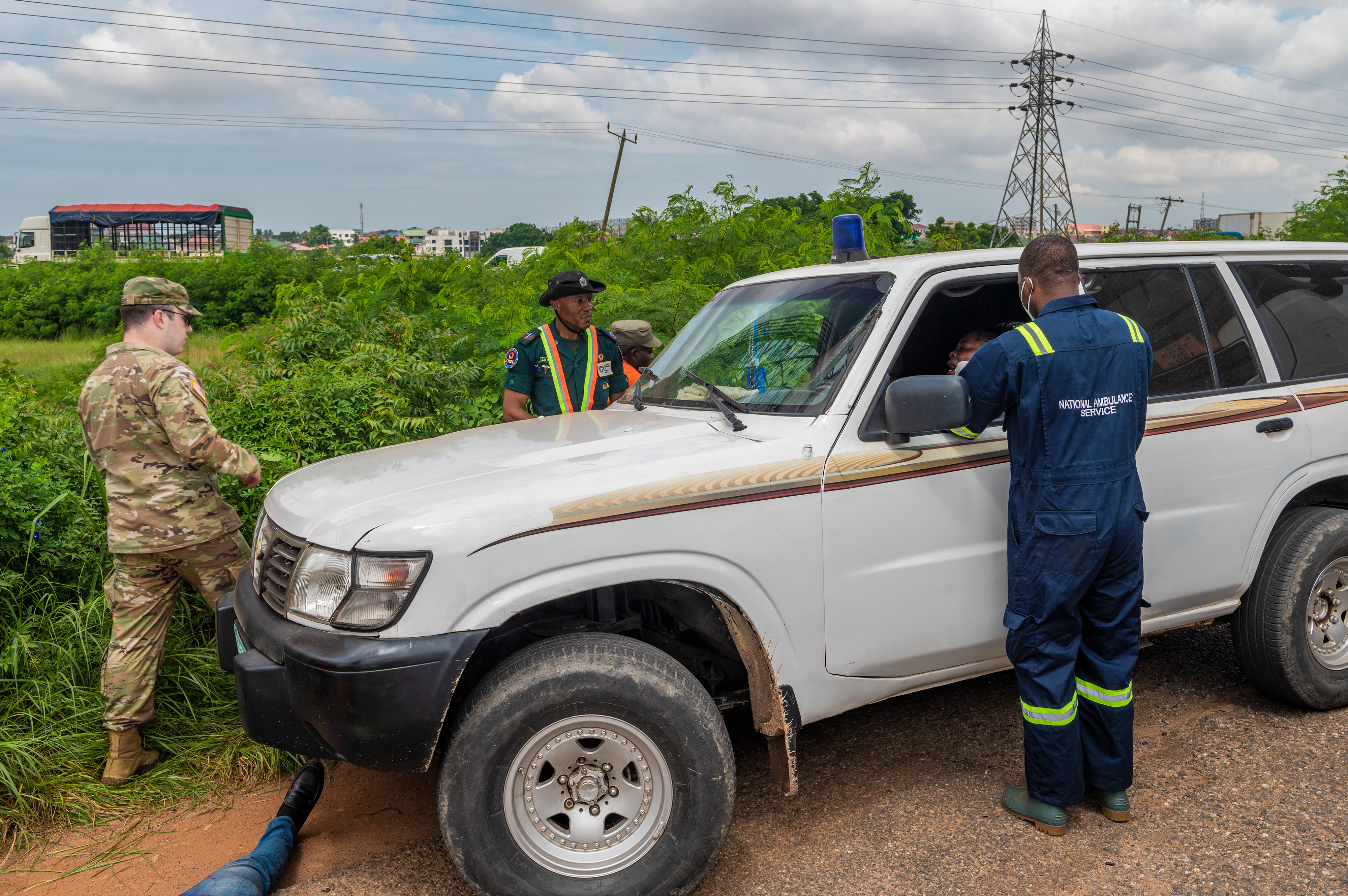 On June 22, 2022, the third exercise took place on the N1 Highway, also known as the George W. Bush Highway, one of the busiest motorways in the country. In this scenario, a truck carrying hazardous material broke down on the highway during the earthquake, causing an accident resulting in several victims. Traffic was rerouted off of the highway to clear the area. Because of the hazardous material threat, the Ghana National Fire Service provided the Incident Commander, working with the other agencies to ensure the safety of the first responders.