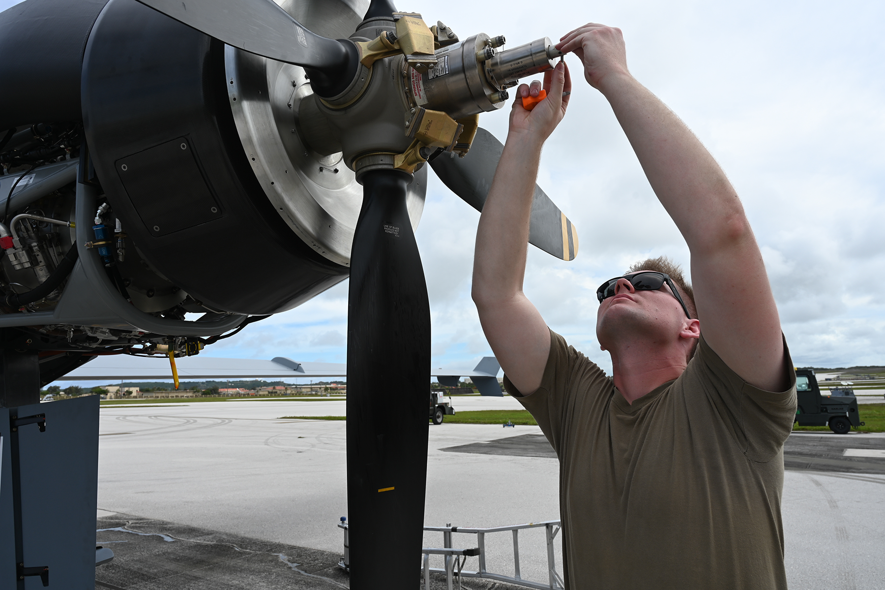 A 119th Wing aircraft maintainer adjusts the propeller of an MQ-9 Reaper as part of pre-flight checks at Andersen Air Force Base, Guam, during Exercise Valiant Shield May 27, 2022.