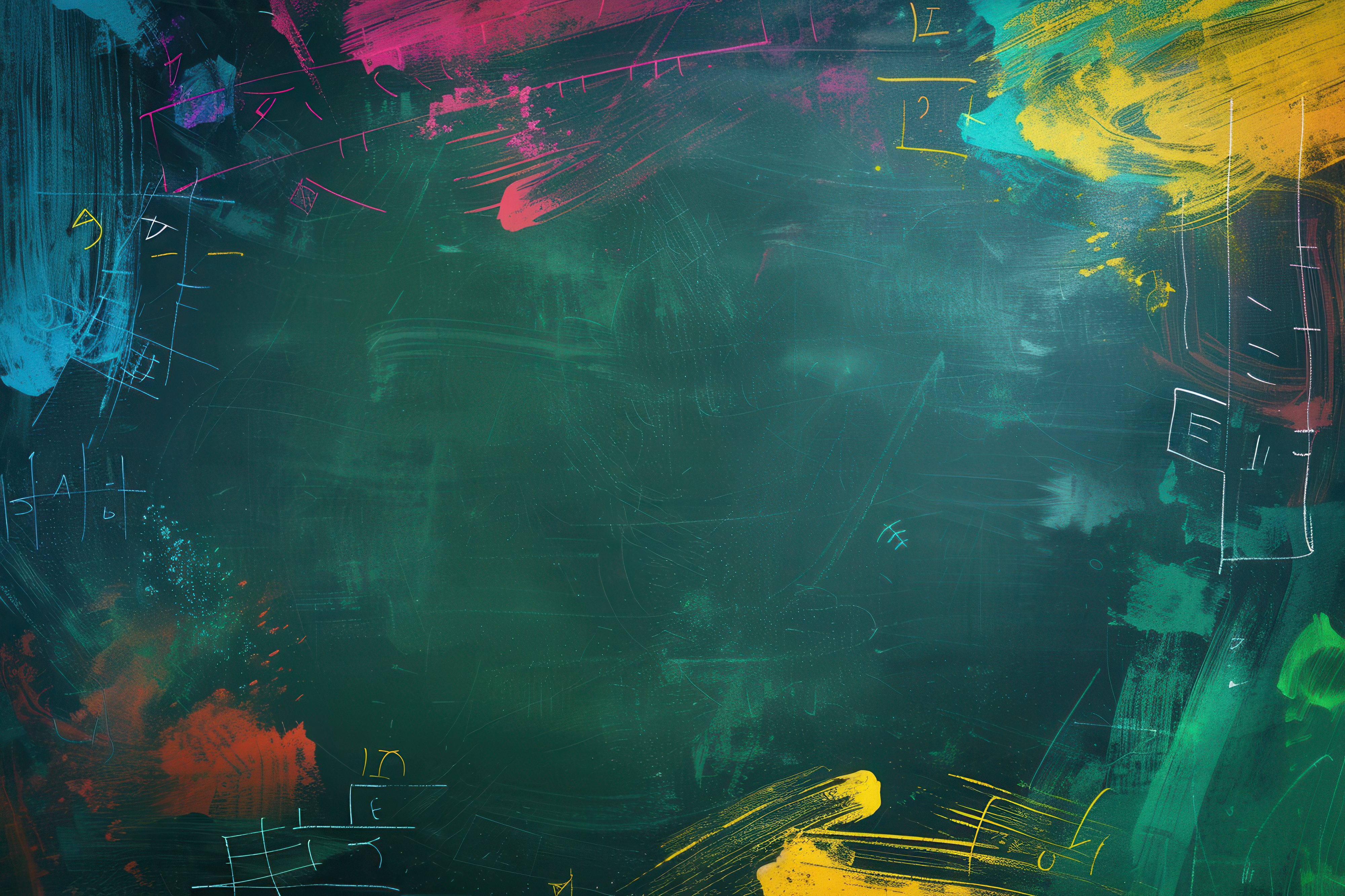 Created with an image by Анатолий Сав - "Vibrant brushstrokes of various colors are artfully spread across a dark green chalkboard in a creative classroom setting. Generative AI"