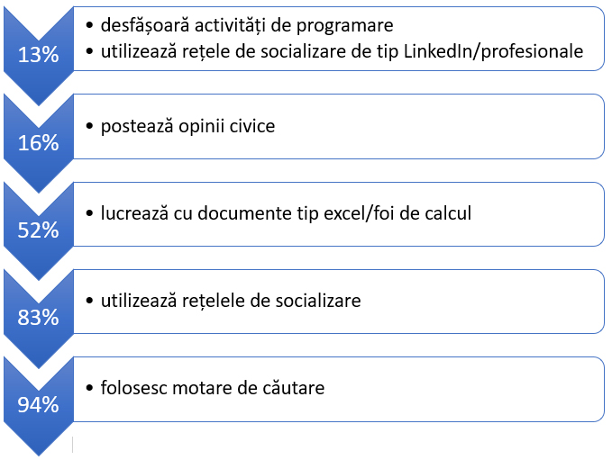 În timp ce accesul la internet a devenit aproape un bun universal (fără a fi încă gratuit), modul în care beneficiem de oportunitățile oferite de acesta este însă foarte diferit. Astfel, descoperim cu îngrijorare că 44% din toți cetățenii UE nu au competențe digitale de bază (peste 70% în România!). Și dacă totuși vă gândiți că problemele sunt cu populația mai învârstă și nu cu tinerii, iată câteva date despre cum cei din urmă (până în 30 de ani) folosesc internetul și calculatorul: