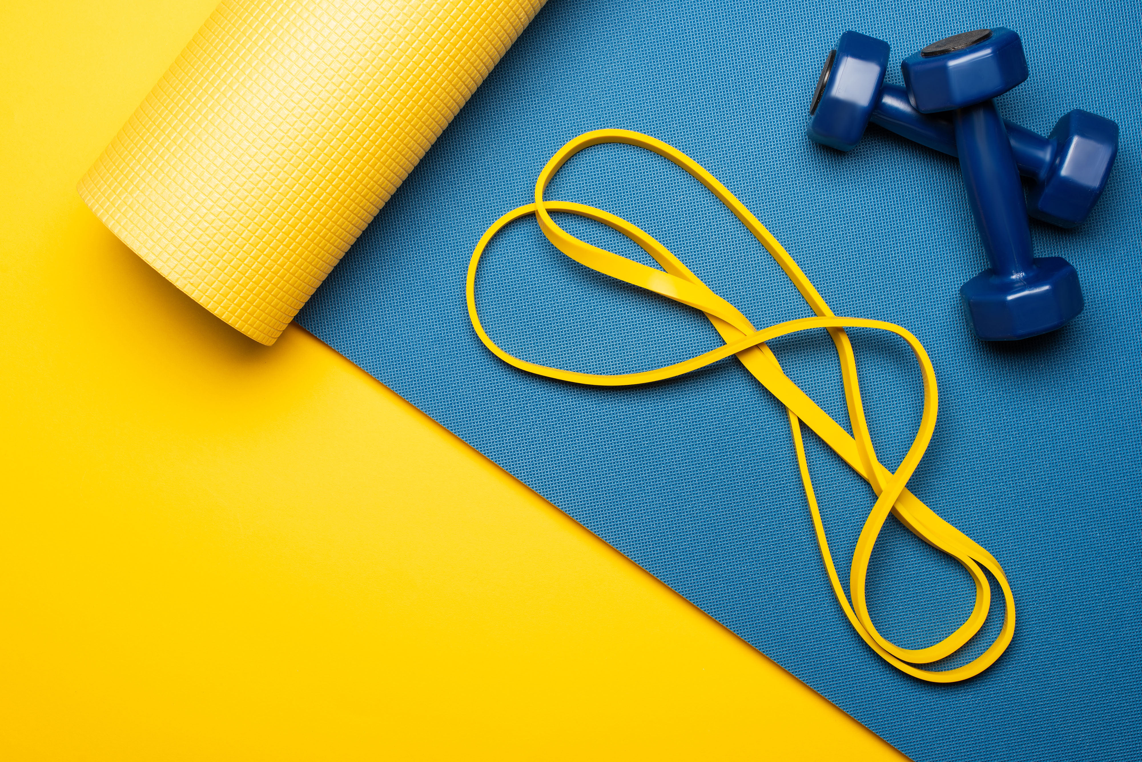 Created with images by Andrii Zastrozhnov - "Blue hole in white paper.,Empty space for text." • Zerbor - "Fitnessausrüstung auf dunklem Hintergrund" • bongkarn - "3D rendering, dumbbells on the floor in concept fitness room with training equipments in the back" • New Africa - "Set of fitness inventory on floor near brick wall.,Space for text" • LIGHTFIELD STUDIOS - "top view of blue fitness mat with dumbbells and resistance band on yellow background"