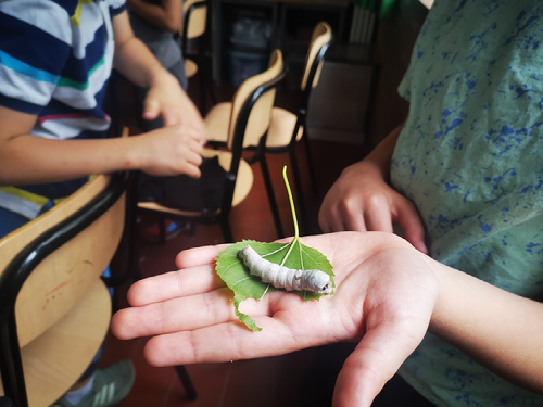 "E' stato bellissimo: ad ogni intervallo tanti bimbi, maestre e collaboratori della scuola venivano da noi in terza per vedere i bachi da seta! Li hanno presi in mano senza problemi, li hanno coccolati, li hanno curati. Per tutto maggio è stato così. C'era sempre qualcuno che veniva a salutare i bachi. Abbiamo scoperto la brucoterapia...!?"
