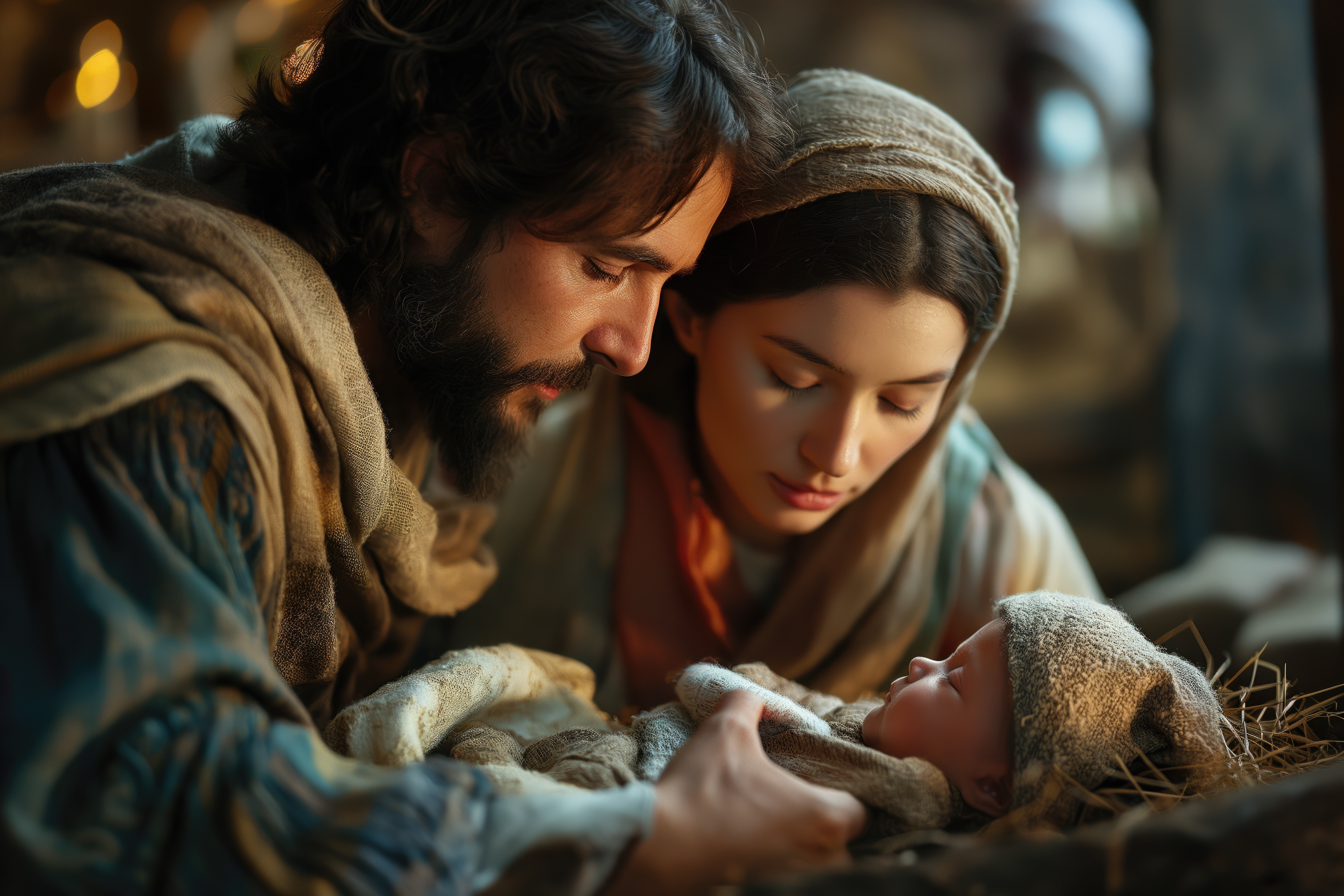 Creato con immagini di jchizhe - "Nativity scene. Christian Christmas concept. Birth of Jesus Christ. Wooden manger in dark blue night. Banner, copy space. Jesus is reason for season. Salvation, Messiah, Emmanuel, God with us, hope" • Anna - "Loving Mary and Joseph in traditional attire gently embracing newborn Jesus in rustic setting. Family bond, nativity scene, parental love, heritage celebration, cultural tradition." • vetre - "Birth of Jesus. Christmas nativity scene. Manager and star."