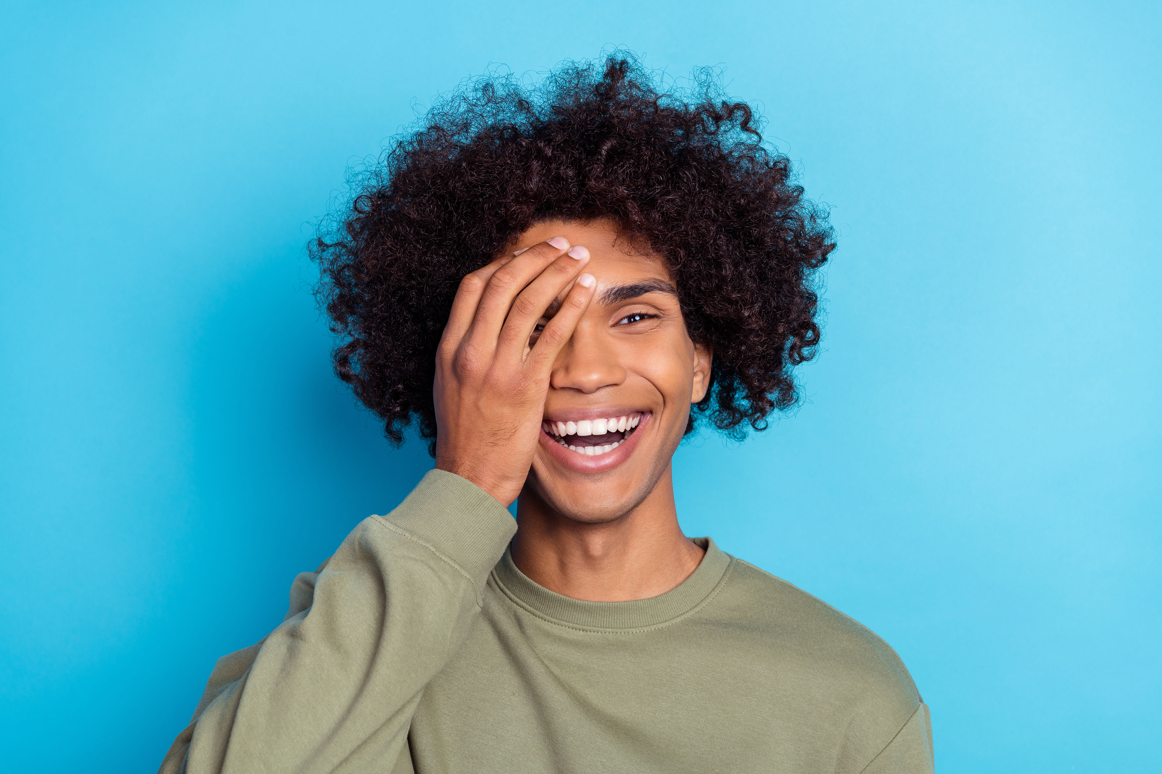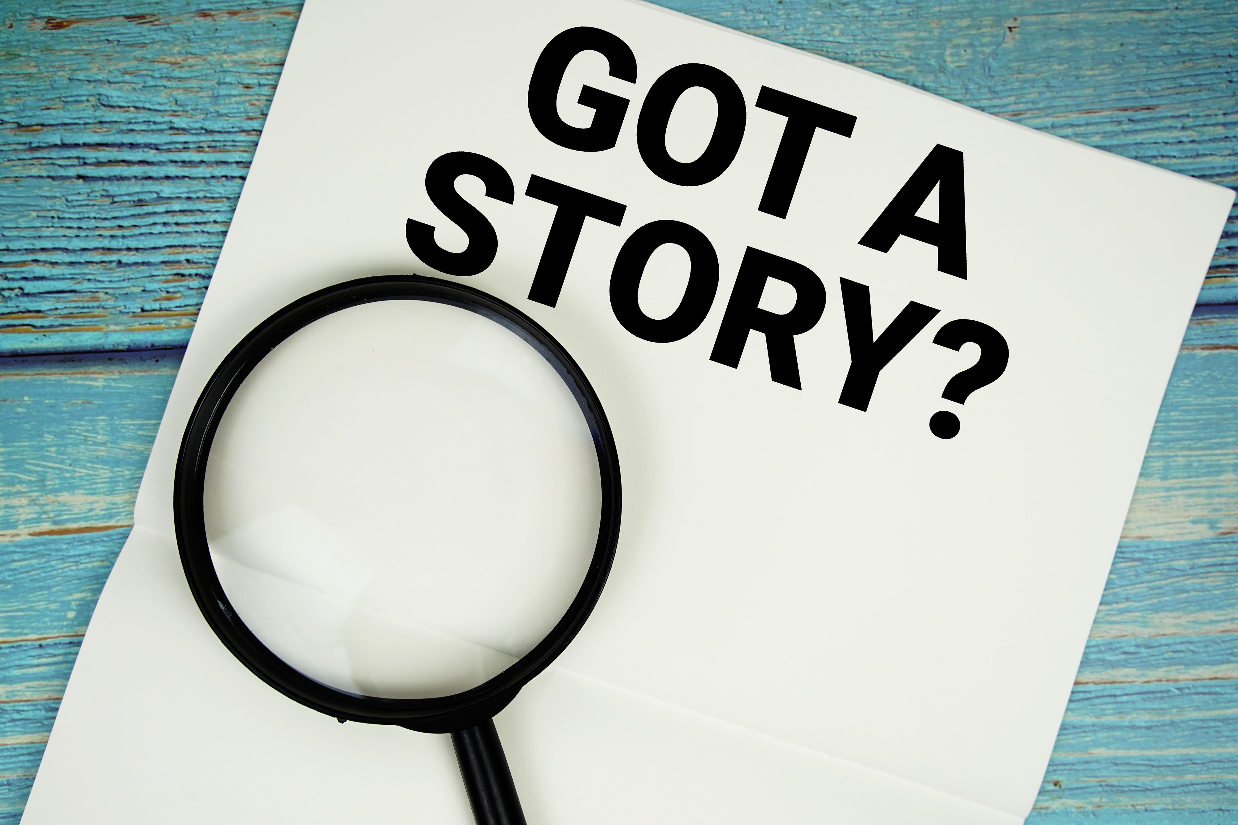 Created with images by deagreez - "Photo of young cheerful man have fun laughing humor hand touch face isolated over blue color background" • may1985 - "Got A Story?,text written on notepad with magnifying glass flat lay on wooden background" • alexandre zveiger - "Letter p on white background" • Jon Schulte - "Composition Note Book" • paffy - "Two female hands holding red polygonal paper heart shape" • webkinzluva1598 - "bubbles rainbow macro"