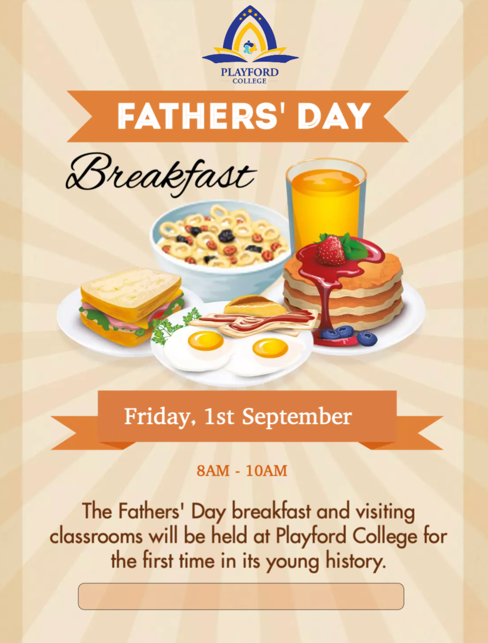Playford College is welcoming all fathers or father figures to a free breakfast on Friday, September 1st. For a variety of reasons some fathers may not be available on this morning and so students can invite a grandpa, older brother, uncle or another male to come instead.