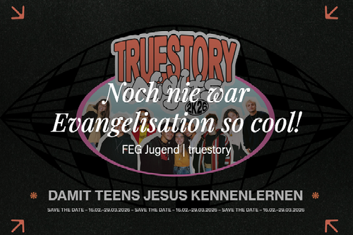 An diesem Aufbruch möchten wir teilhaben. Deshalb truestory. Nun endlich zur Frage: Was ist das eigentlich, diese «wahre Geschichte»? Was früher als «Jesus House» bekannt war, wird 2026 zum zweiten Mal als «truestory Nights» durchgeführt: Ein innovatives Eventformat für Jugendliche, die sich mit zentralen Fragen des Lebens und des Glaubens beschäftigen. Kirchen erhalten ein Veranstaltungspaket für sechs Abende, die so gestaltet sind, dass auch kirchenferne Teens Jesus begegnen können. Der Aktionszeitraum läuft vom 16. Februar bis zum 29. März 2026.
