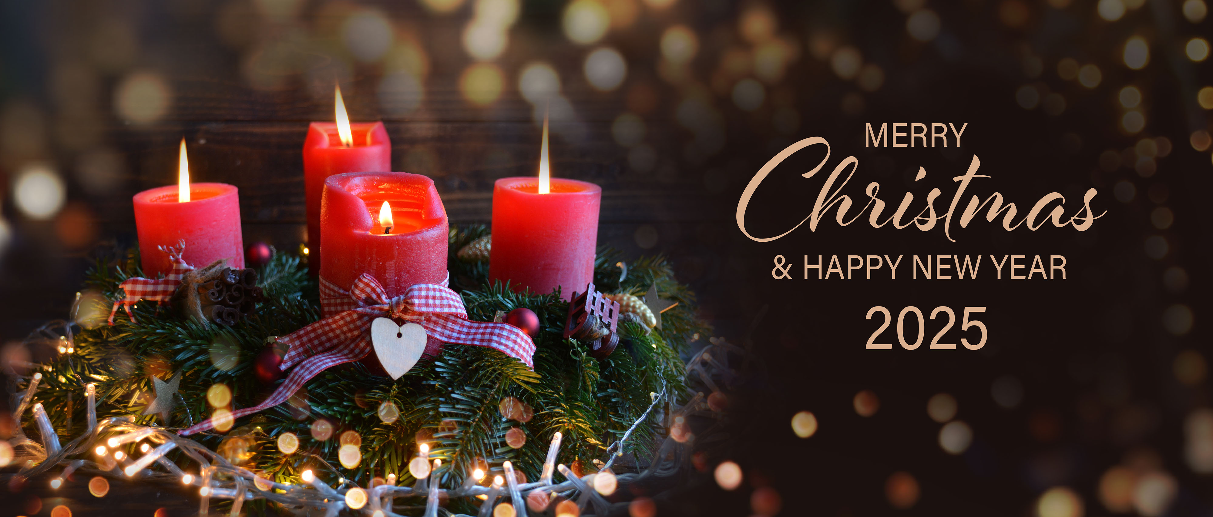Created with images by Irina - "Lit Advent wreath on wooden table, showcasing four candles with evergreen boughs and pine cones. Advent wreath adds beauty to holiday display, reflecting traditions and Christmas anticipation," • Лилия Захарчук - "A bright star illuminating the night sky, shining over the manger scene with Mary, Joseph, and baby Jesus." • Igor Tichonow - "Christmas tree background with snowflakes. Greeting Card and Happy New Year Invitation." • S.H.exclusiv - "Christmas Card - Merry Christmas and Happy New Year 2025 - Advent wreath with four red burning candles and magical bokeh lights - banner, header, xmas greetings - fourth advent"