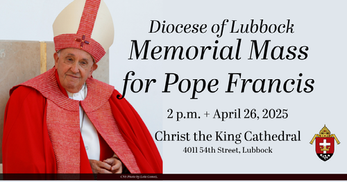 LUBBOCK— Most Rev. Robert Coerver, Bishop of Lubbock, will celebrate a Memorial Mass for Pope Francis at Christ the King Cathedral in Lubbock on Saturday, April 26, at 2 p.m.