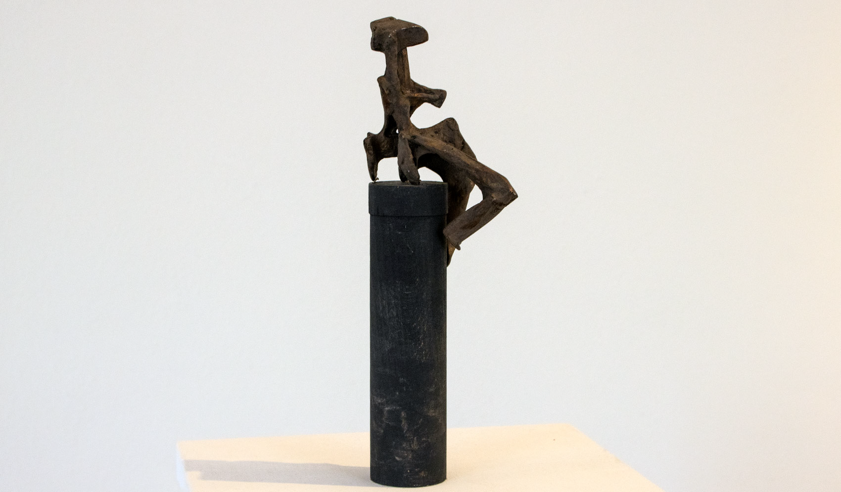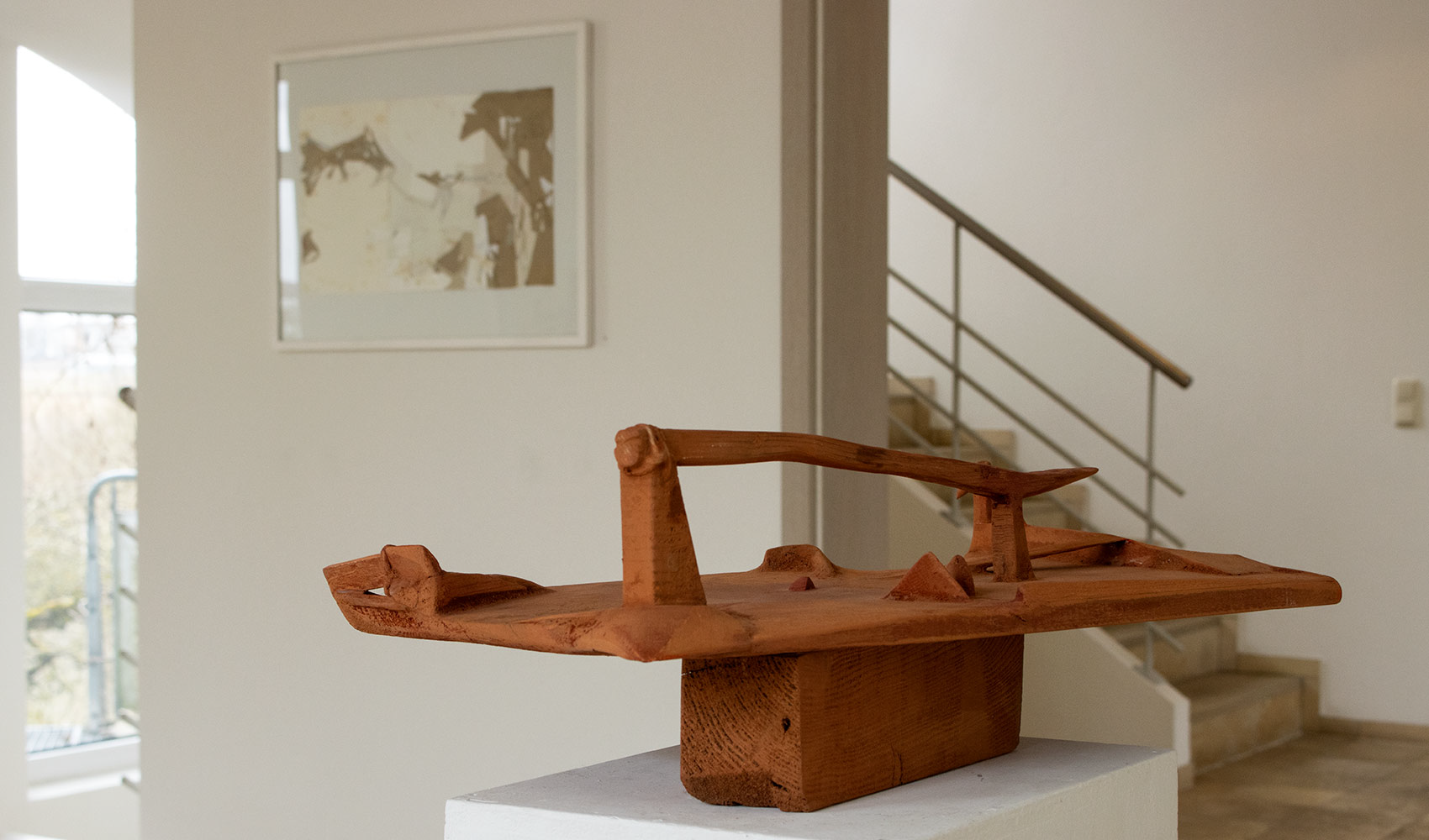 „Zwinge zu Morgenstern“ heißt die Skulptur, die auf der Einladung zu dieser Ausstellung abgebildet ist. Man erkennt die beiden Gegenstände nicht gleich, aber da der Titel es sagt, eben doch: Die beiden Zungen der Zwinge hängen vom oberen Balken herab, und der nur zweizackige Morgenstern stößt von rechts ins Bild. Beide, Zwinge und Morgenstern, erscheinen nur als Relikte ihrer ursprünglichen Gestalt, sie sind Teile eines eigenwillig anmutenden Objektes. Es ist kantig und gelenkig, ein wenig fragil vielleicht, und greift nicht in den Raum aus, sondern schließt sich nach Innen ab, so dass in der Mitte ein Hof entsteht. Bewegung ist stillgestellt.