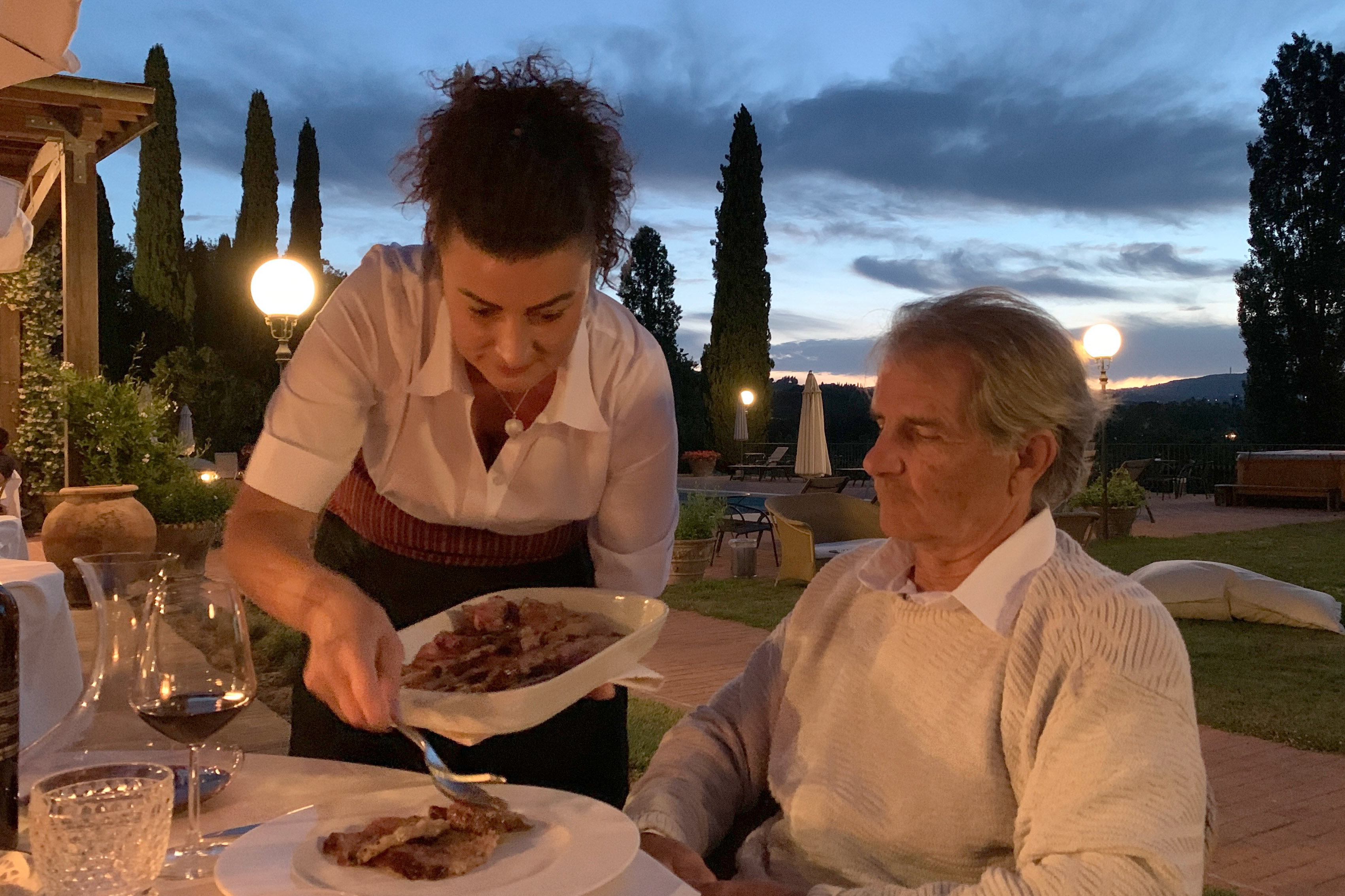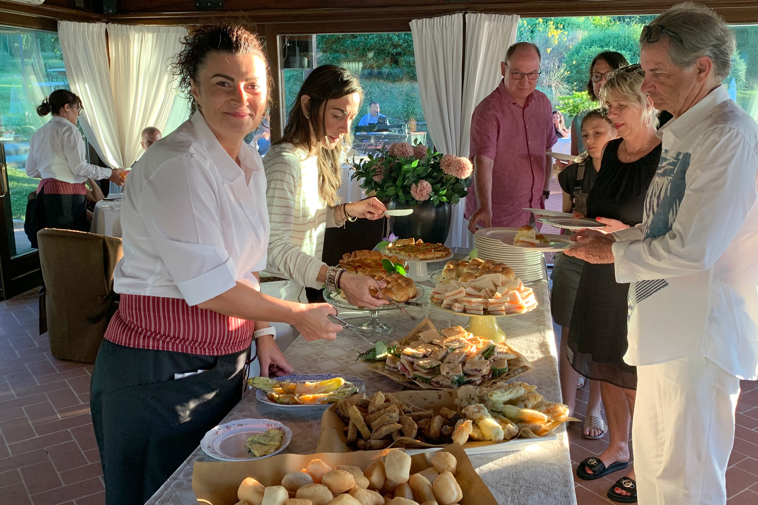 Le samedi étant le jour de l’apéritif de bienvenue, il n’y a pas que des boissons mais un incroyable buffet d’antipasti, tous meilleurs les uns que les autres. Camelia, polyvalente, aidée de Francesca venue en renfort. Aurons-nous encore faim pour la bistecca alla Fiorentina ?