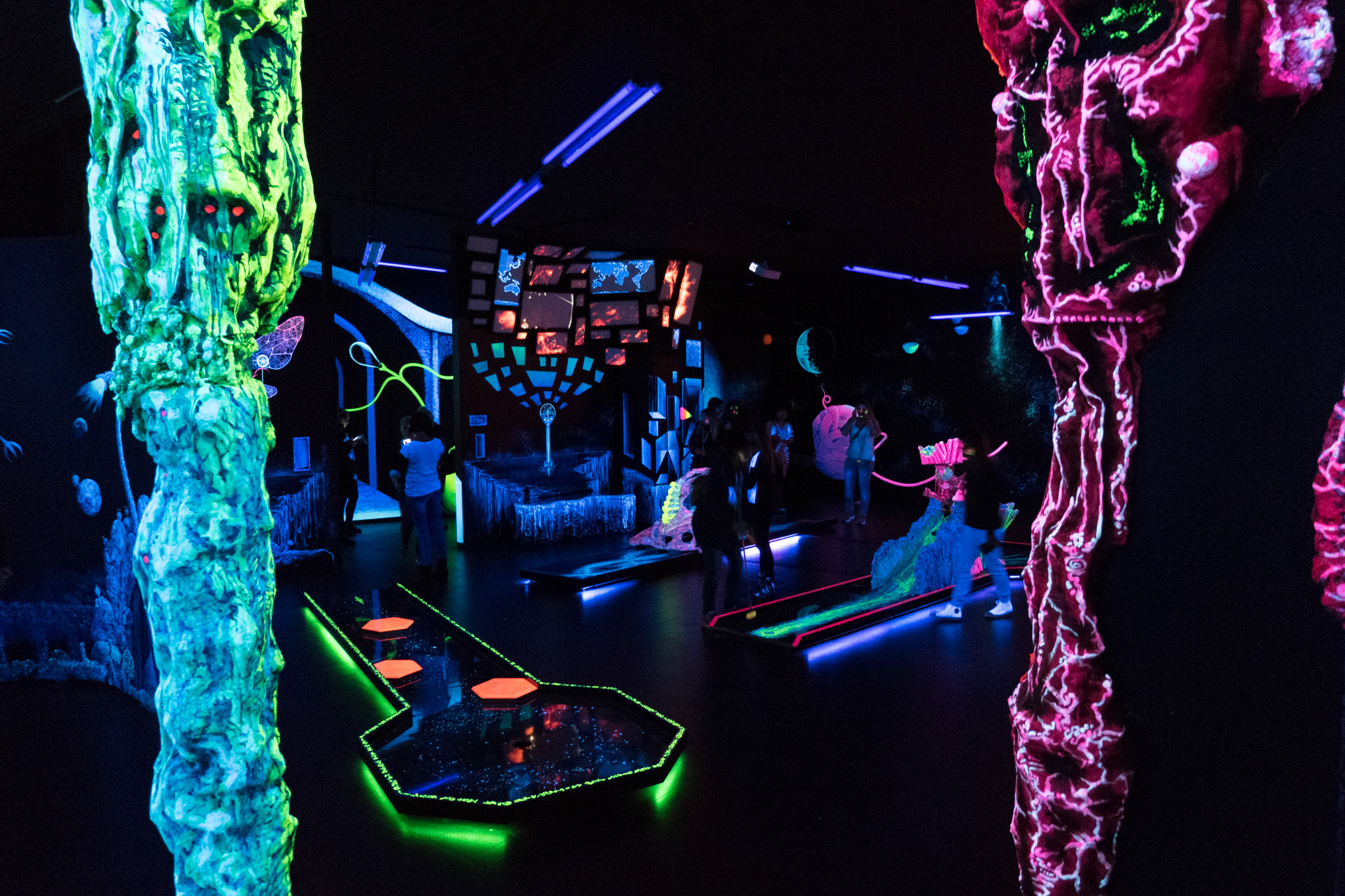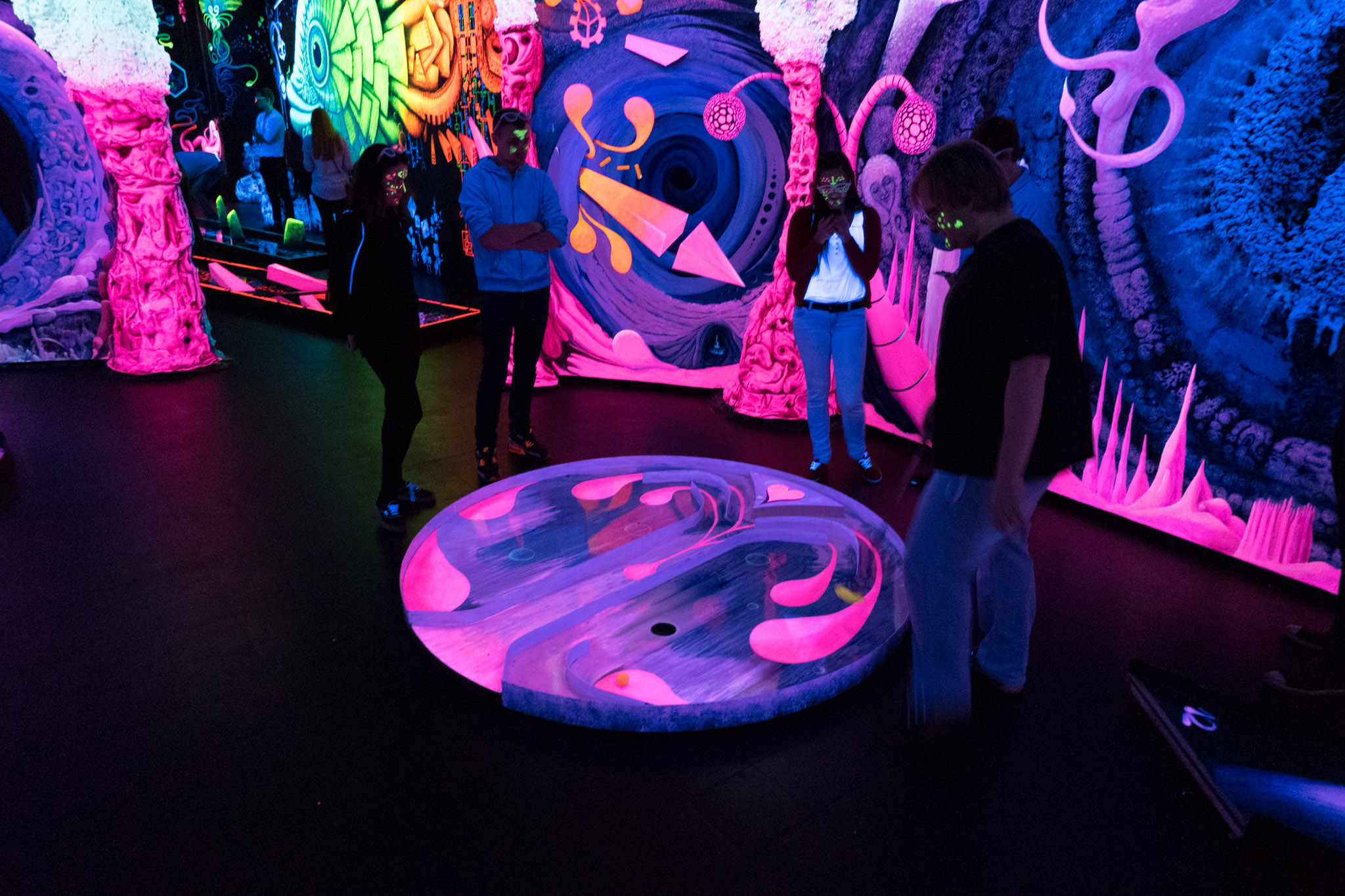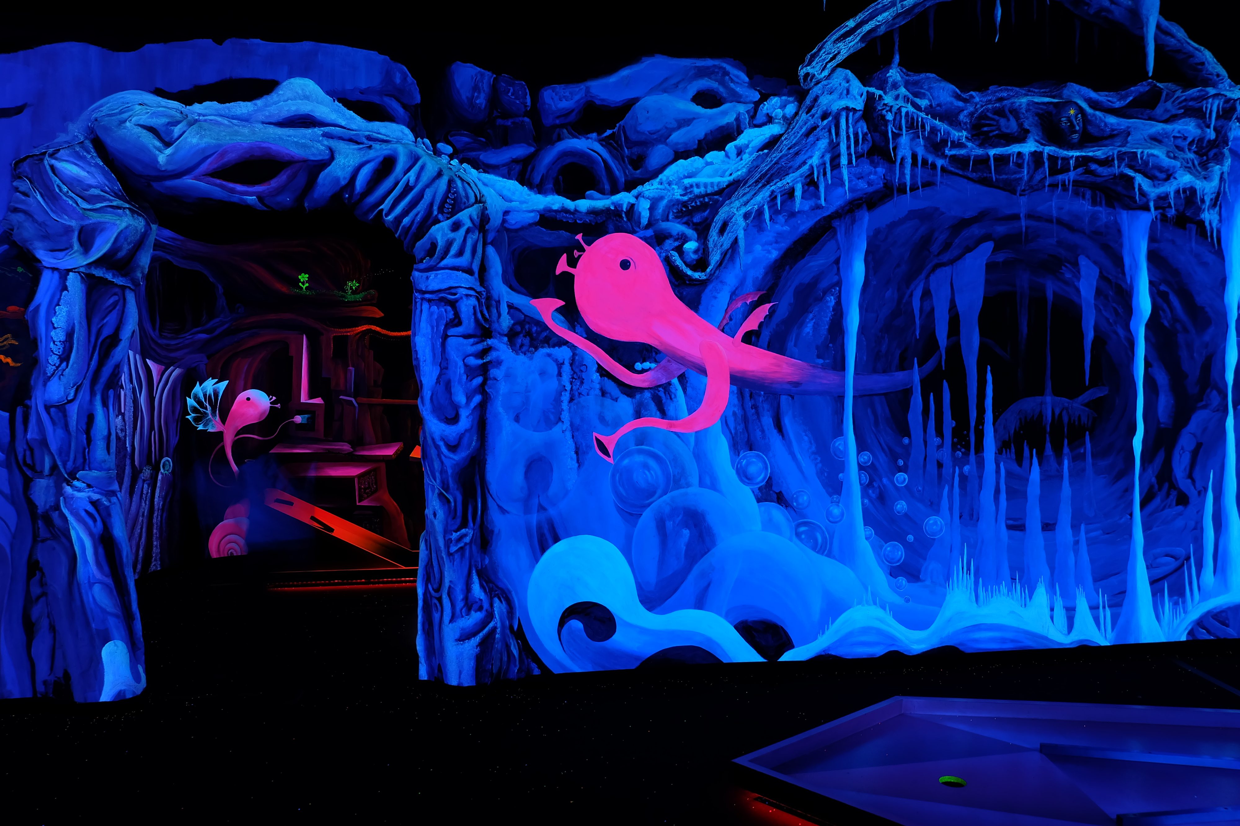 Ein in 3D-Technik handgemaltes, Gesamtkunstwerk begleitet euch auf durch den Schwarzlicht Minigolf Parcour mit 18 interaktiven Bahnen.